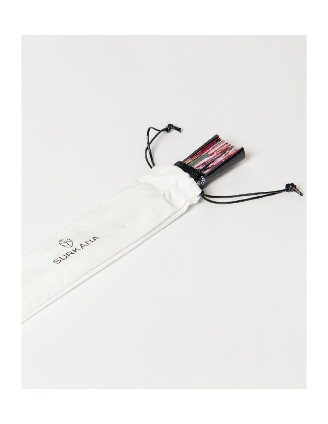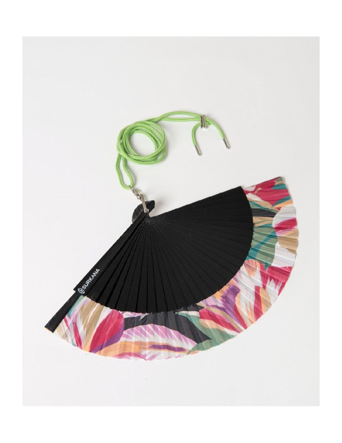 Abanico estampado confeccionado con varillas estructuradas. Diseño plegable con cordón para colgar. Abanico estampado plegable