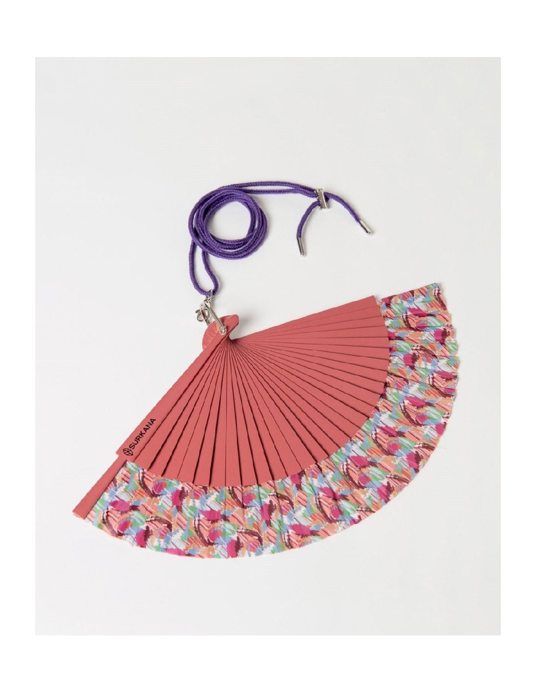 Abanico estampado confeccionado con varillas estructuradas. Diseño plegable con cordón para colgar. Abanico estampado plegable