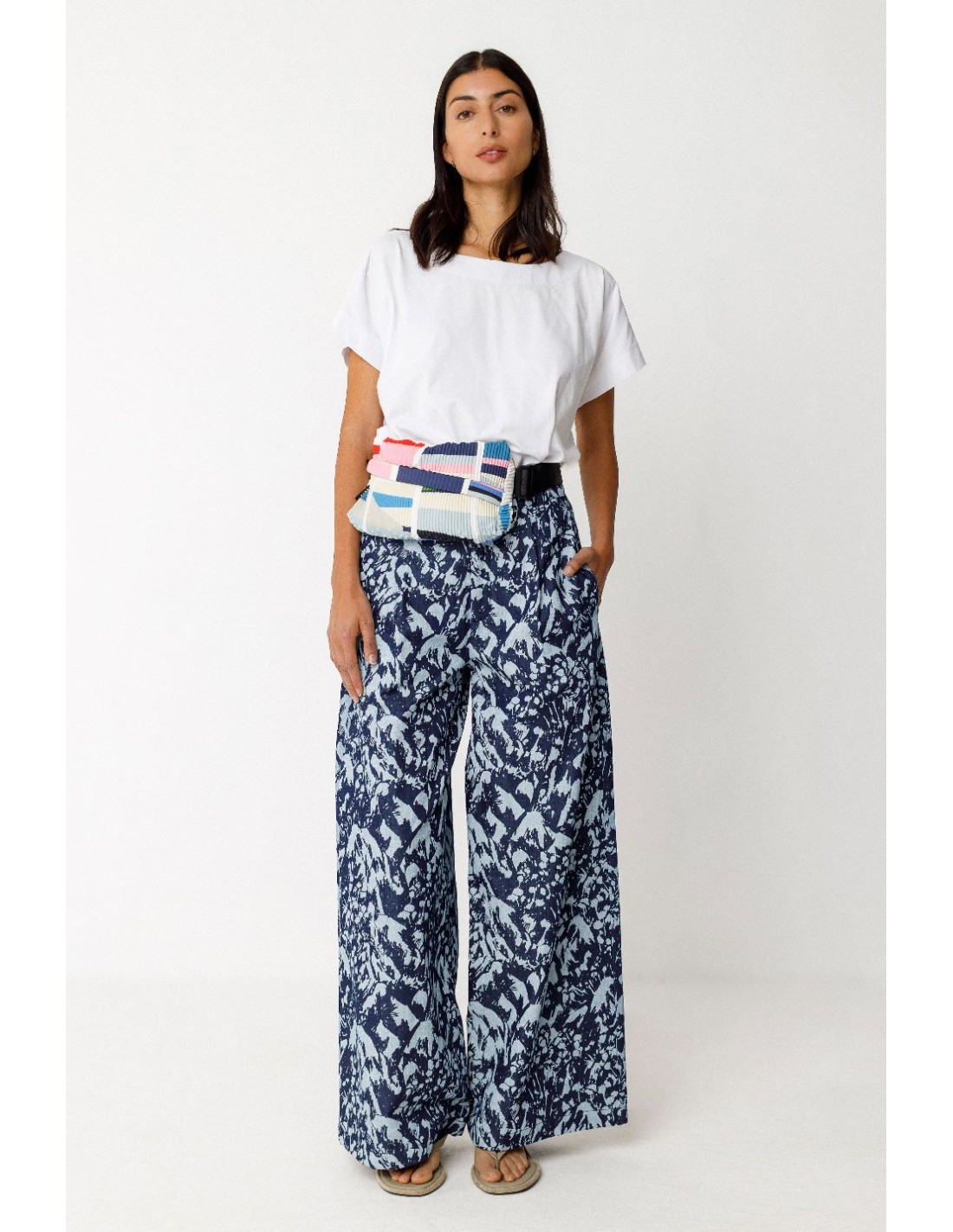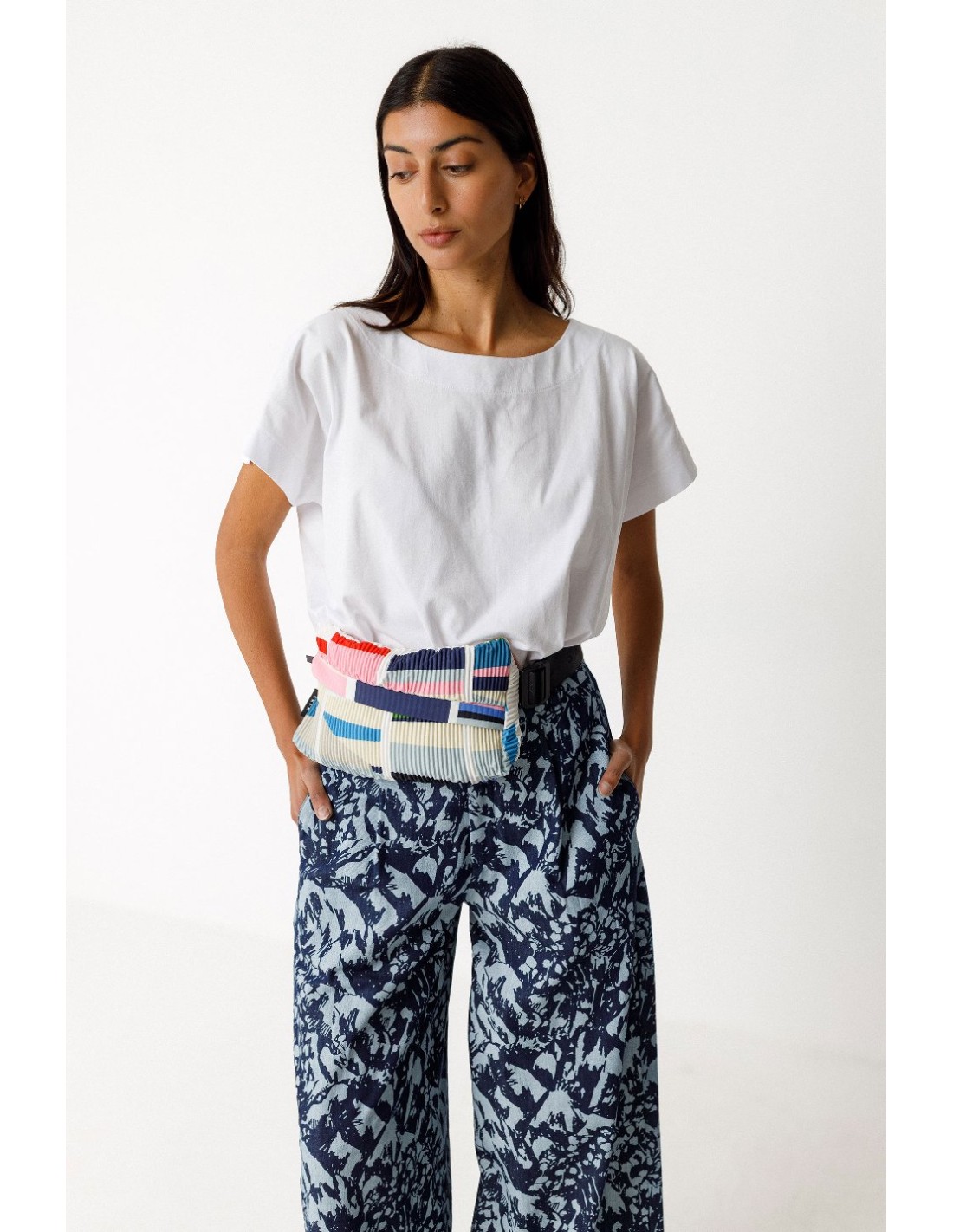 Bolso riñonera cilíndrico de tela plisada al bies. Cremallera oculta, correa de nailon ajustable y cierre a presión. Colaboración con el artista Grems. Medidas: 25,5 x 14 x 5 cm.