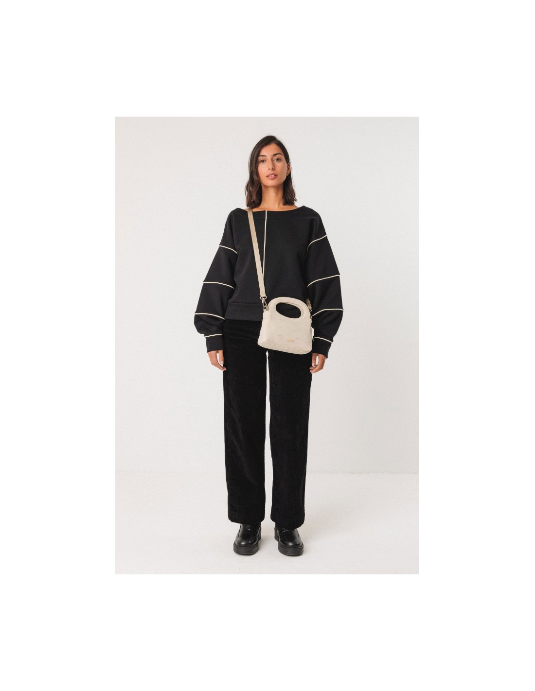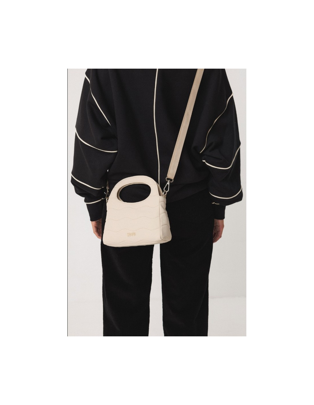 Bolso cuadrado pequeño que se puede llevar en bandolera o del asa. Cierre magnético y bolsillo interior. Medidas: 20 x 21 x 8 cm.