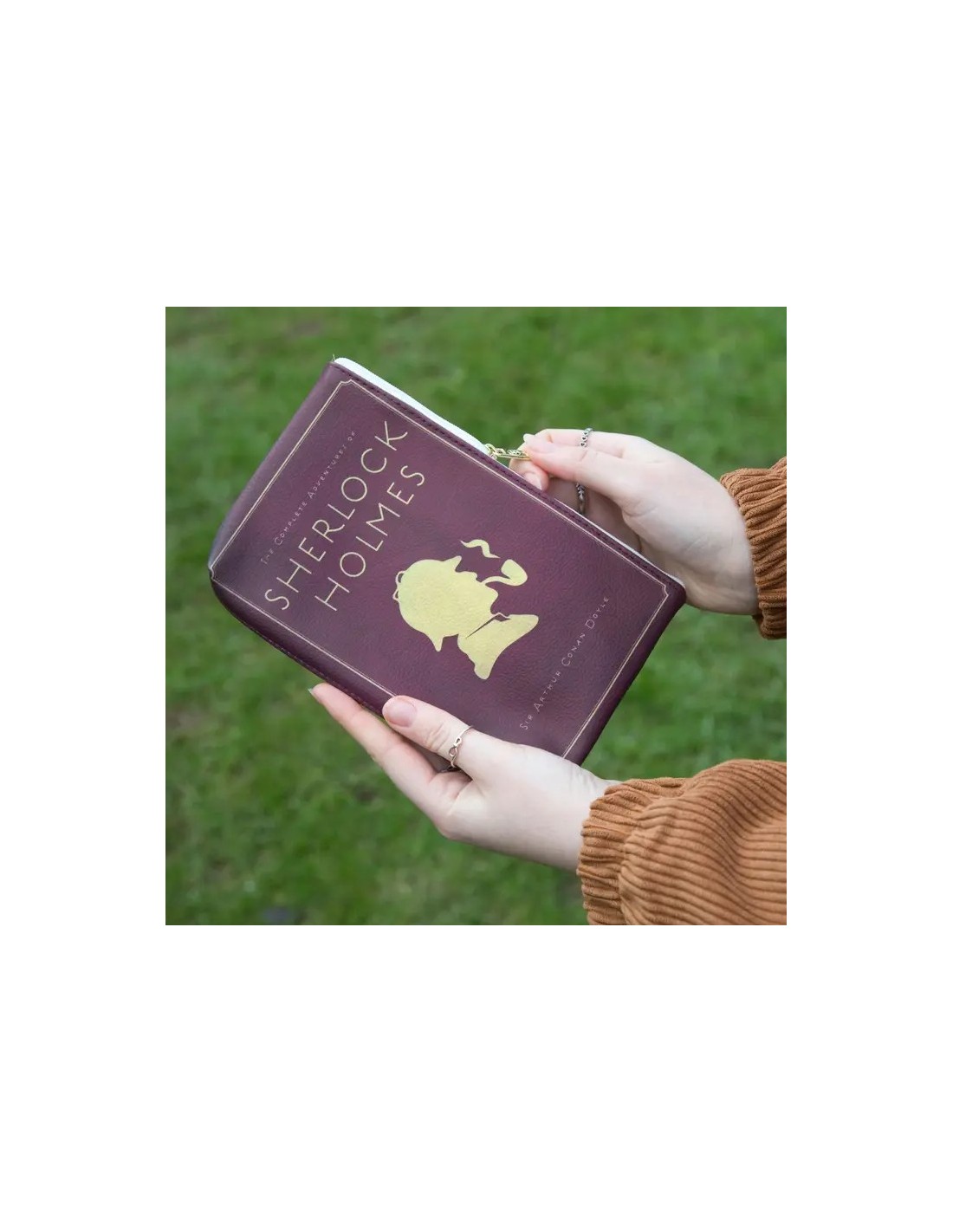 Este fascinante monedero presenta un fondo burdeos tradicional detrás de una icónica silueta de Sherlock Holmes, completa con gorra de cazador y pipa. La parte trasera del bolso está decorada con los doce títulos de los relatos cortos de Sherlock Holmes.