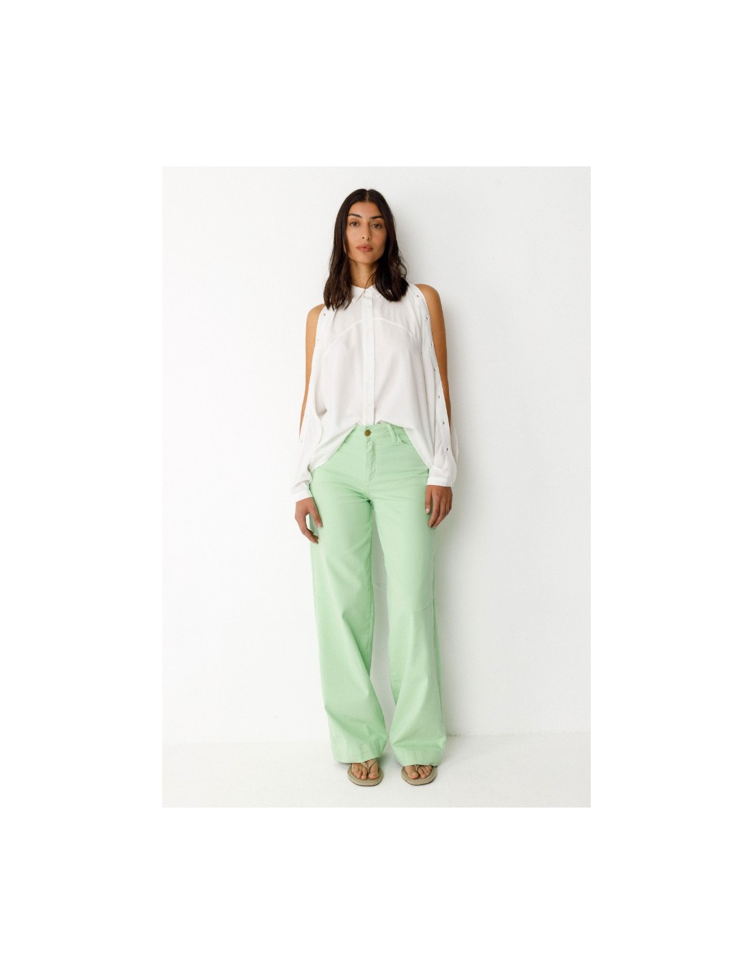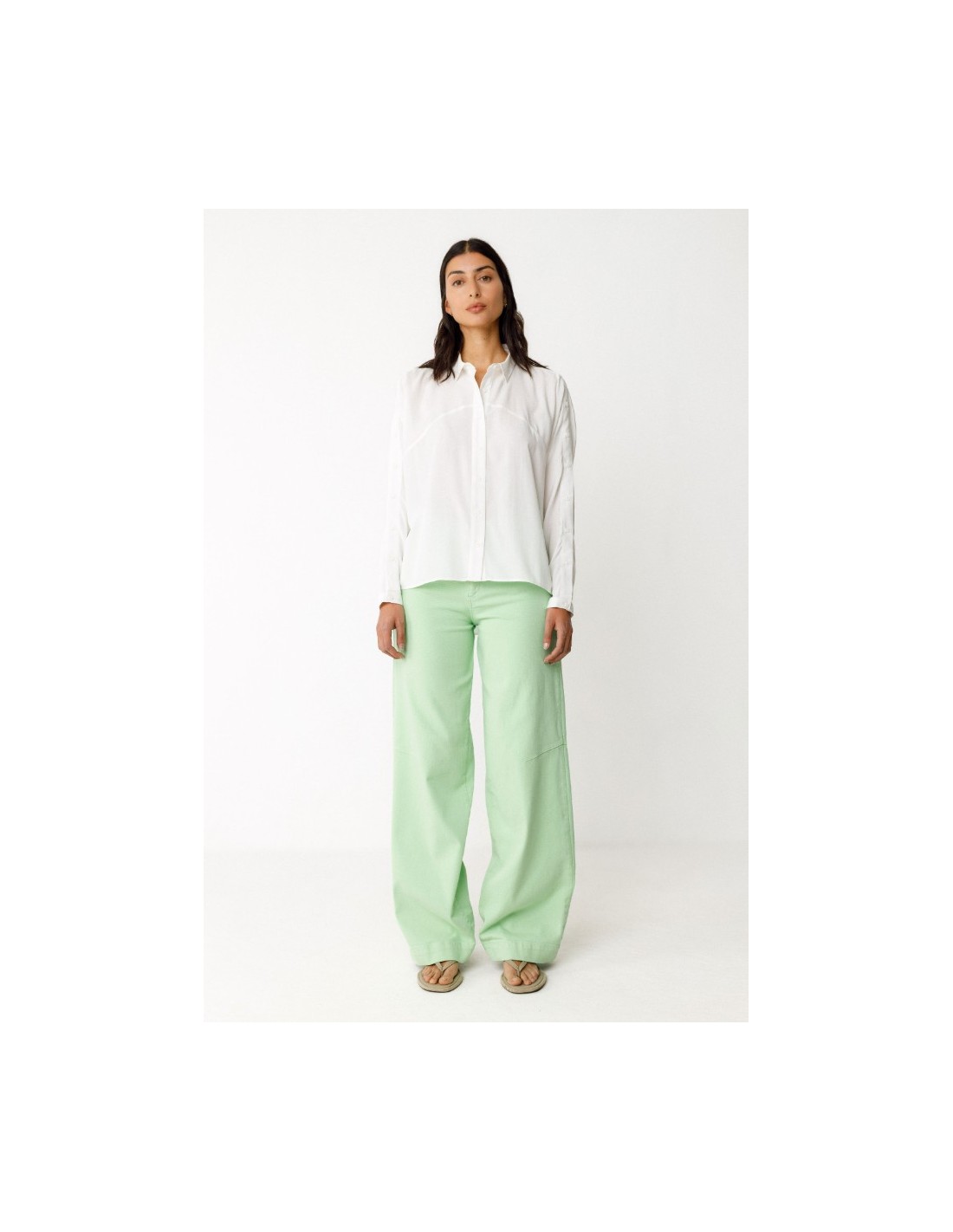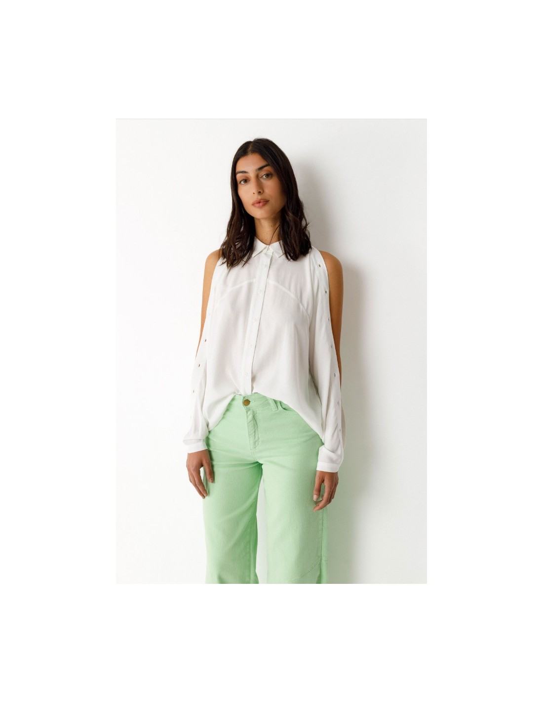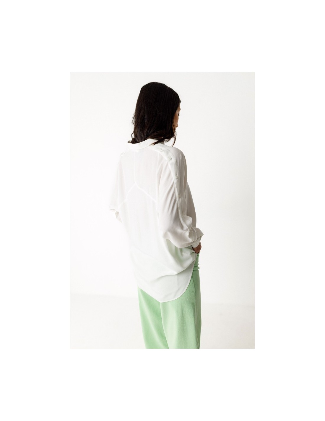 Camisa de manga larga con cuello clásico, cierre delantero abotonado y corte redondeado más largo por detrás. Se pueden abrir los botones que hay a lo largo de toda la manga para enseñar el brazo.