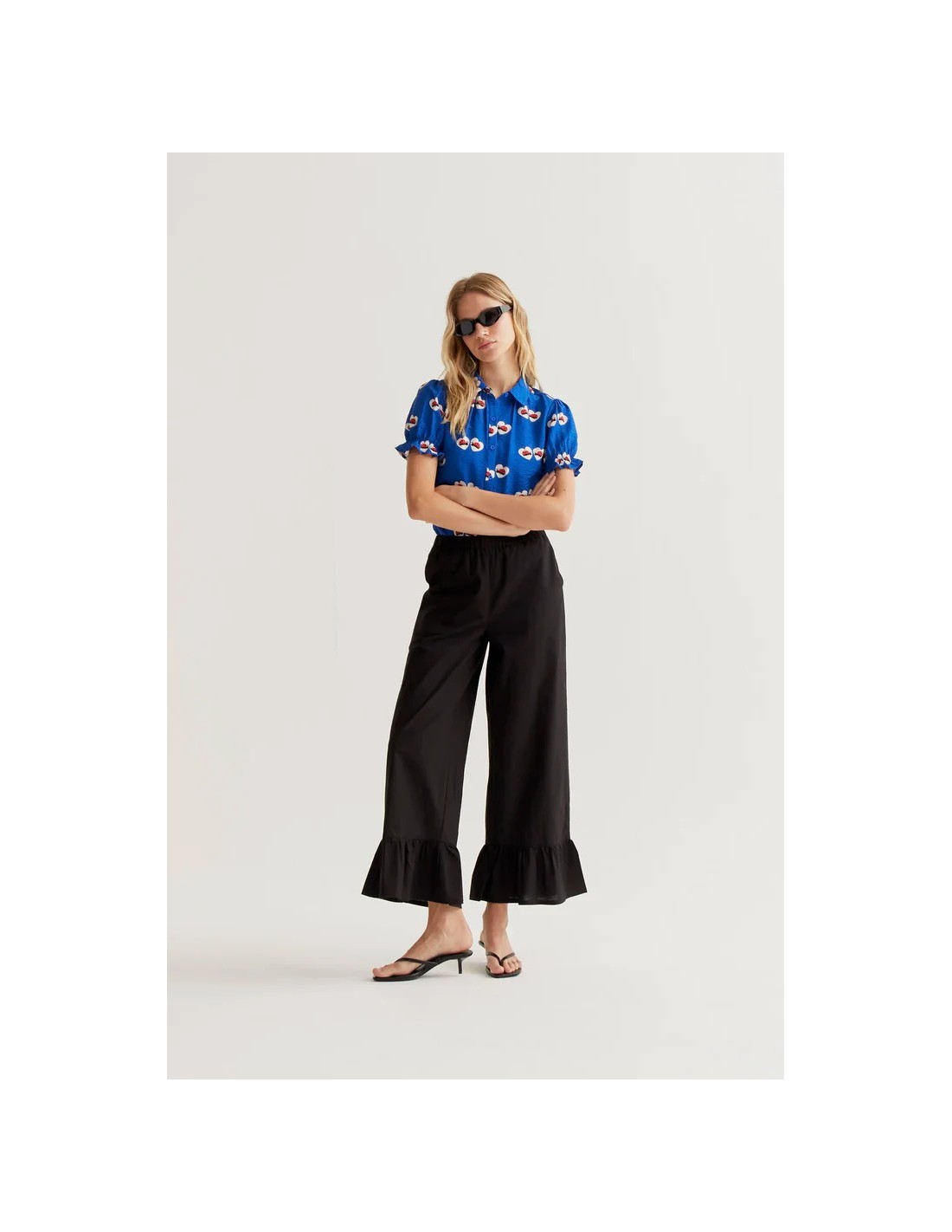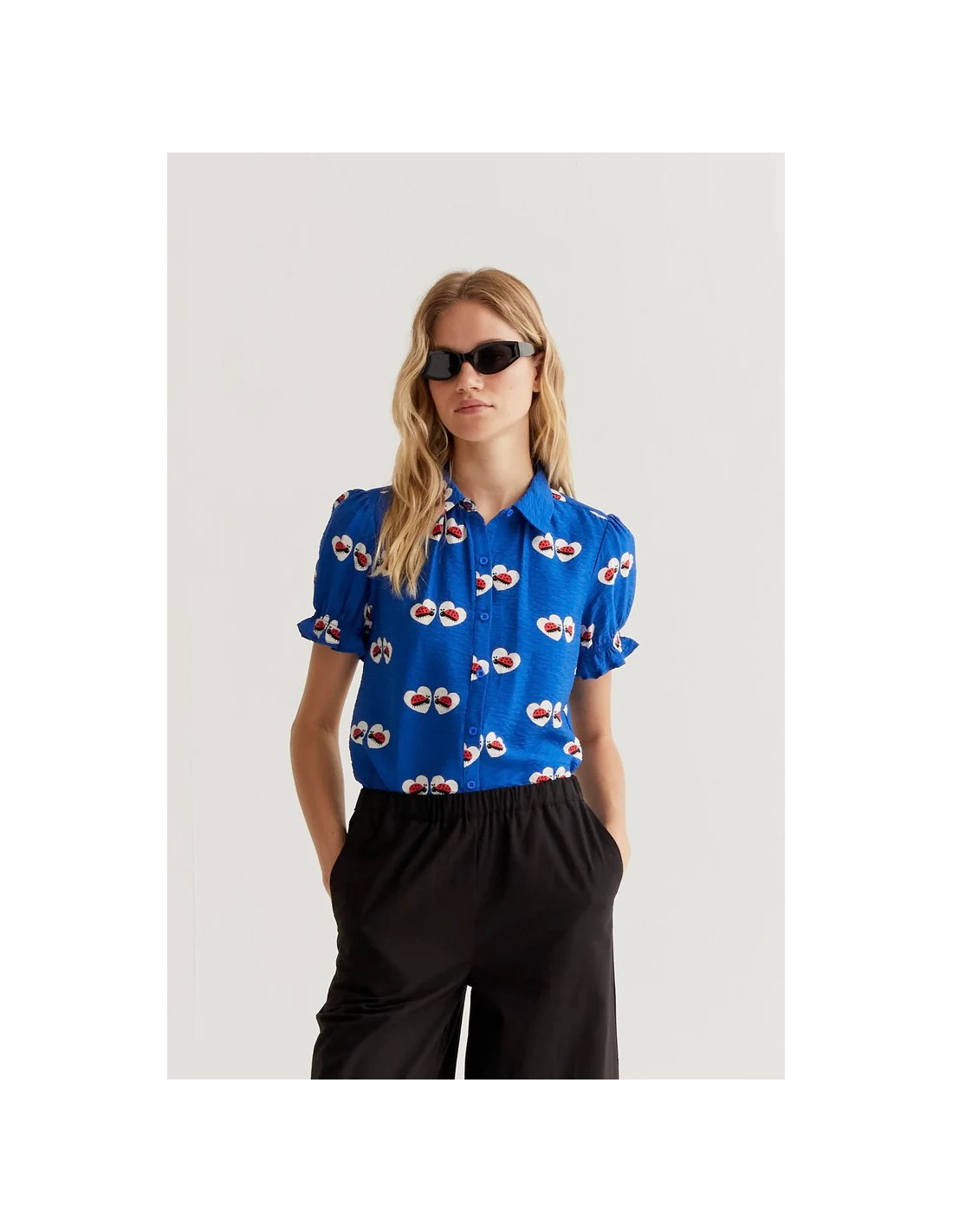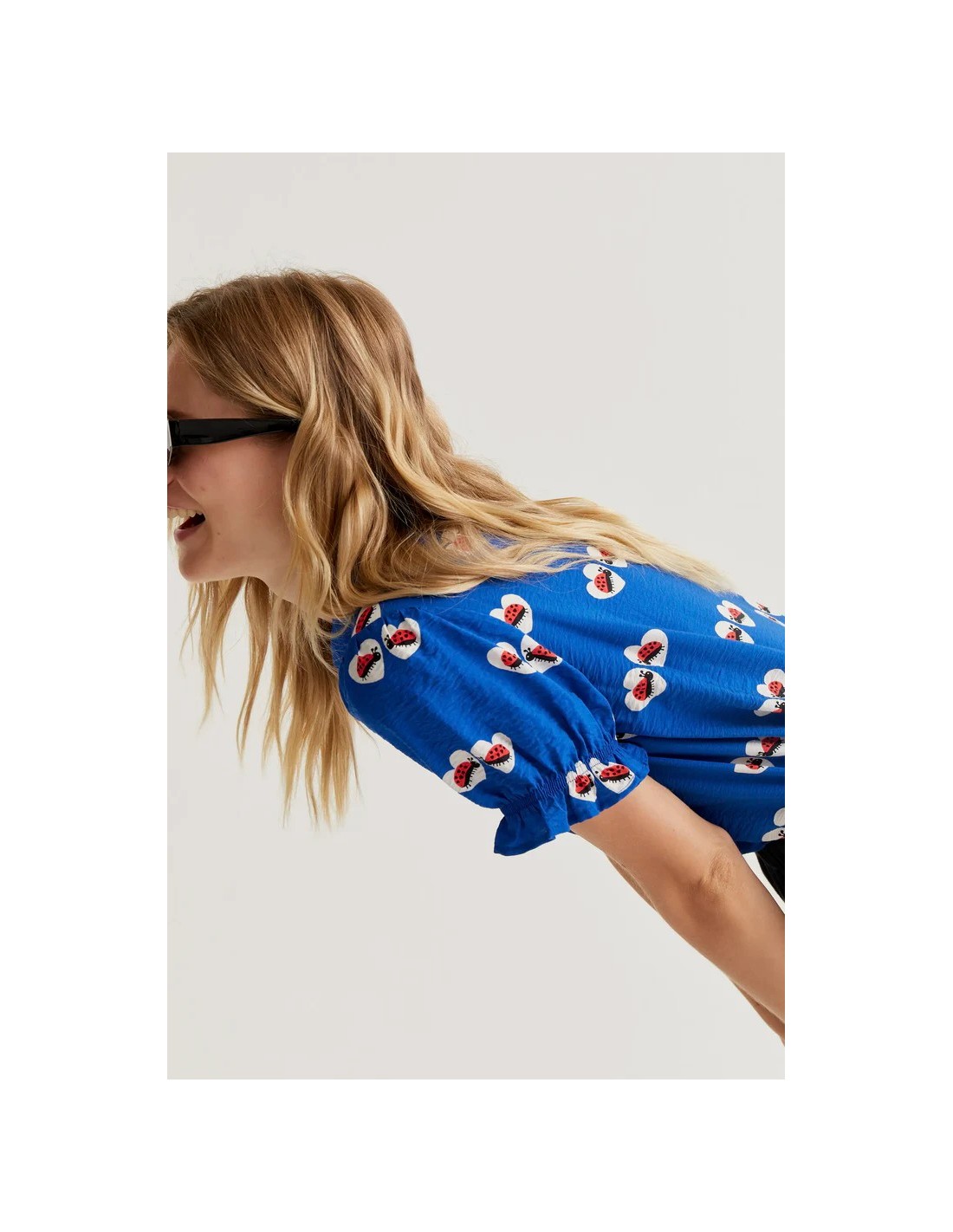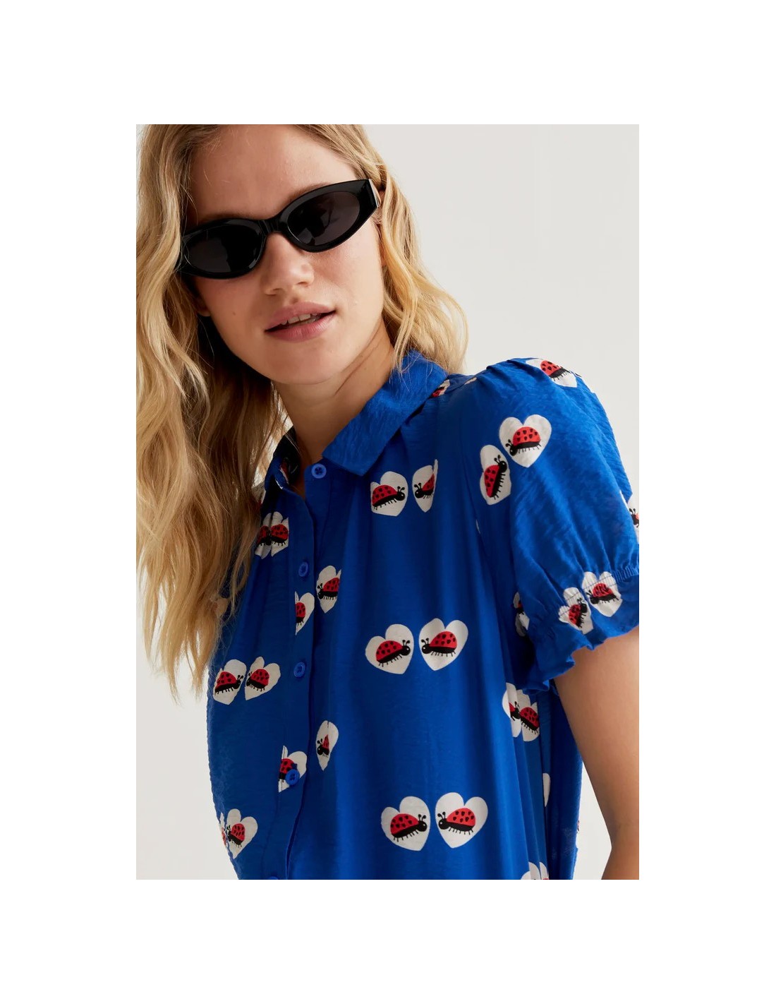Camisa de tejido crepé ligero con estampado coccinella. Cuello con solapa y manga corta ligeramente abullonada con volante elástico ajustadable. Cierre frontal con botones azul. La modelo mide 177 cm y lleva la talla S.