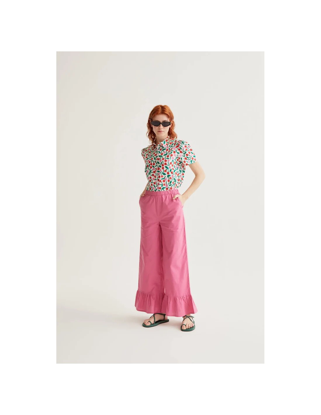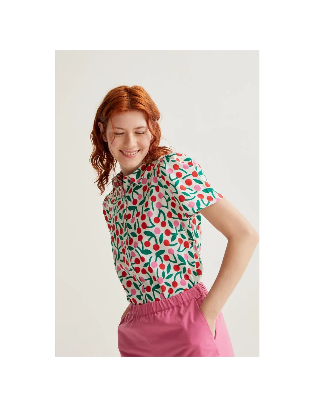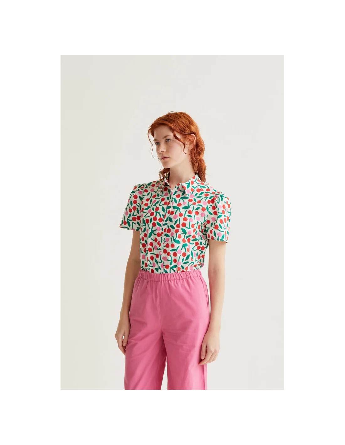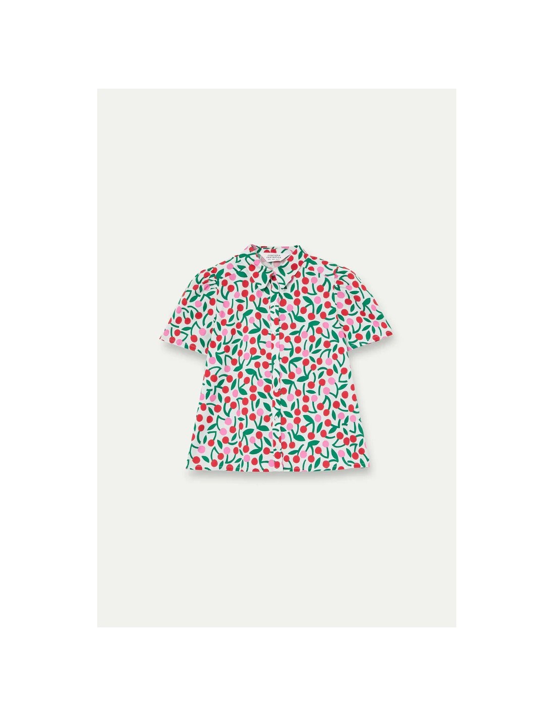 Camisa de tejido 100% algodón con estampado guinda. Cuello solapa y manga corta ligeramente abullonada. Cierre frontal con botones blancos. La modelo mide 175 cm y lleva la talla S.