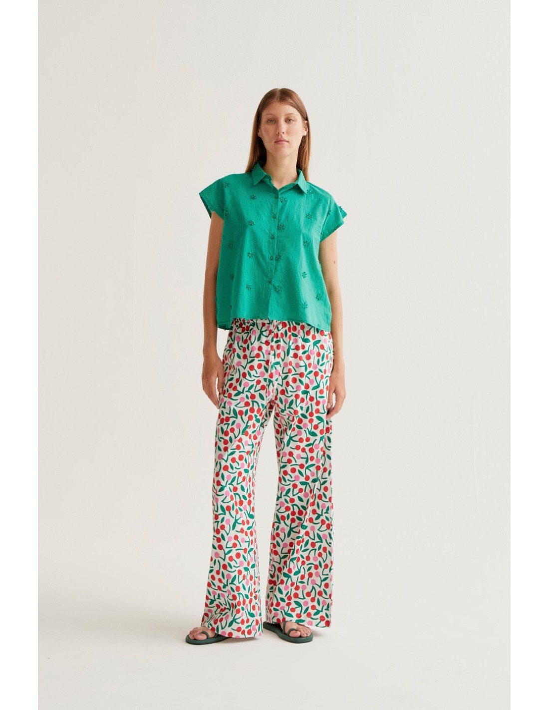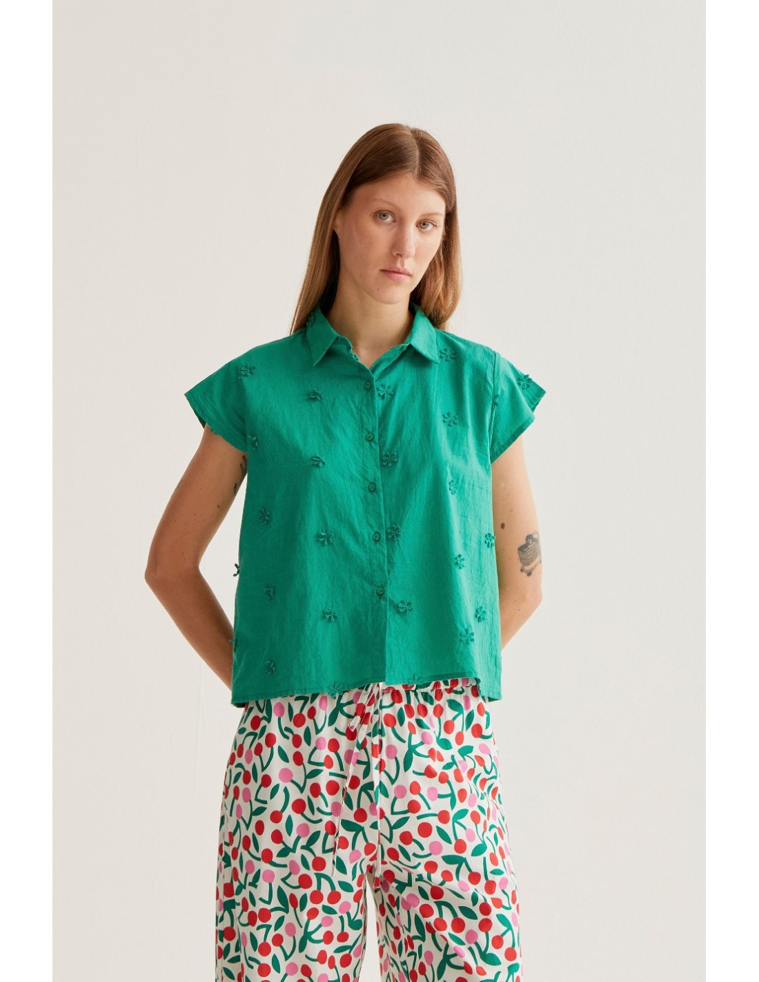 Camisa con tejido 100% algodón de color verde. Cuello solapa y manga corta. Cierre frontal con botones de color verde. Detalle de flores bordadas. La modelo mide 177 cm y lleva la talla S.