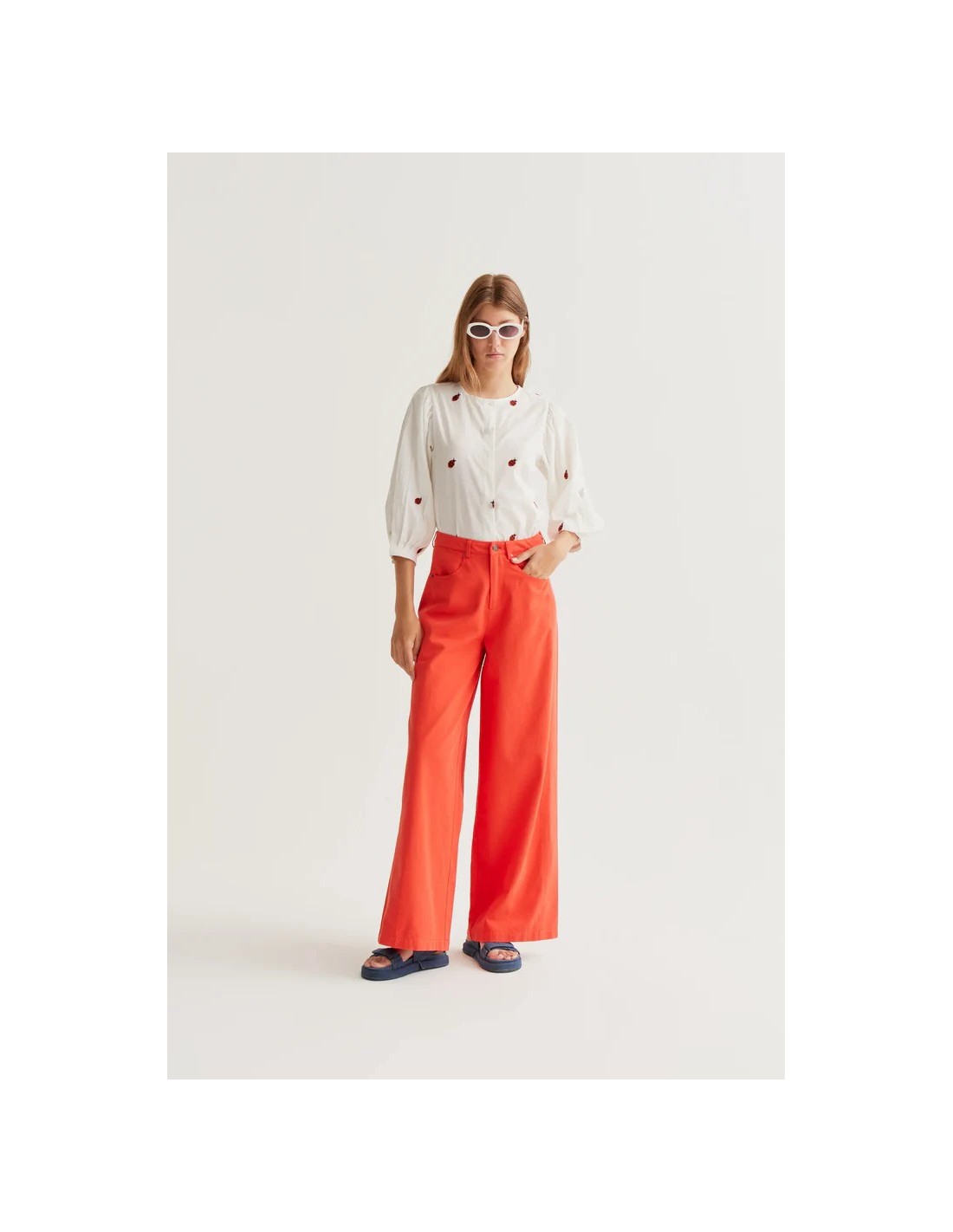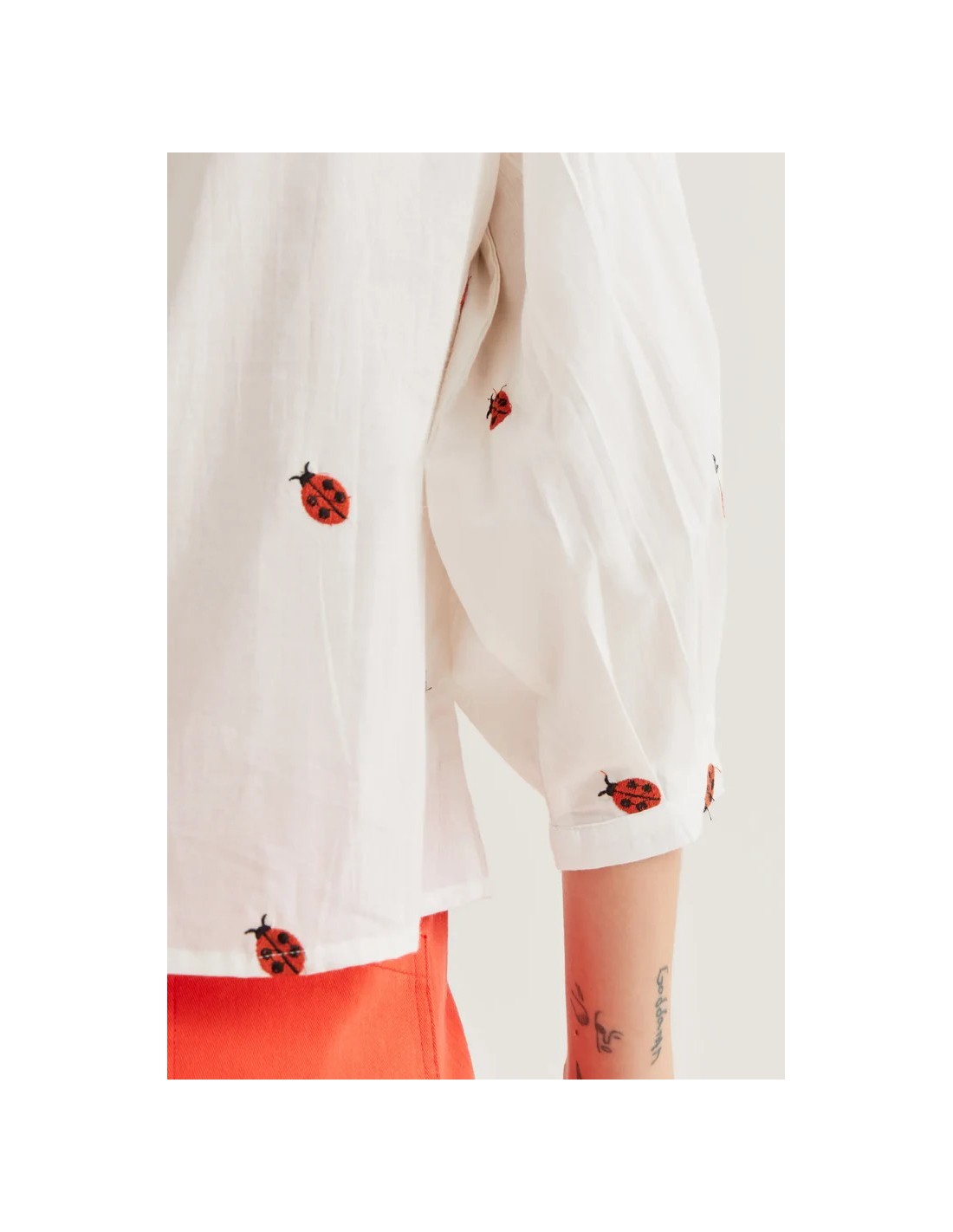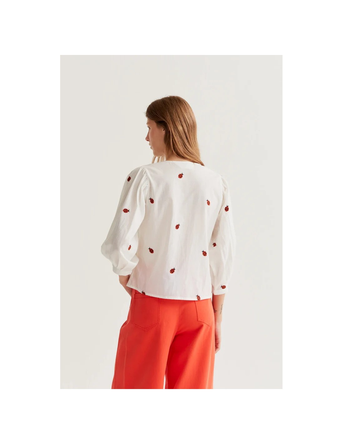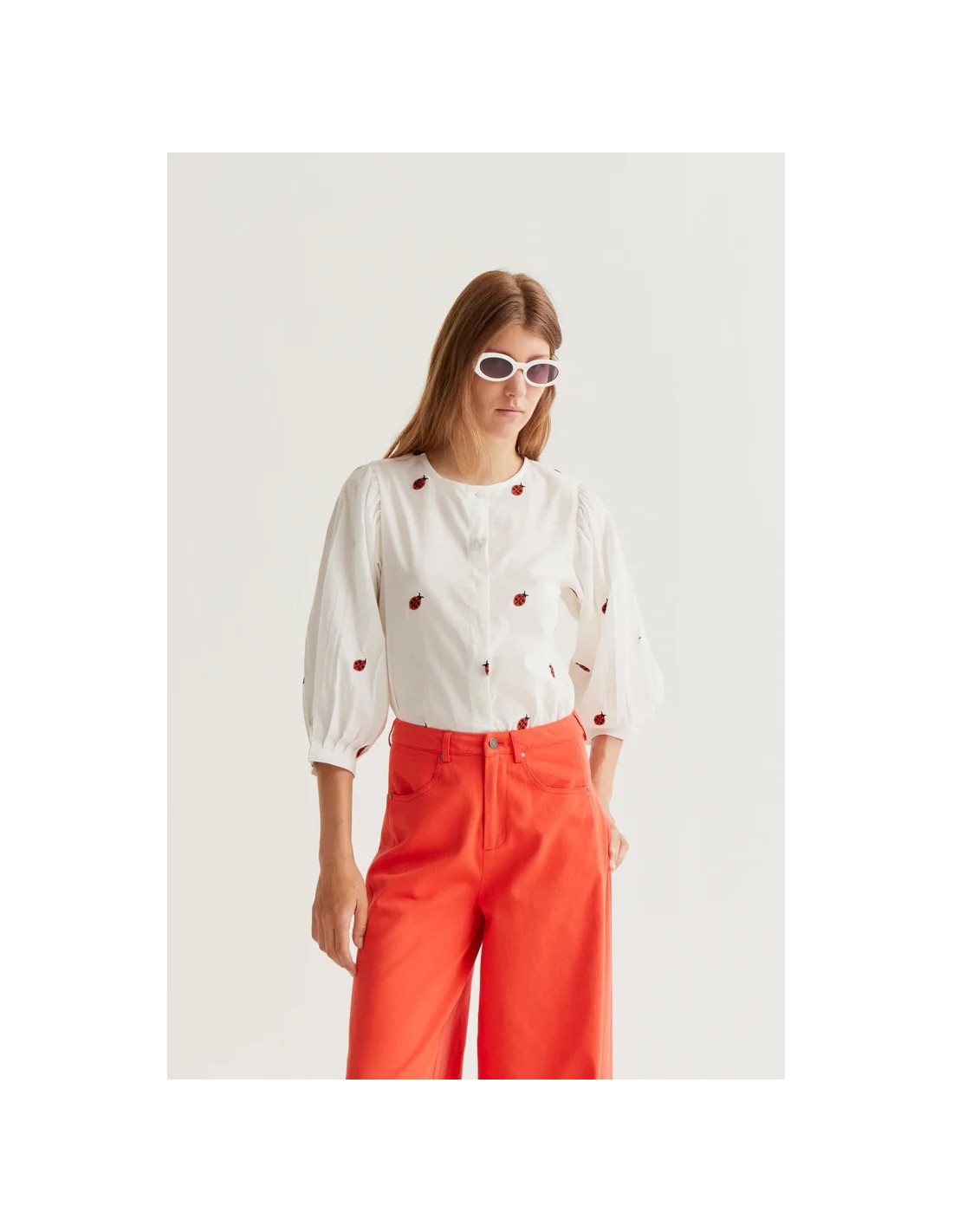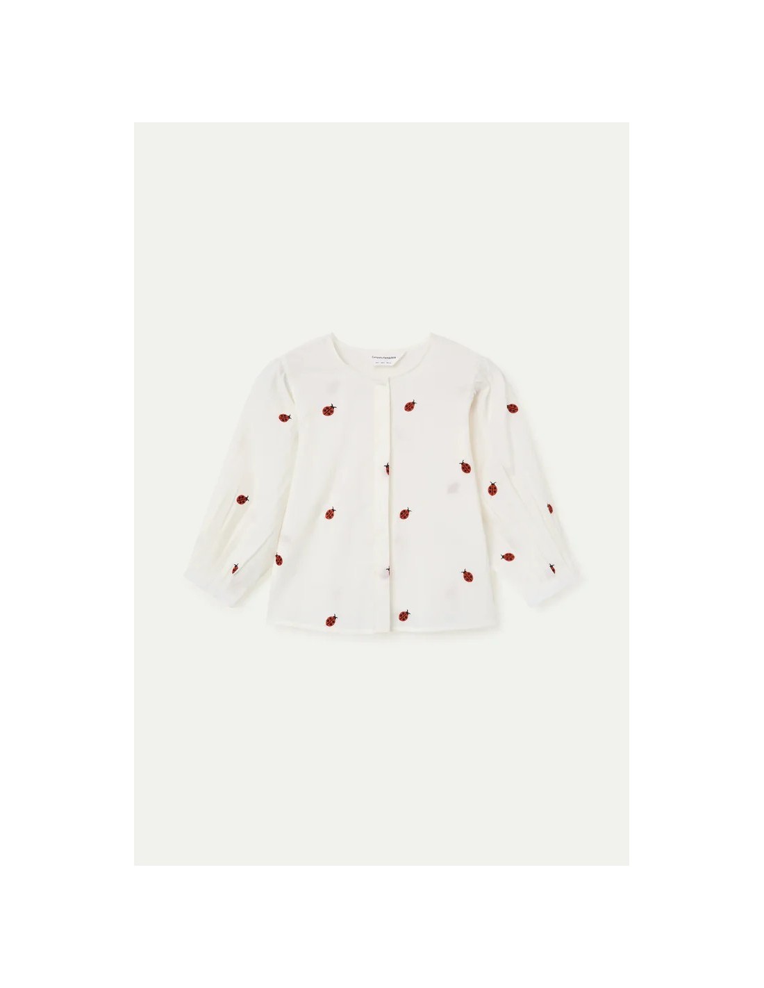 Camisa de tejido 100% algodón de color blanco con estampado ladybugs. Cuello redondo y manga larga ligeramente abullonada. Cierre frontal con botones de color blanco. La modelo mide 177 cm y lleva la talla S.