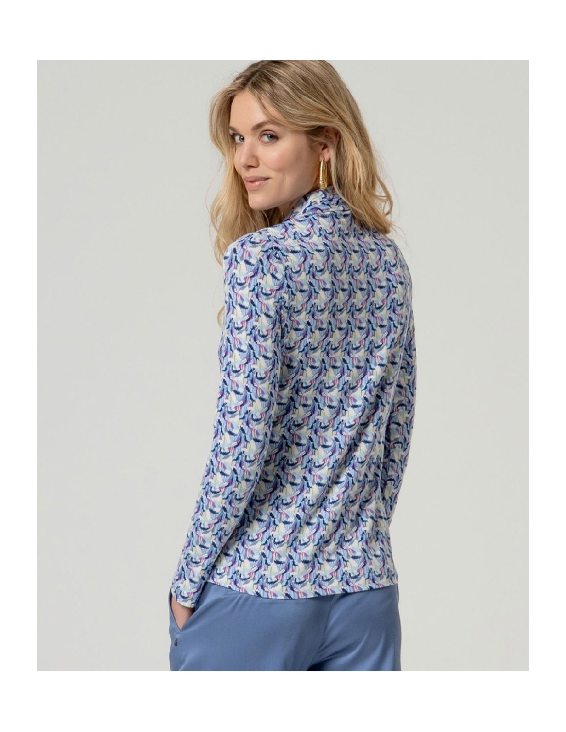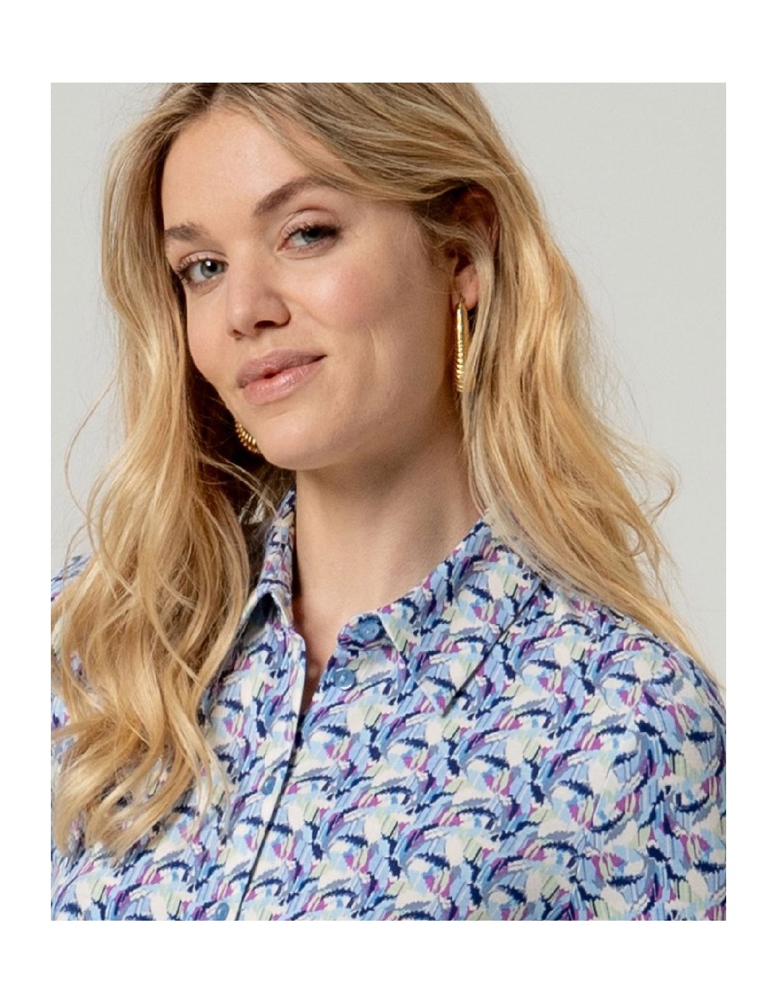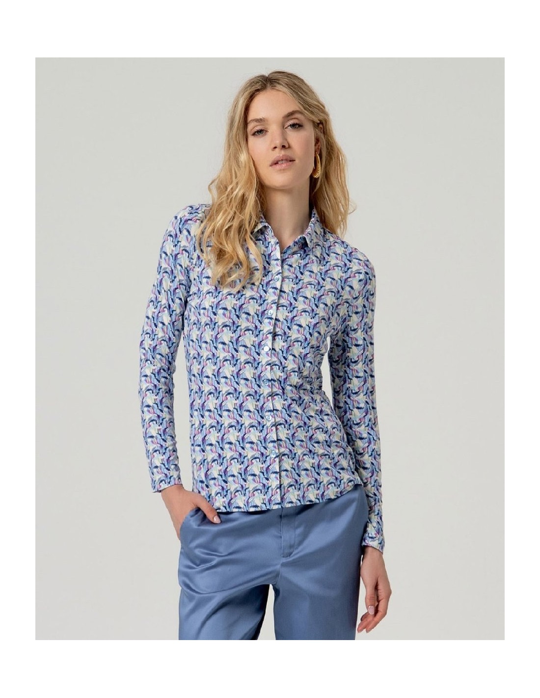 Camisa de manga larga con cuello camisero y cierre frontal de botones. Diseño entallado con puños abotonados y bajo ligeramente redondeado. Confeccionada en tejido estampado con viscosa EcoVero y elastano.