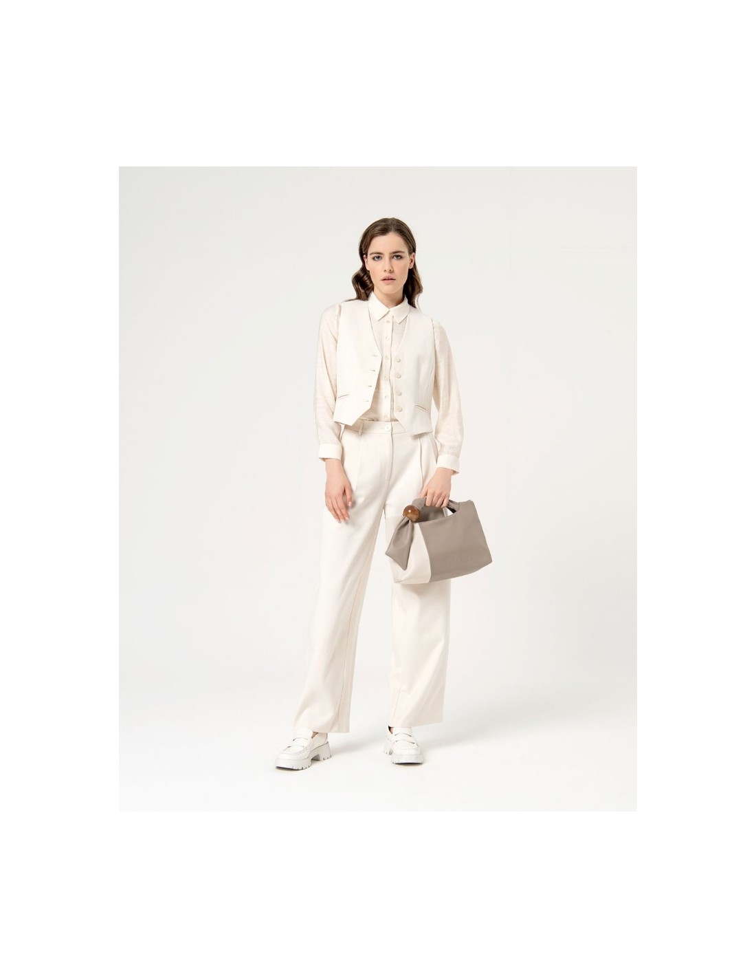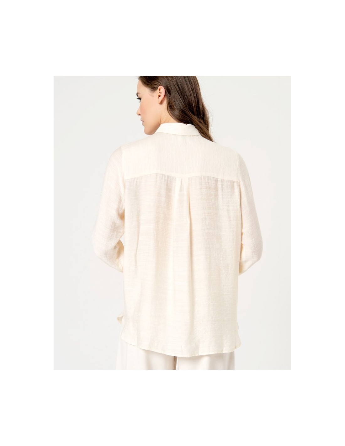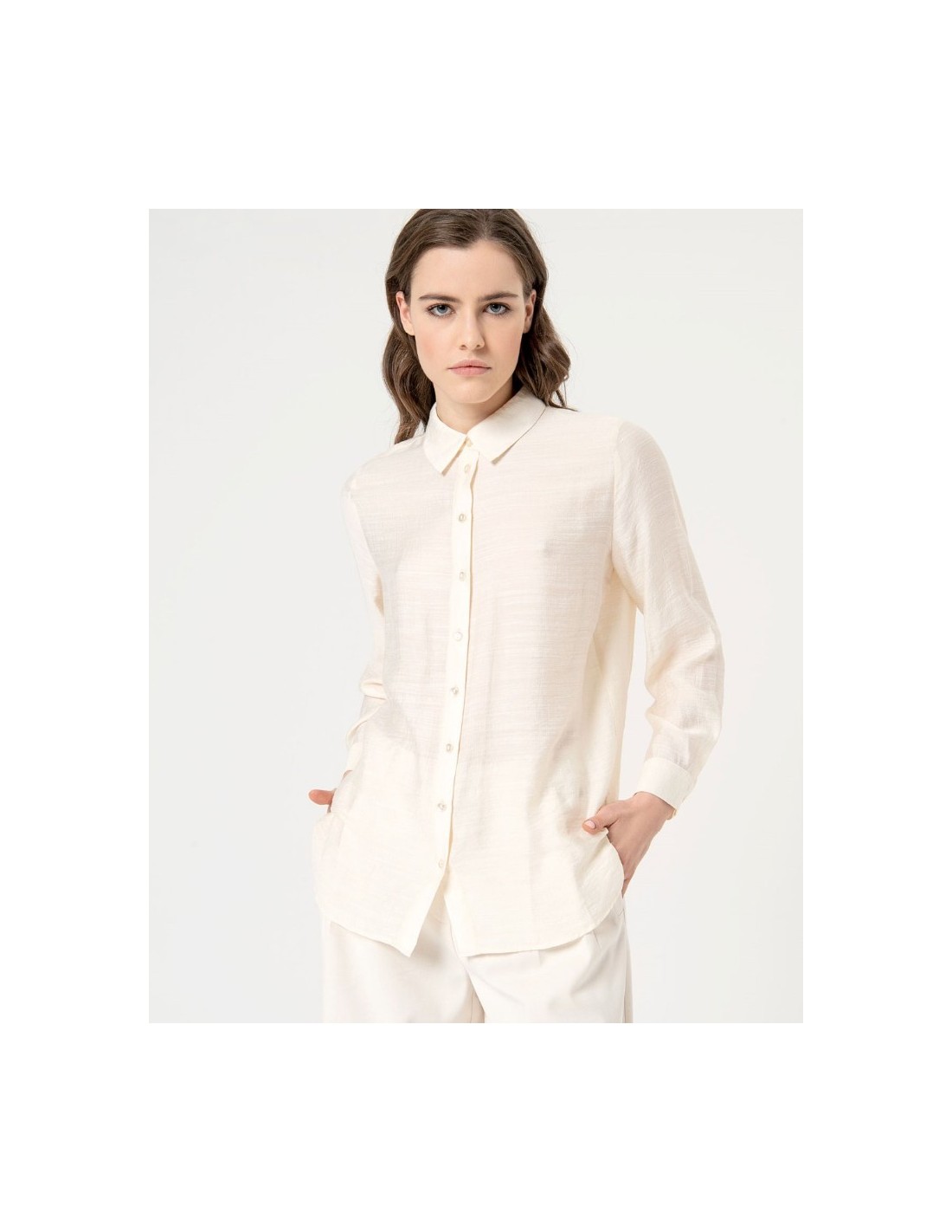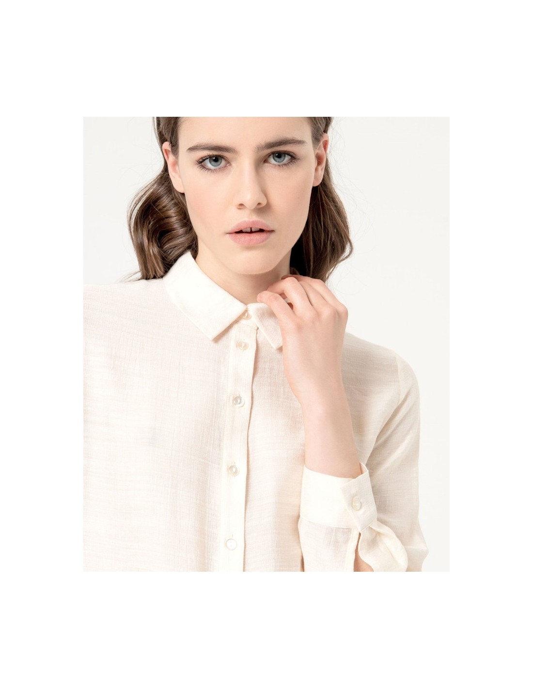 Camisa de viscosa con cuello solapa y manga larga acabada en puño con abertura y botones. Tejido con estructura y bajo redondeado.