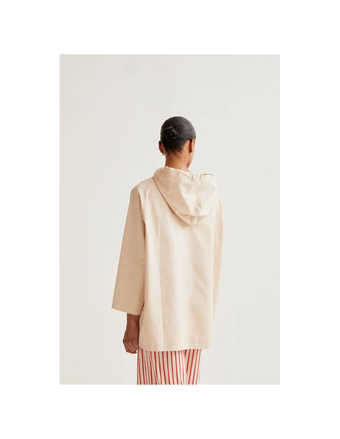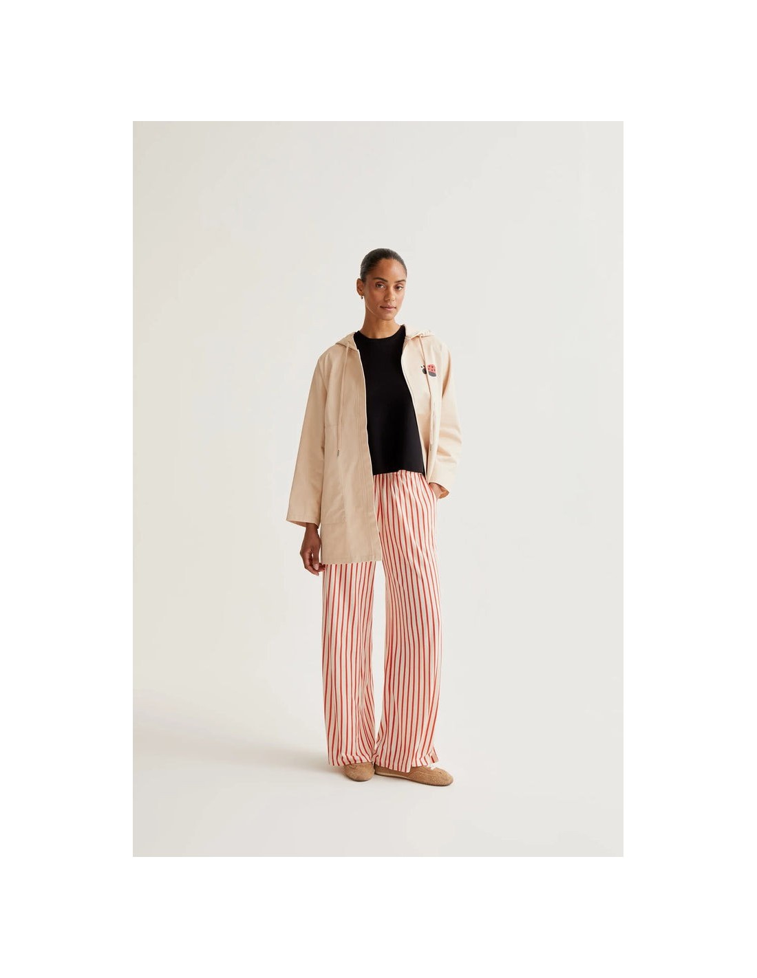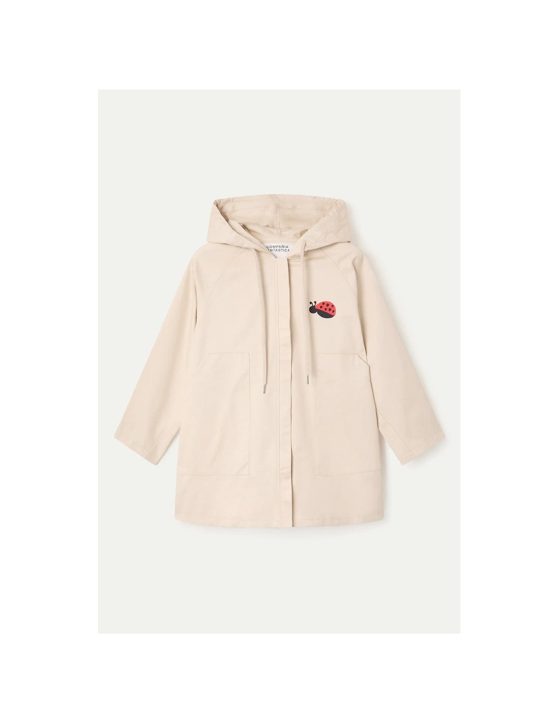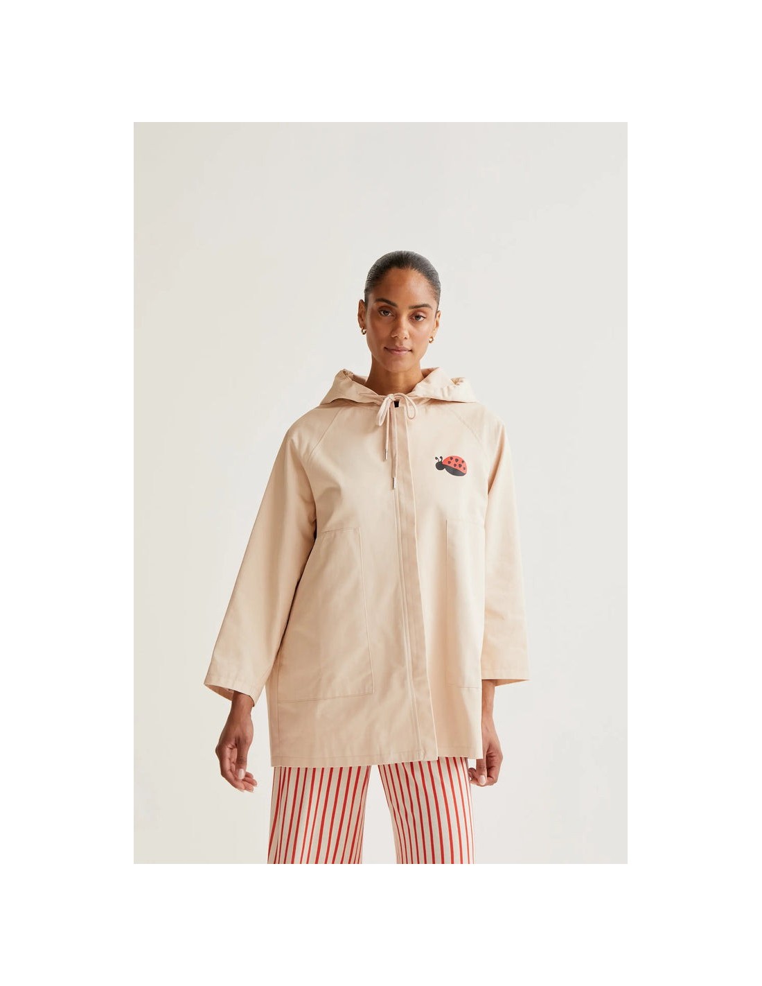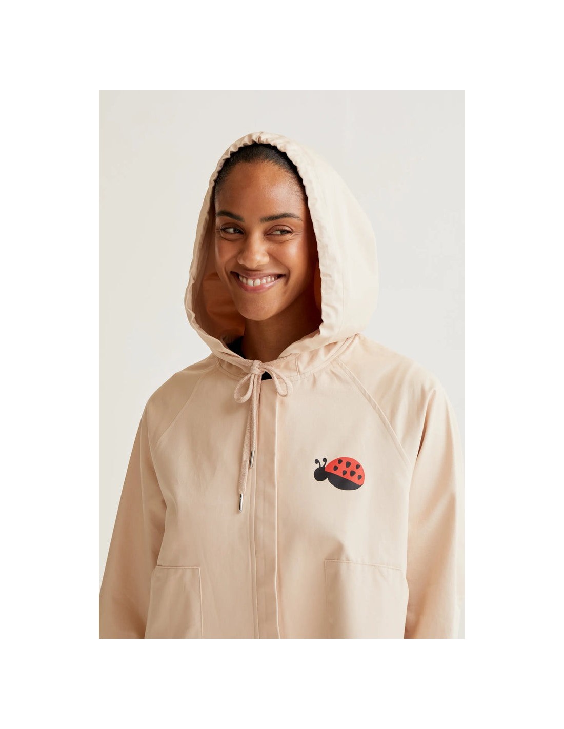 Gabardina de tejido 100% algodón con print de mariquita. Cuello con solapa y manga larga. Hombro ligeramente caído. Cierre frontal con cremallera ocultar.Capucha con cordón ajustable.Bolsillos laterales. Forro interior.La modelo mide 173 cm y lleva la talla S.