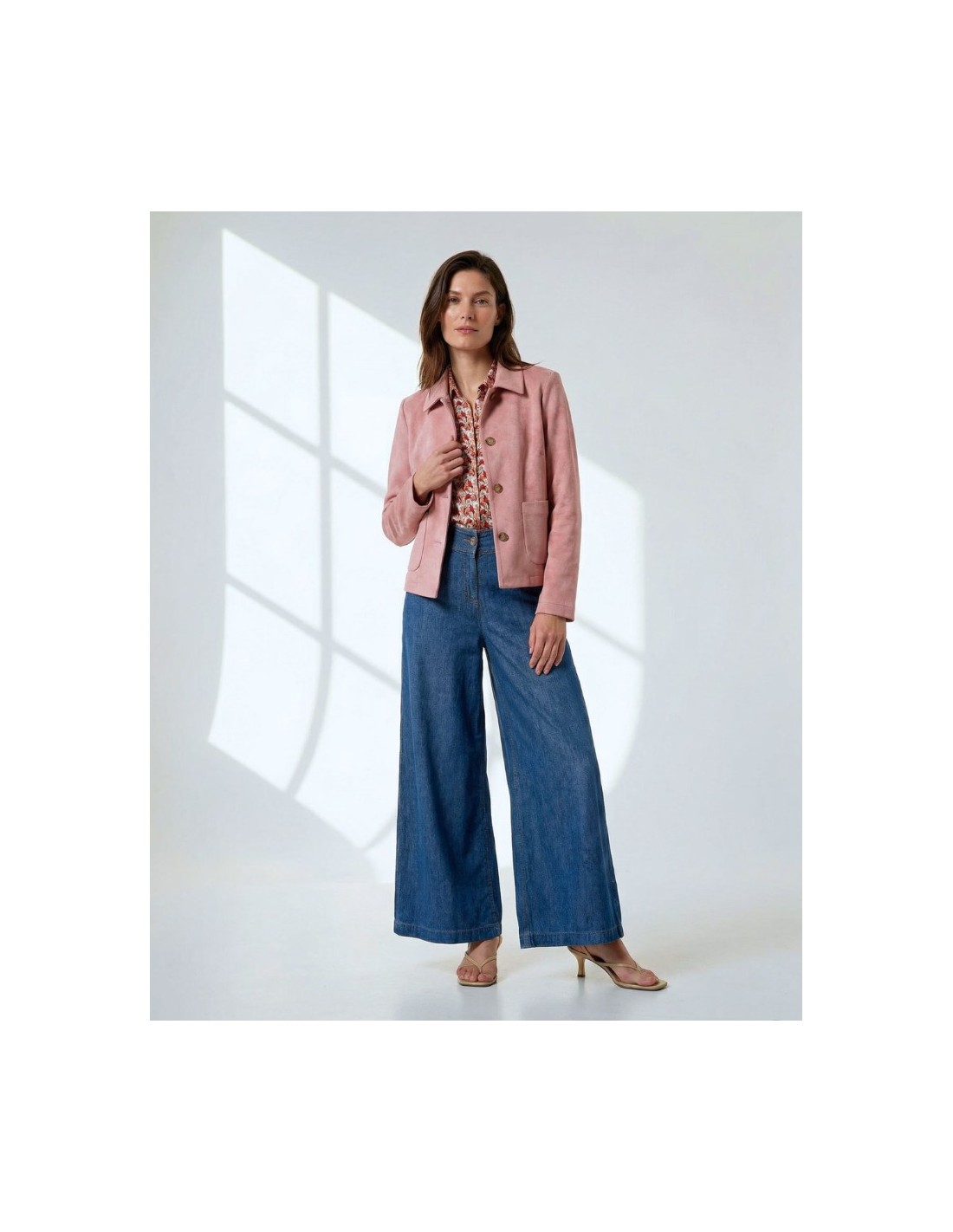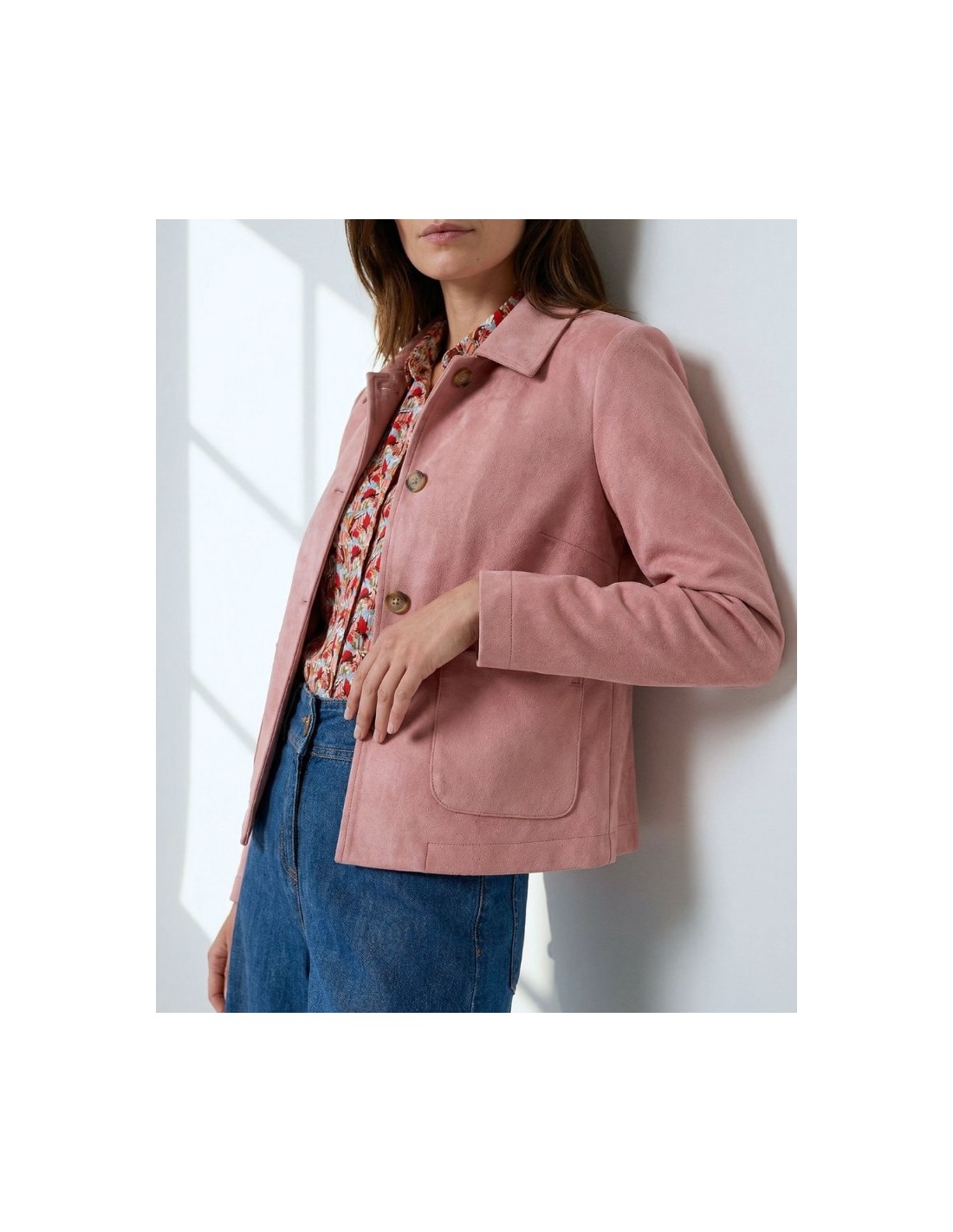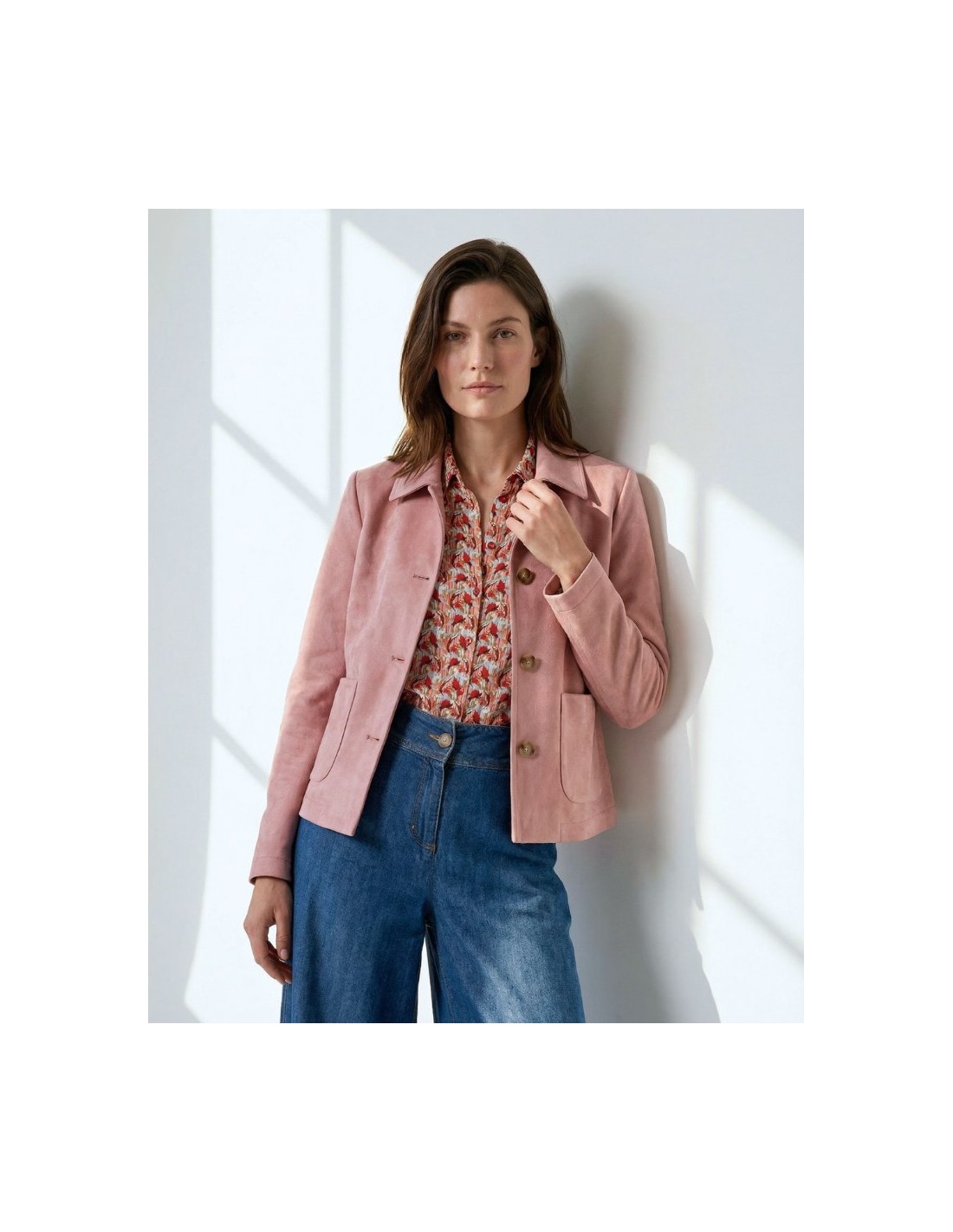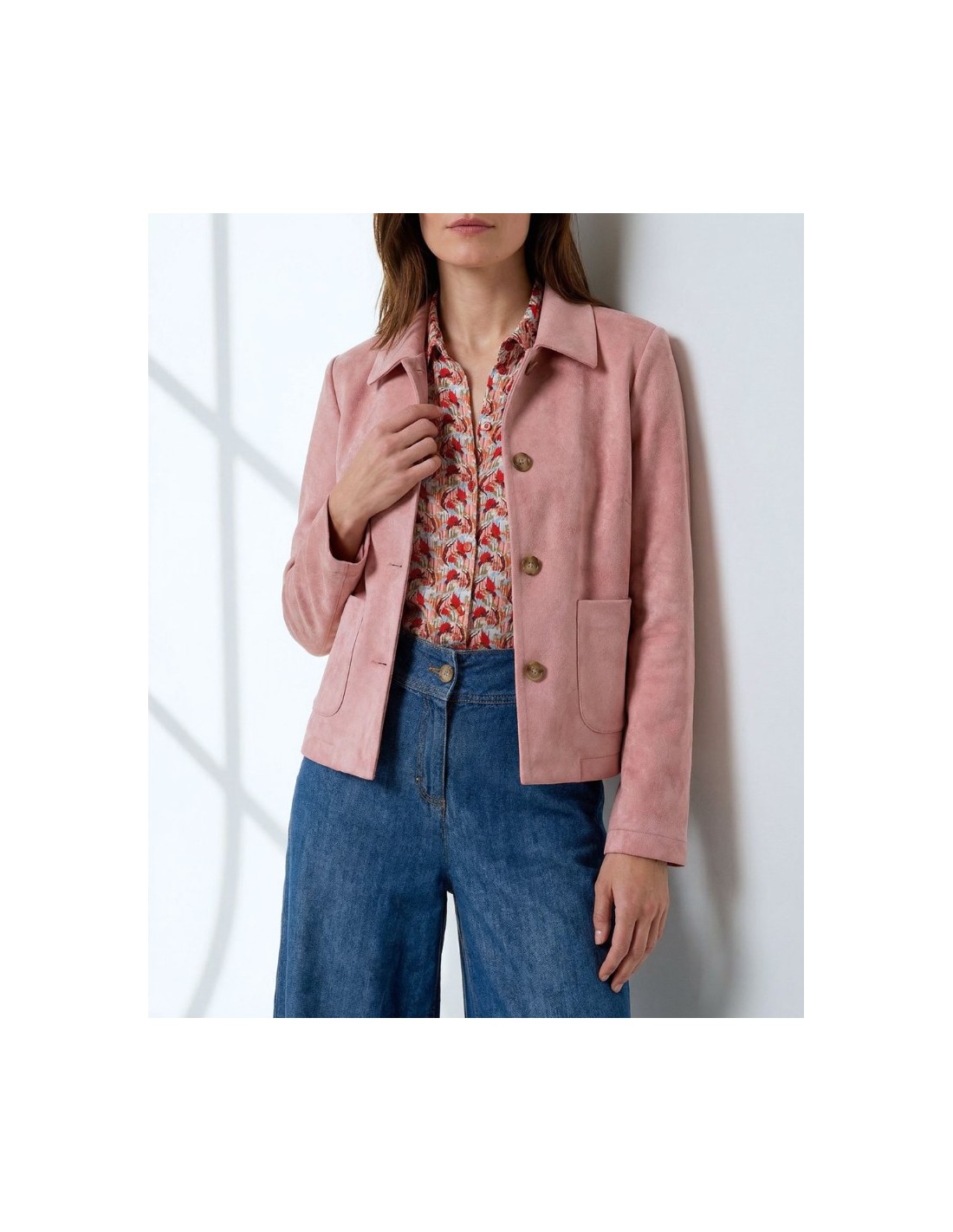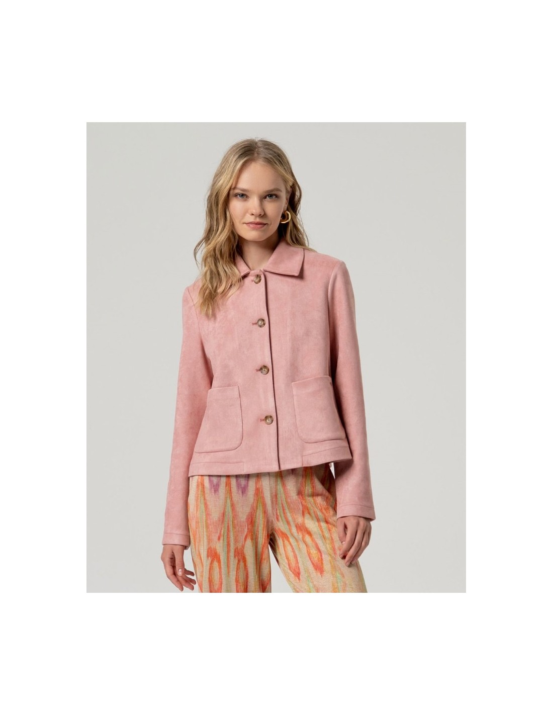 Chaqueta de cuello solapa y manga larga. Diseño de silueta recta con cierre frontal mediante botones a contraste y amplios bolsillos laterales de parche. Presenta una costura vertical central en la espalda y un bajo con acabado de gran pespunte. Confeccionada en tejido de poliéster y spandex con acabado de efecto ante y tacto suave.