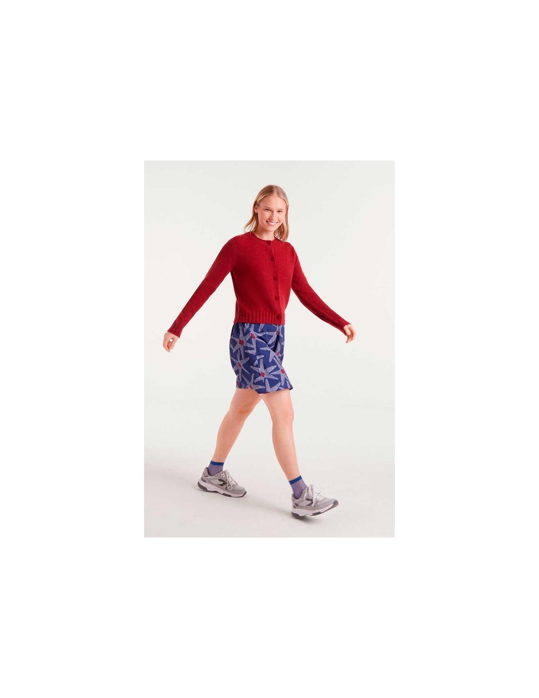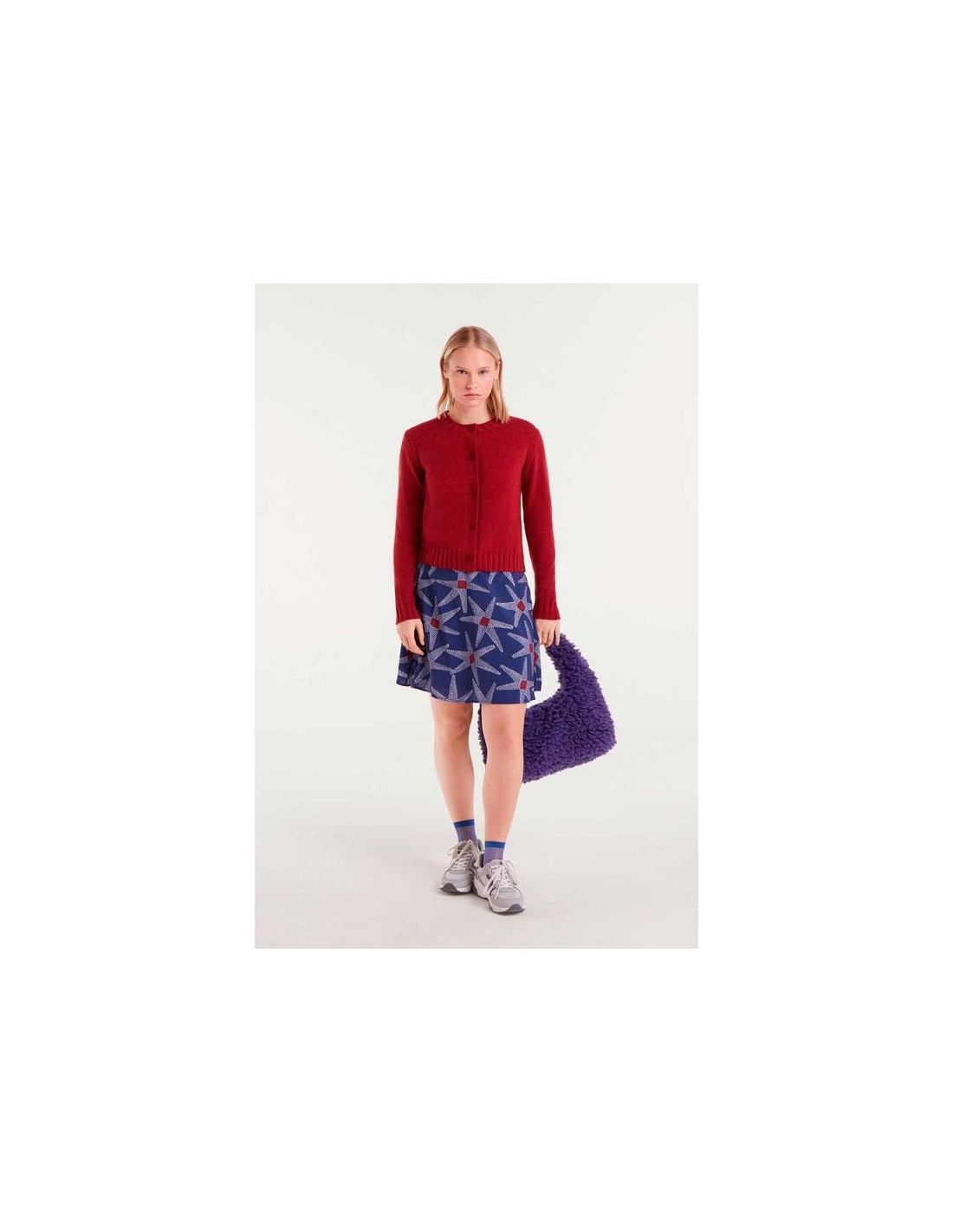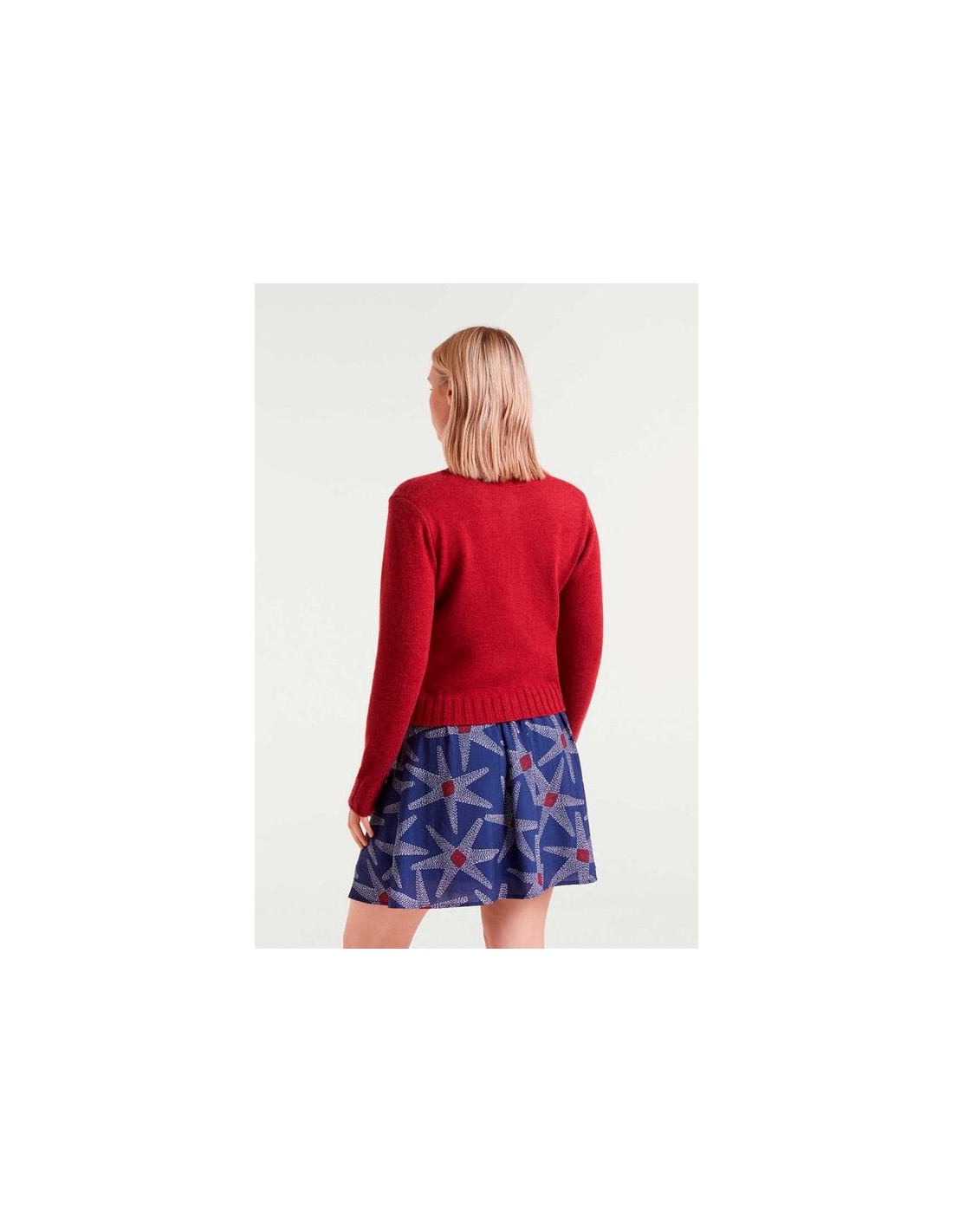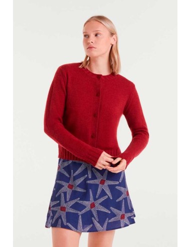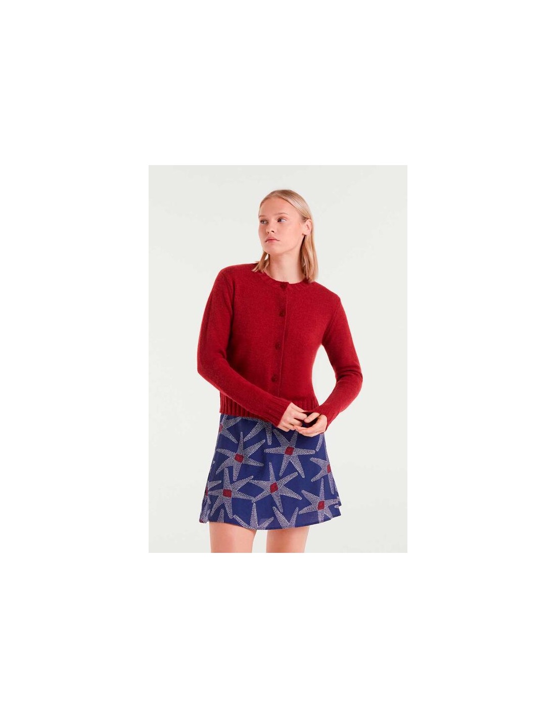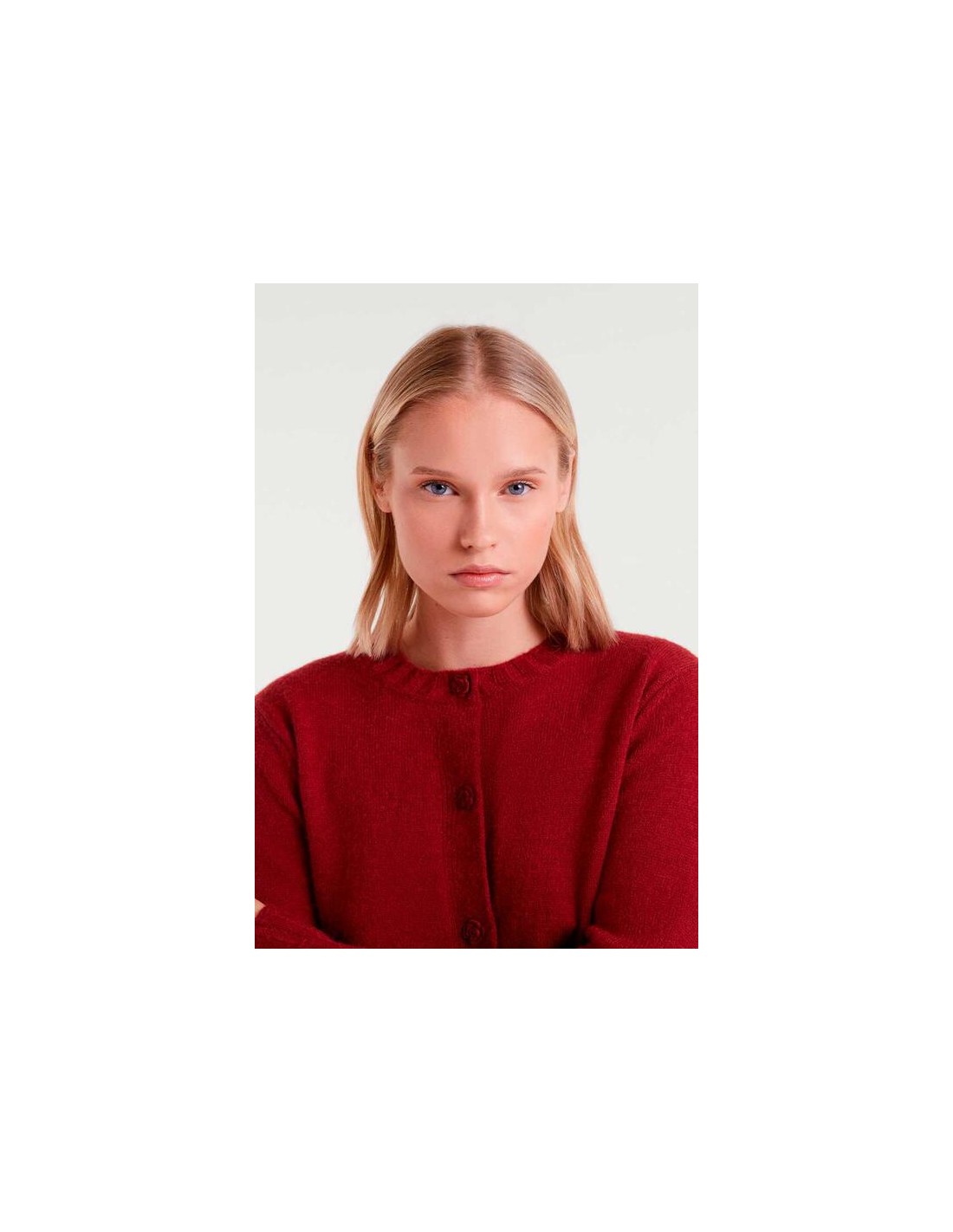 Cárdigan de punto color rojo. Con cuello redondo y manga larga. Hombro ligeramente caído. Cierre frontal con botones en forma de rosa.