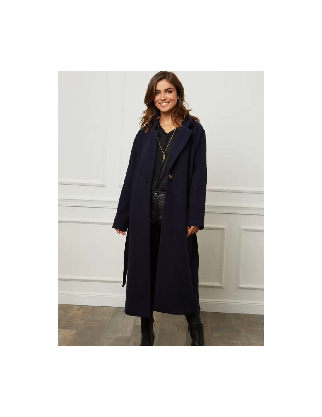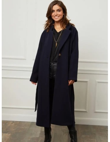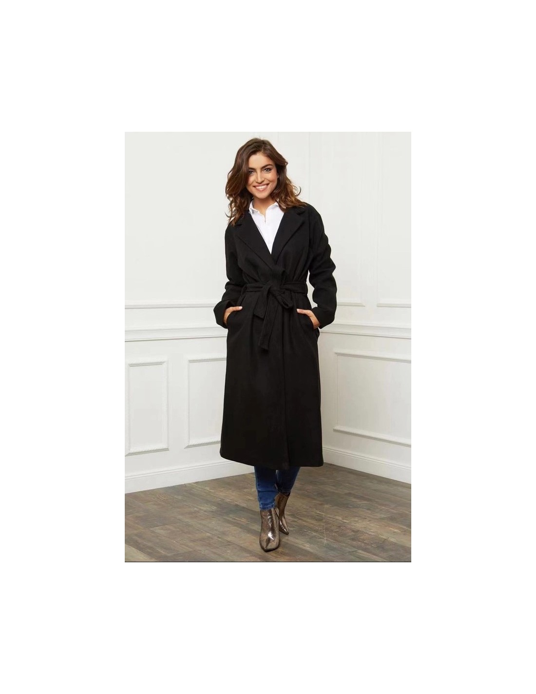 Abrigo de largo medio con un corte fluido y femenino y un cuello sastre estructurado.