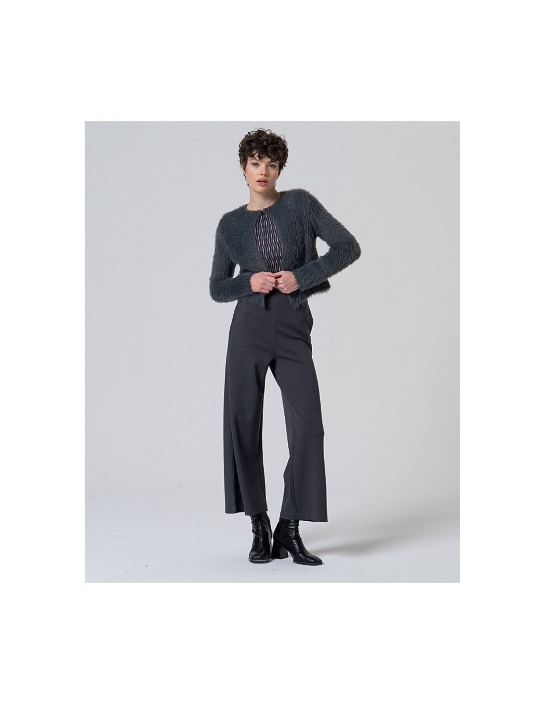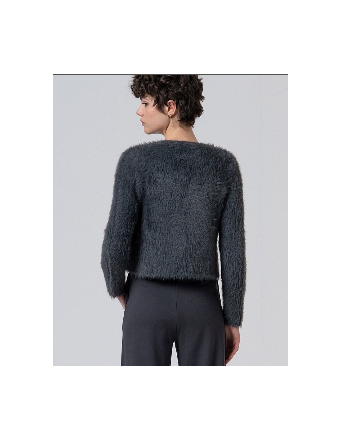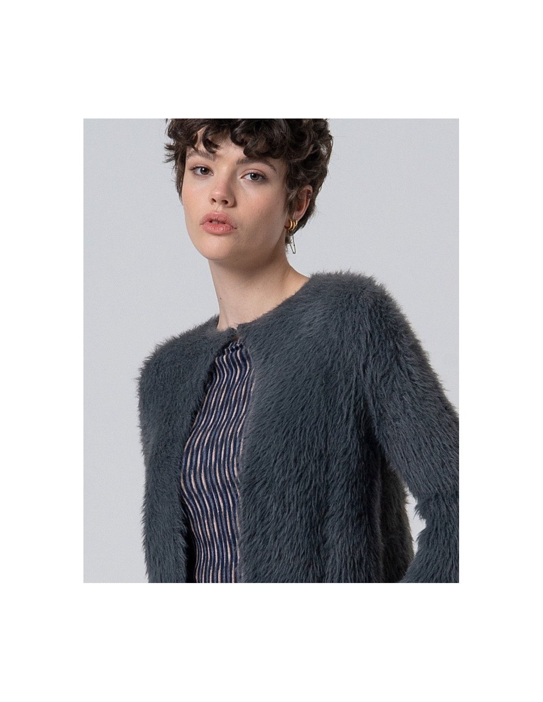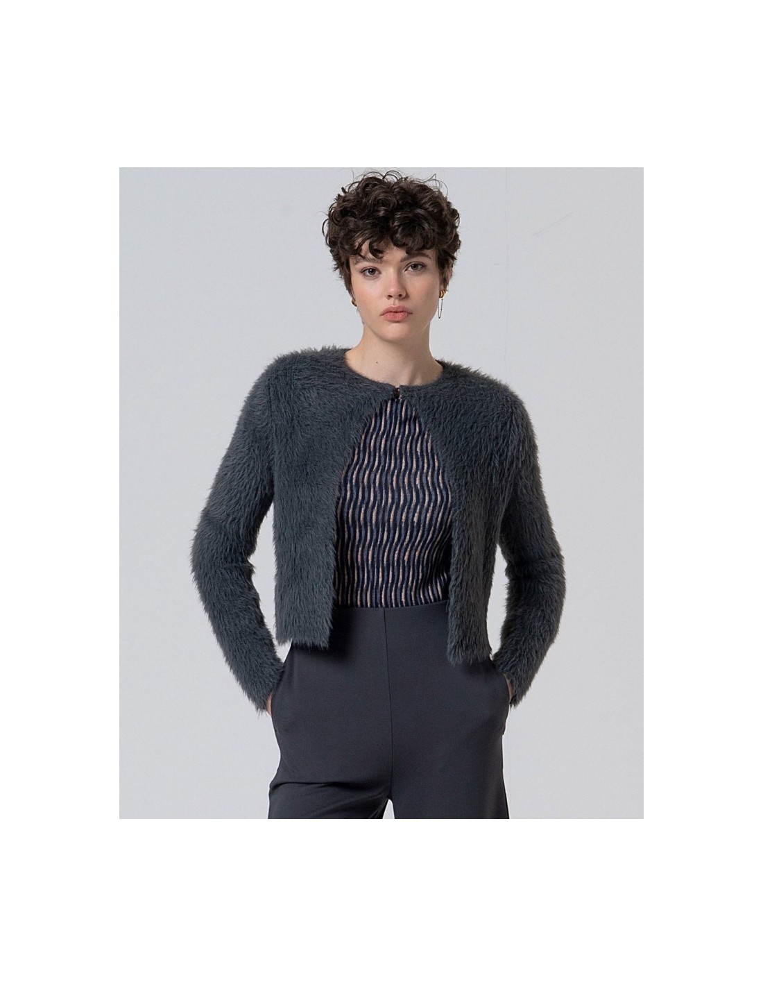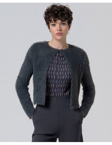Chaqueta corta de efecto pelo, con cierre de gancho en el escote. De tacto muy suave, es una prenda ligera y envolvente que aporta un toque sofisticado al look sin perder comodidad. Ideal para combinar con pantalones de tiro alto o vestidos entallados.
