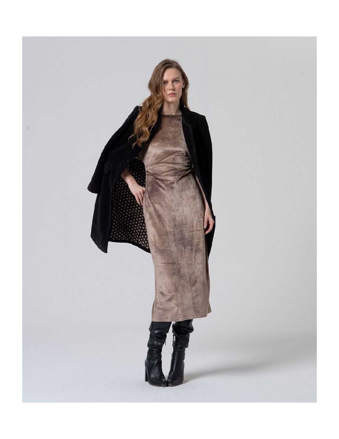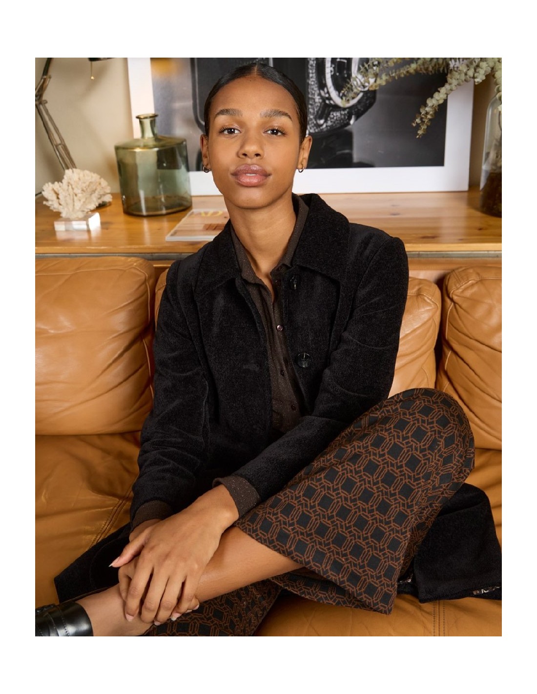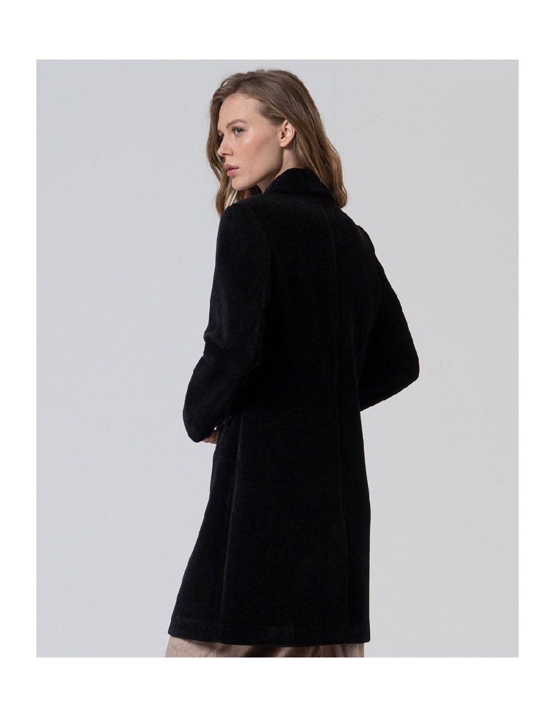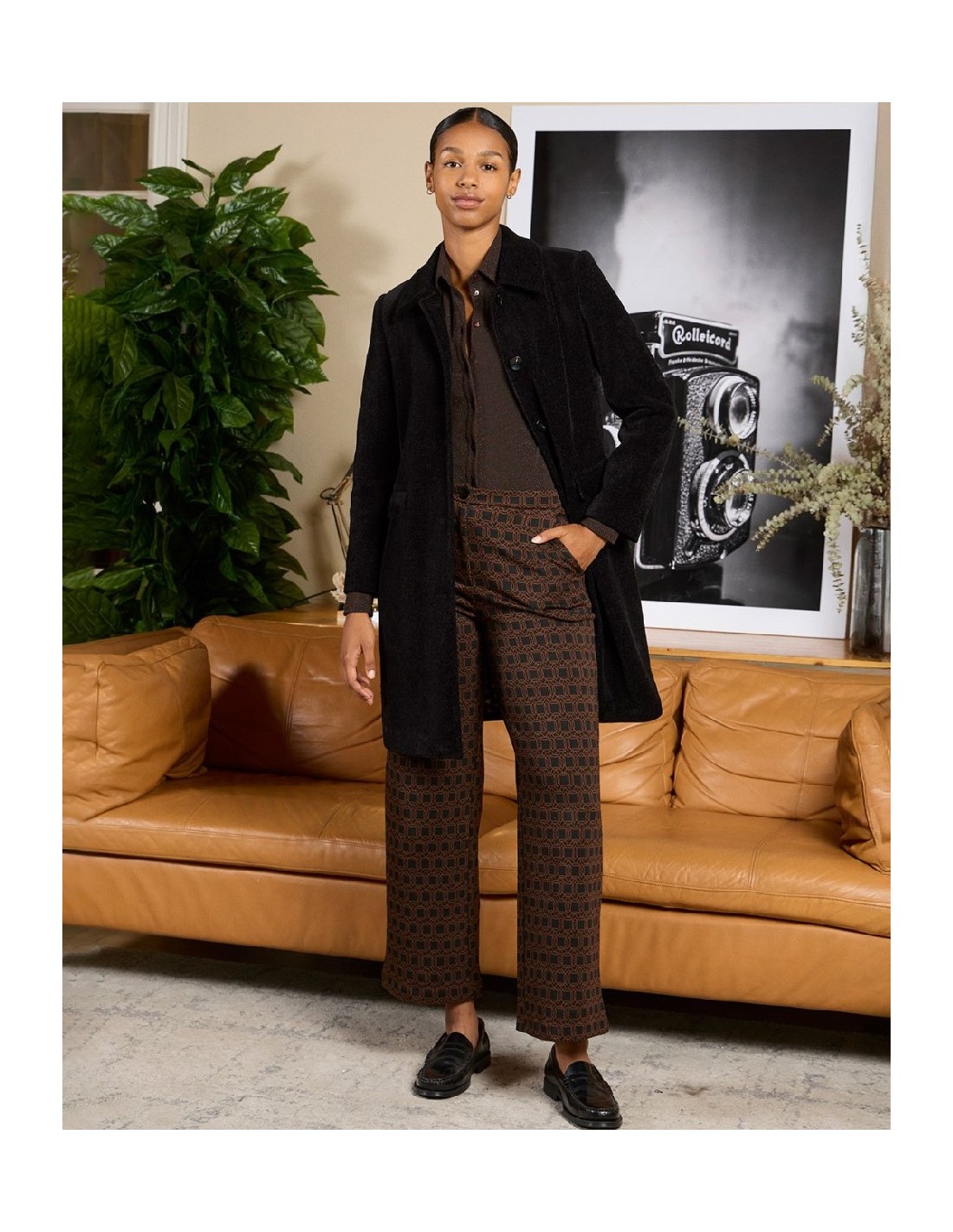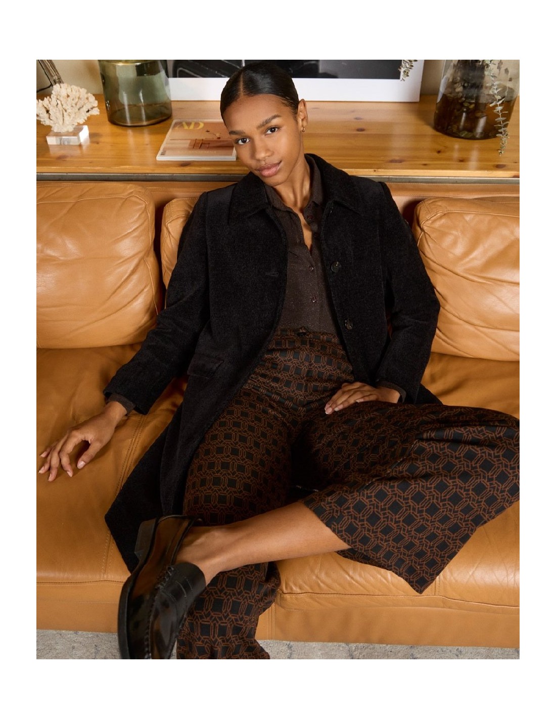 Abrigo largo de corte recto con bolsillos, forro estampado y cierre con botones delanteros. Confeccionado en una cálida mezcla de chenilla con tacto suave y textura elegante. Un diseño sobrio y atemporal perfecto para completar cualquier estilismo con un punto sofisticado.