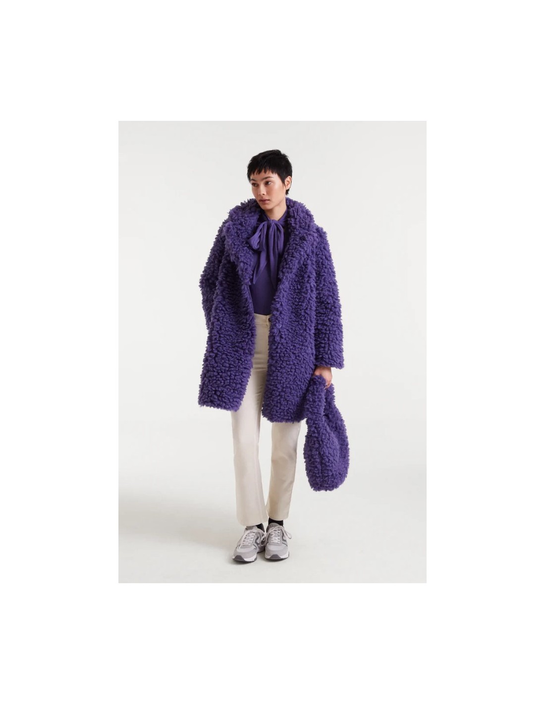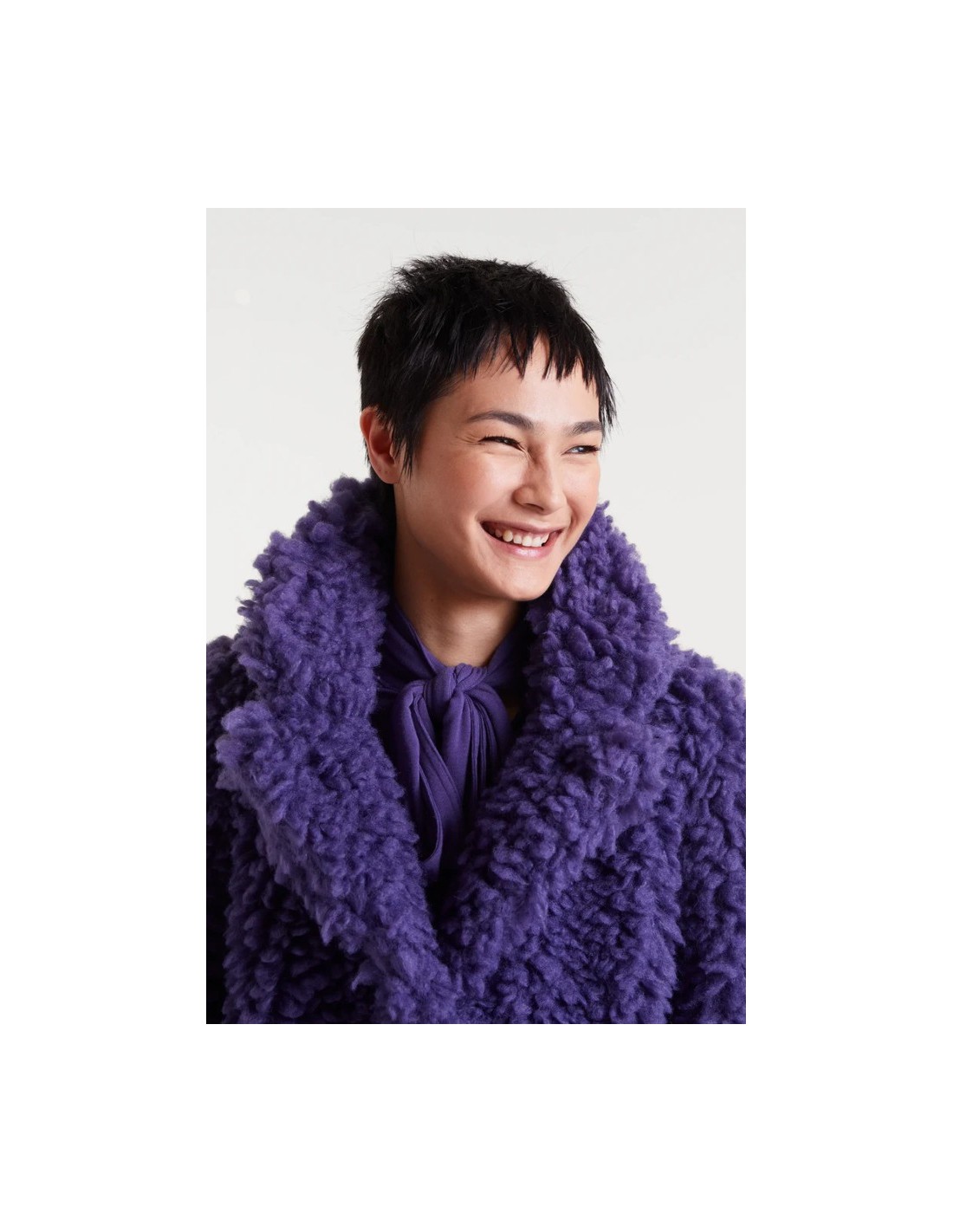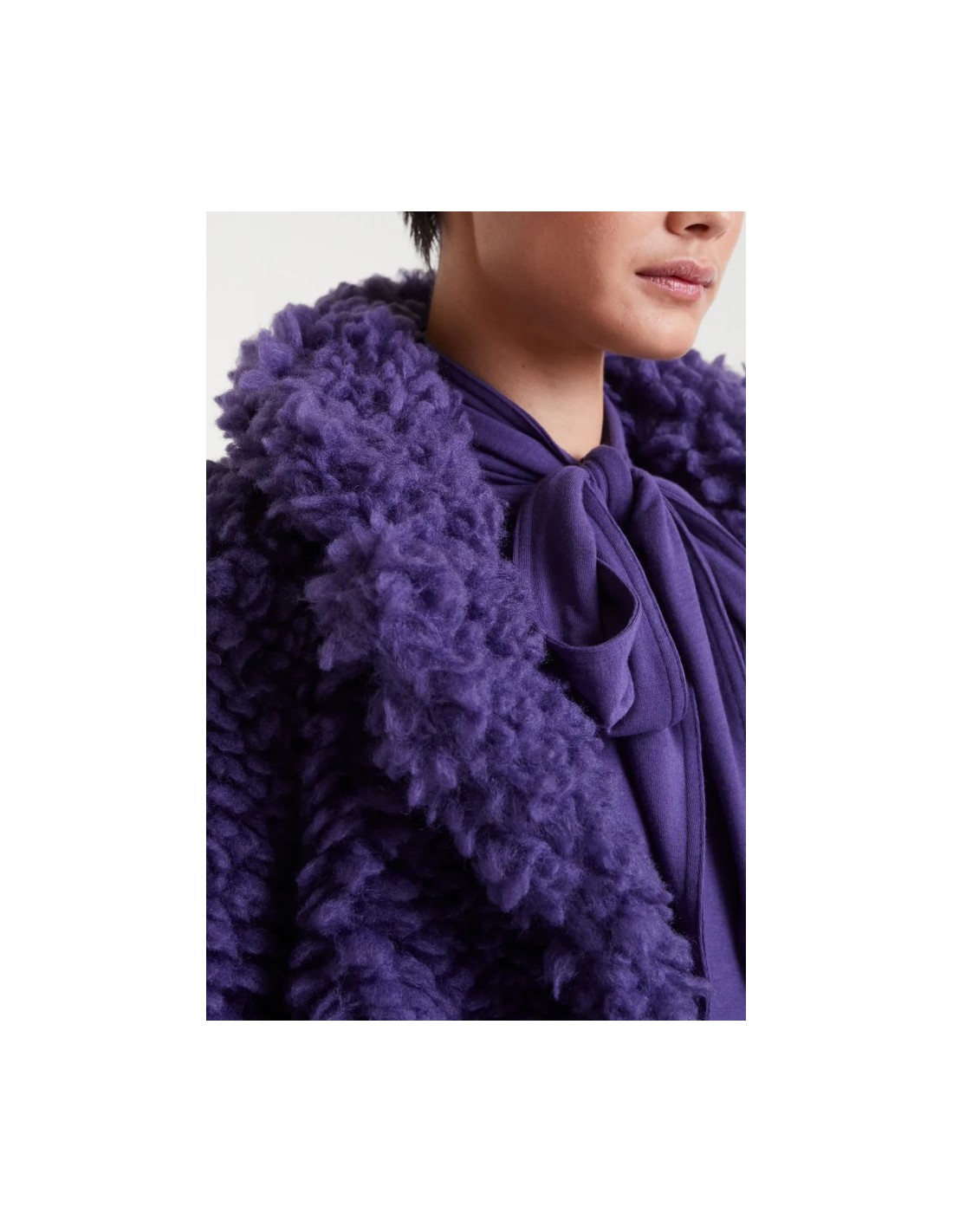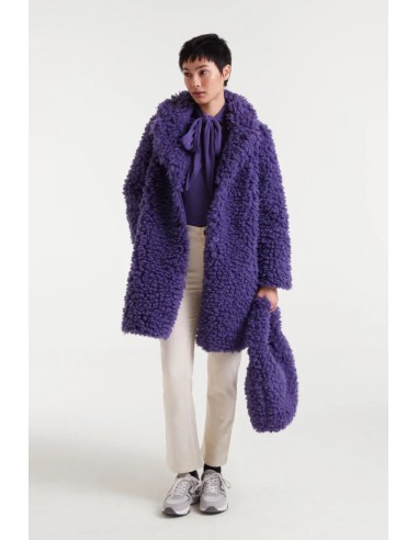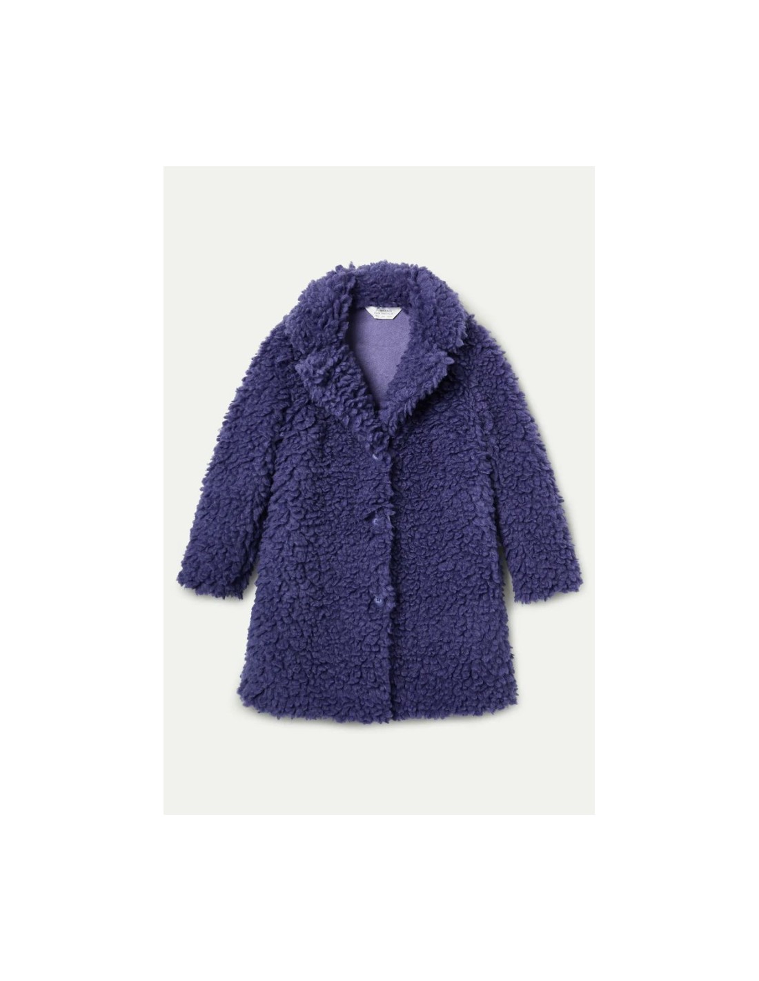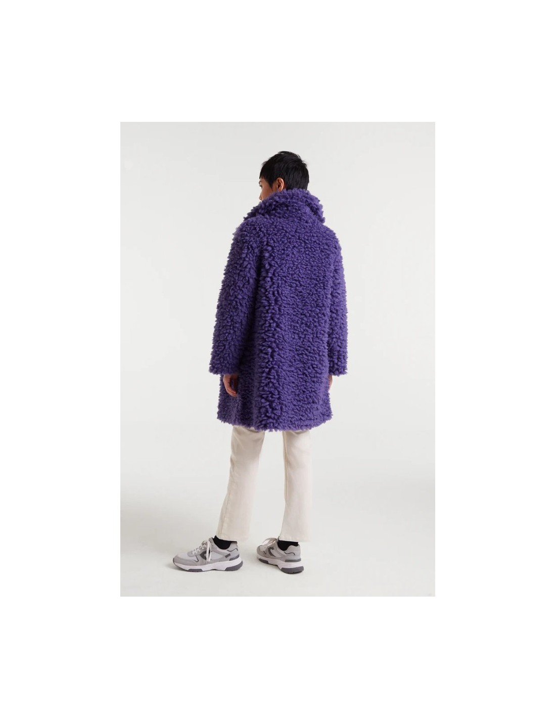 Abrigo de tejido faux fur de color morado. Con cuello solapa y manga larga. Cierre frontal con botones.