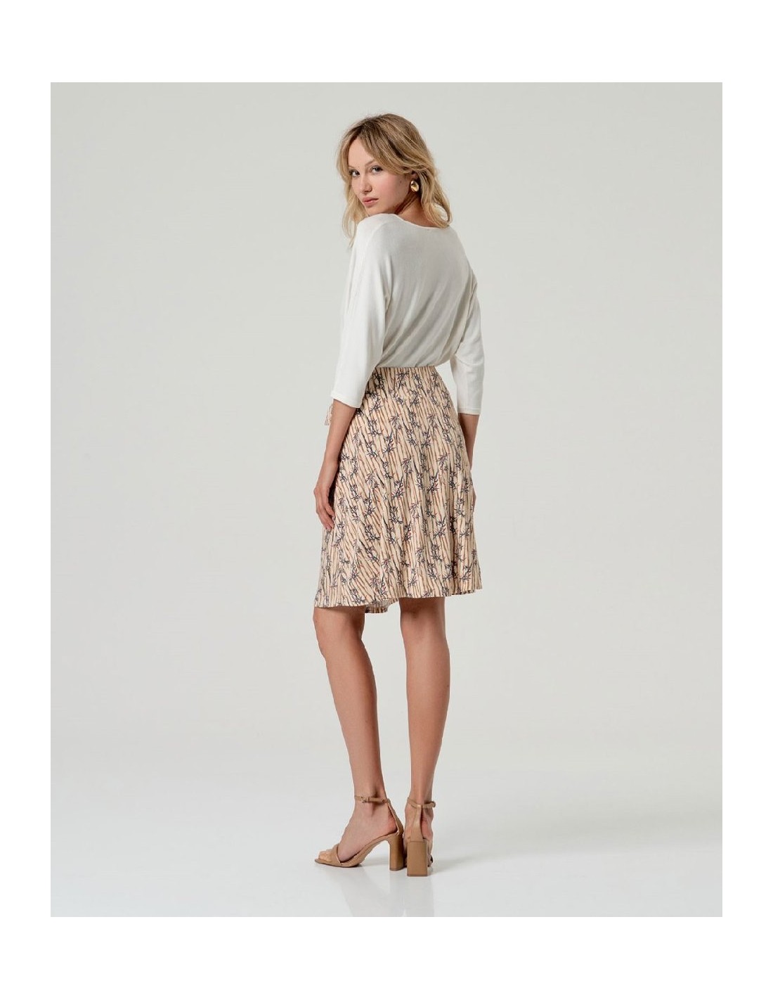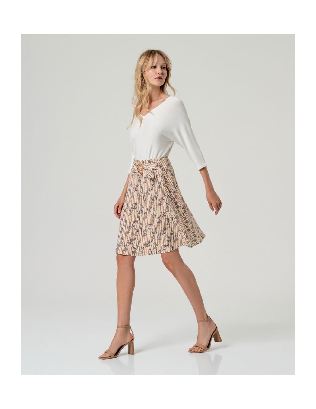 Falda a la rodilla de tiro medio con cinturilla fija y cierre lateral. Diseño ligeramente evasé con estampado geométrico continuo y detalle de hebilla en la cintura. Confeccionada en tejido ligero con viscosa EcoVero y elastano.