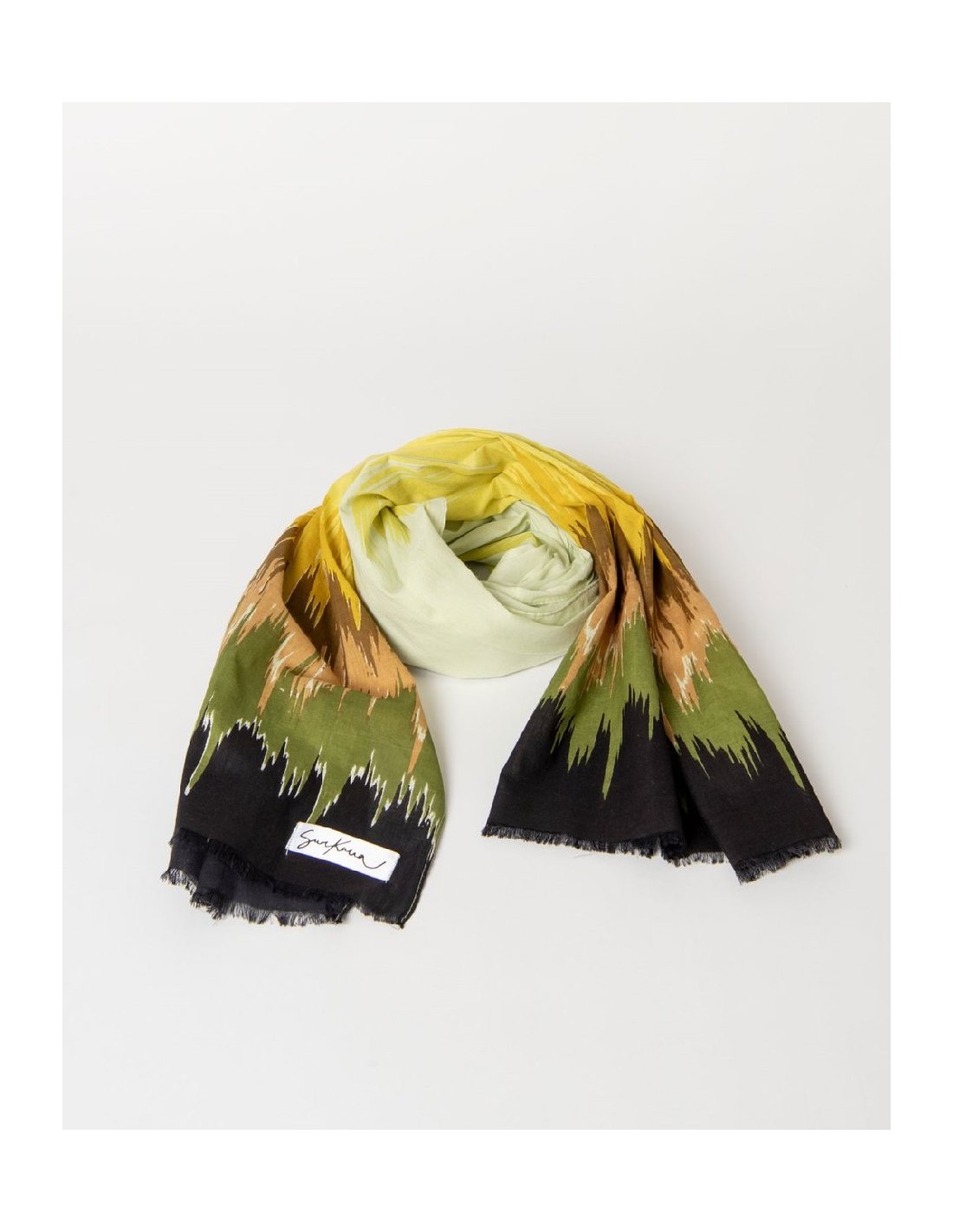 Pañuelo rectangular confeccionado en tejido ligero con estampado degradado en contraste. Diseño con flecos cortos en los extremos. Pañuelo degradado ligero
