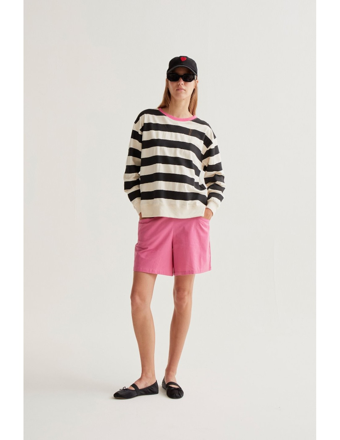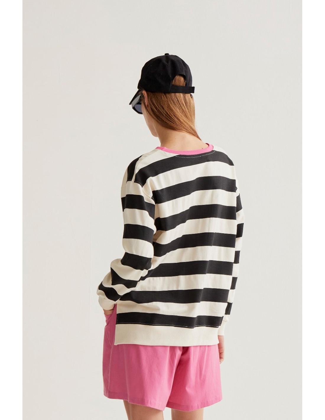 Sudadera de tejido 100% algodón con estampado de rayas blanco y negro. Cuello redondo de color rosa y manga larga. Detalles acabados en rib. La modelo mide 177 cm y lleva la talla S.
