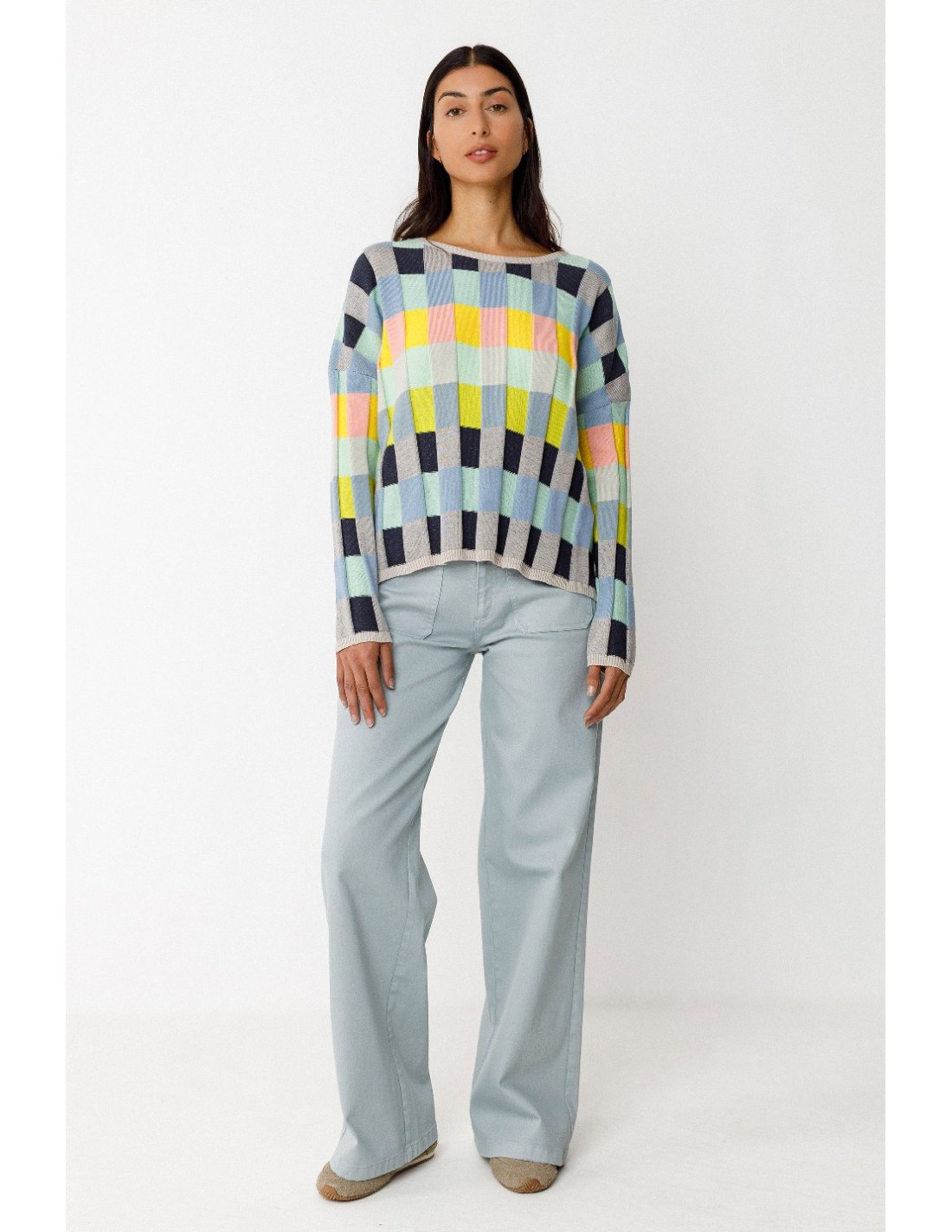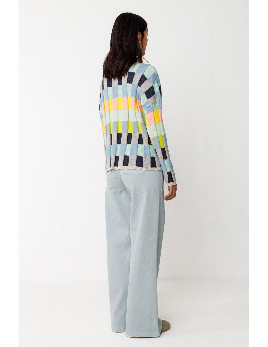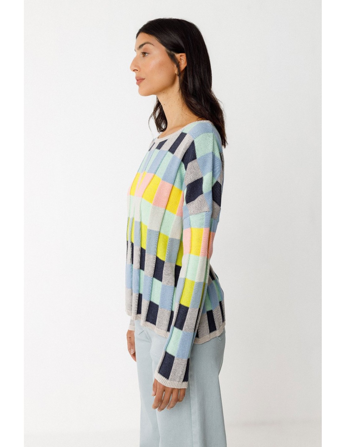 Suéter corto de punto ligero de algodón orgánico con certificado GOTS, con dibujo de cuadros. Cuello redondo y hombro caído.