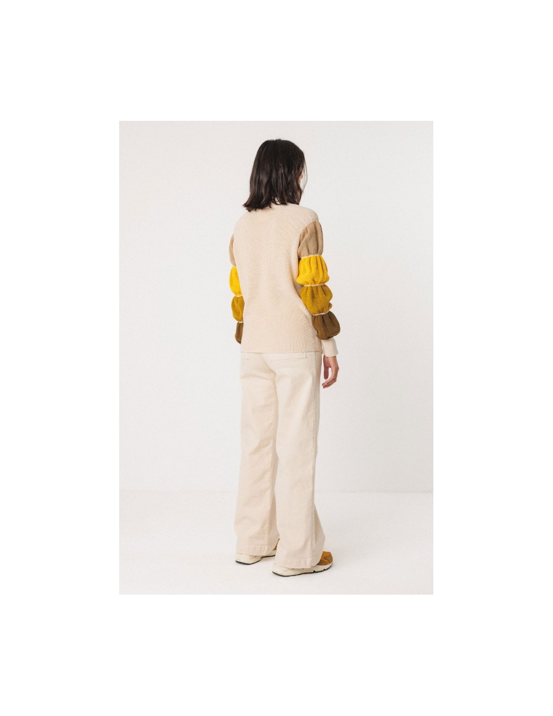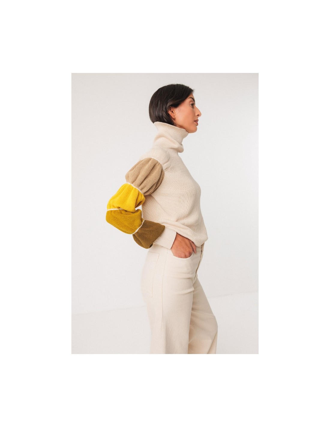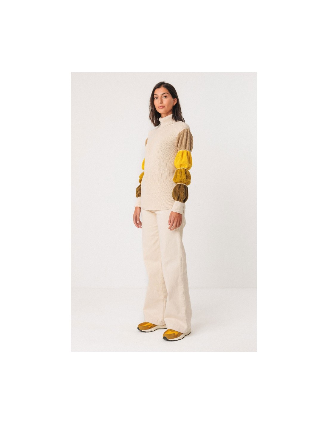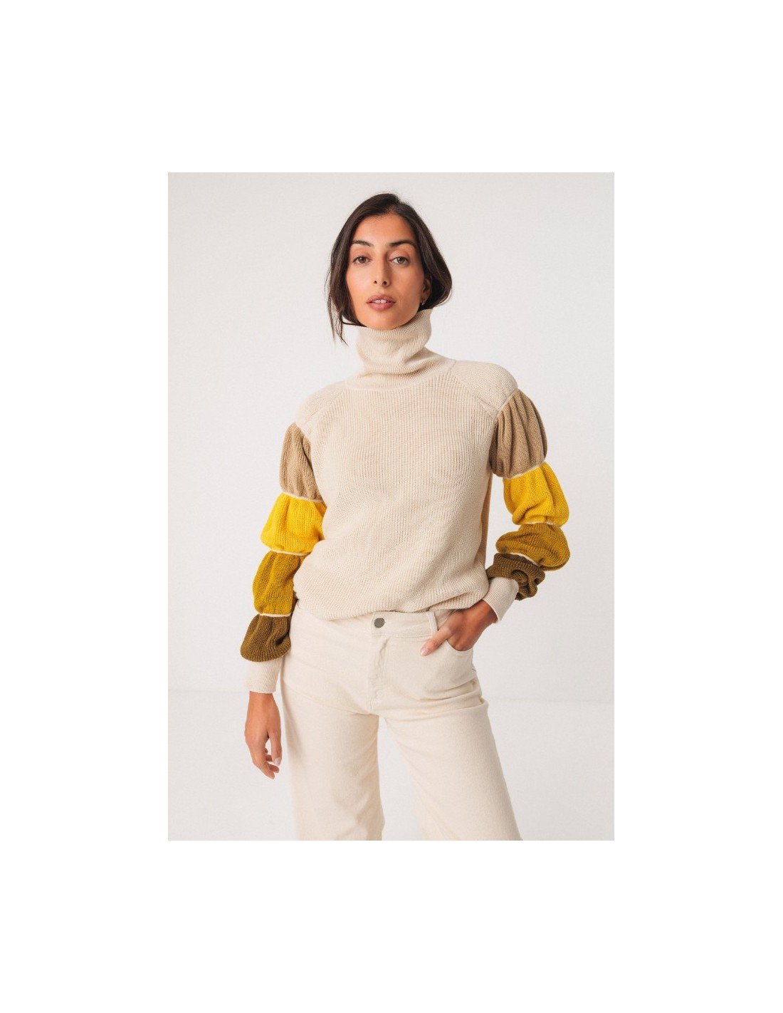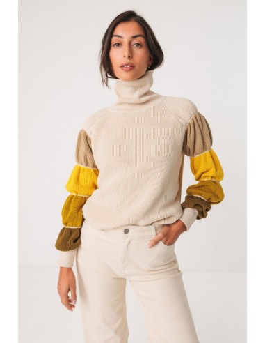 Suéter ceñido de punto semigrueso, cuello alto de canalé y manga larga. Está adornado con un juego de colores en contraste.
