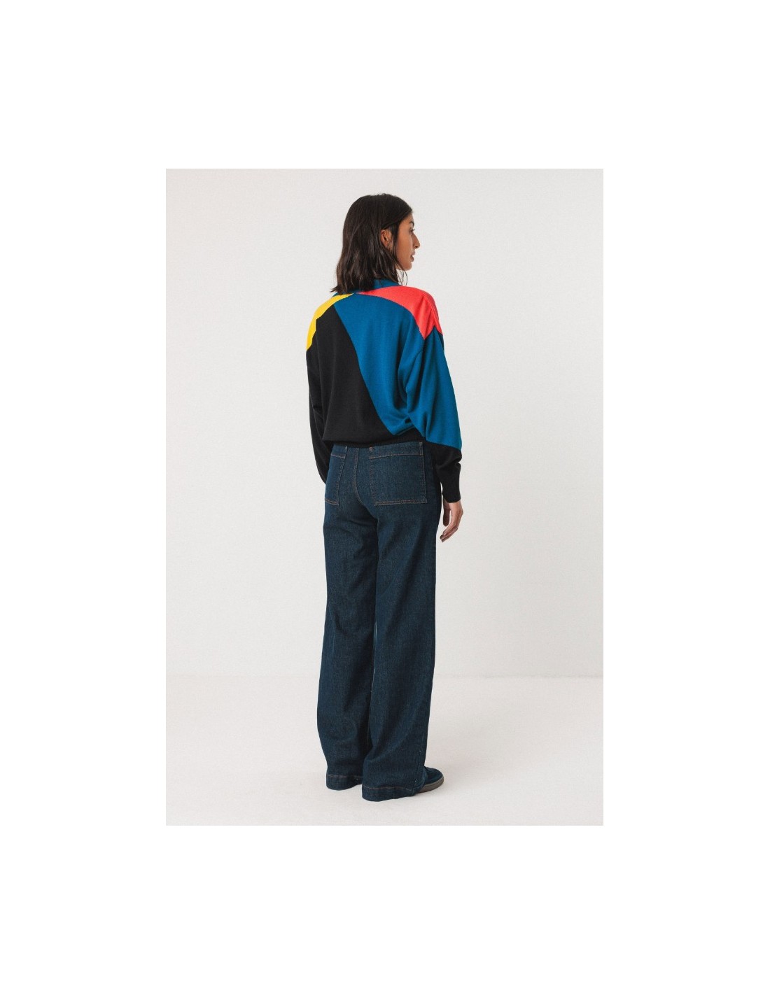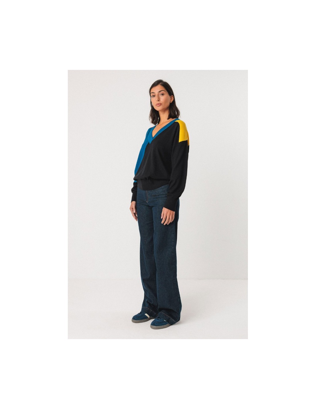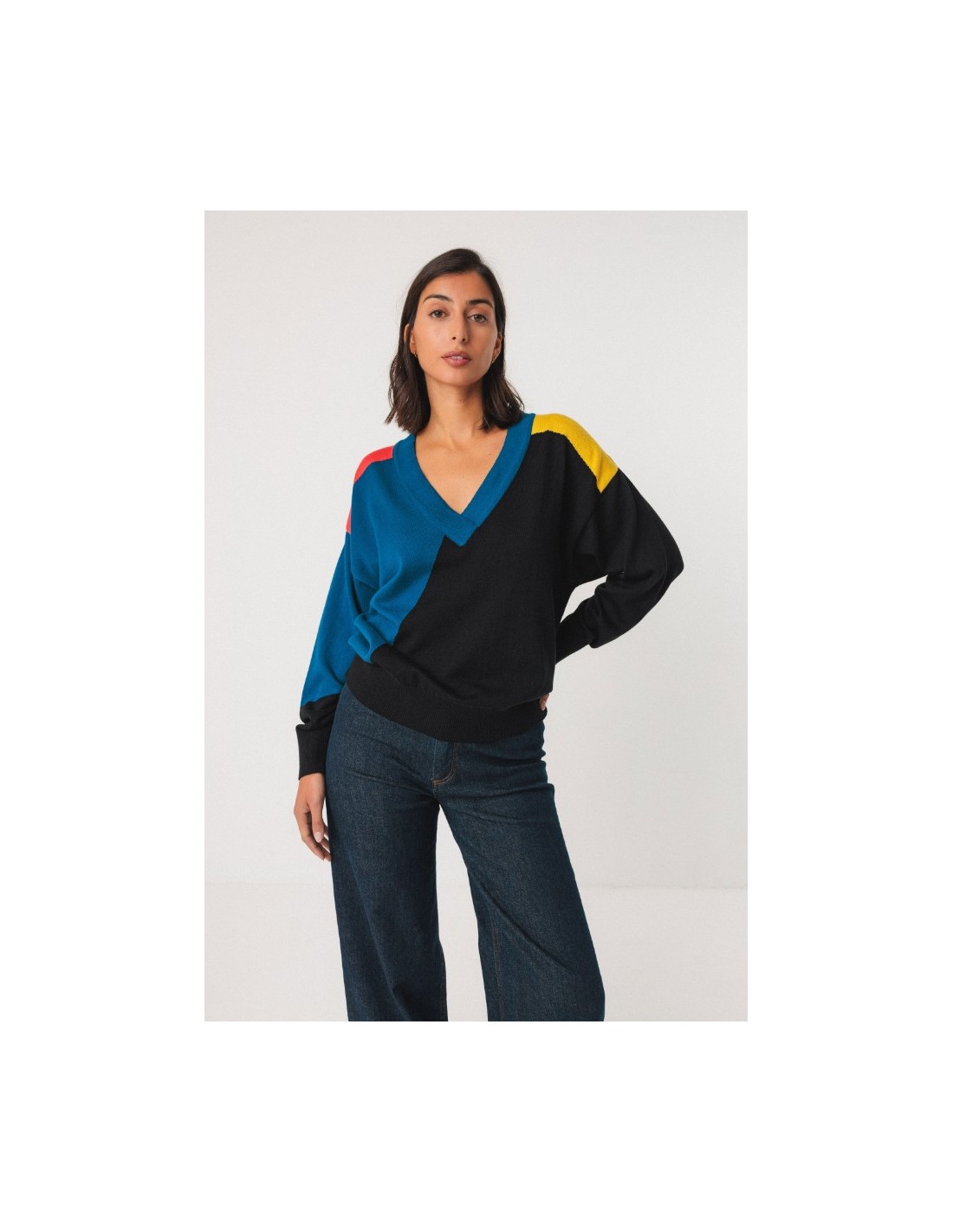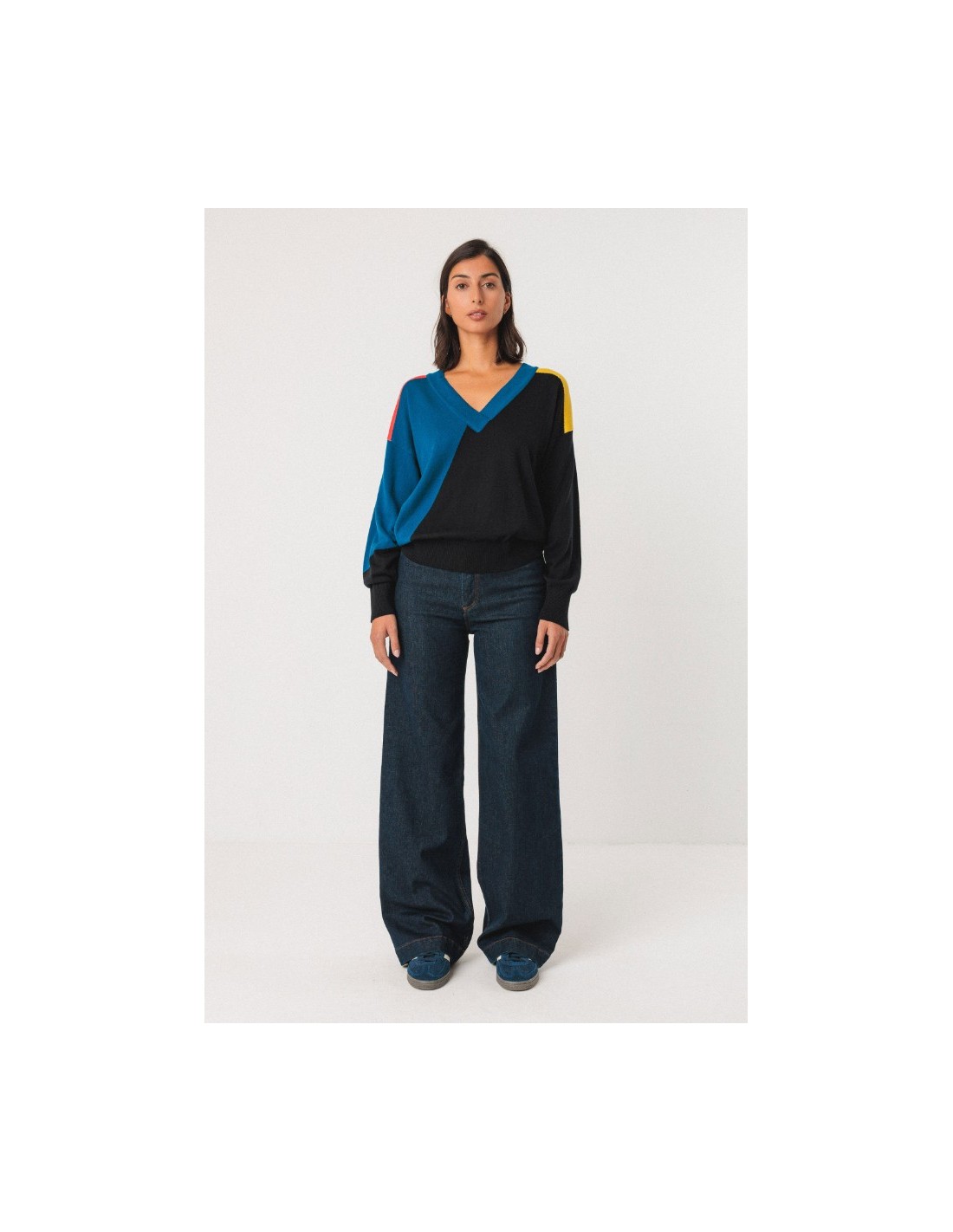 Suéter con cuello de pico, costuras de los hombros caídas y mangas murciélago. Modelo hecho de punto fino con efecto de colores en contraste.