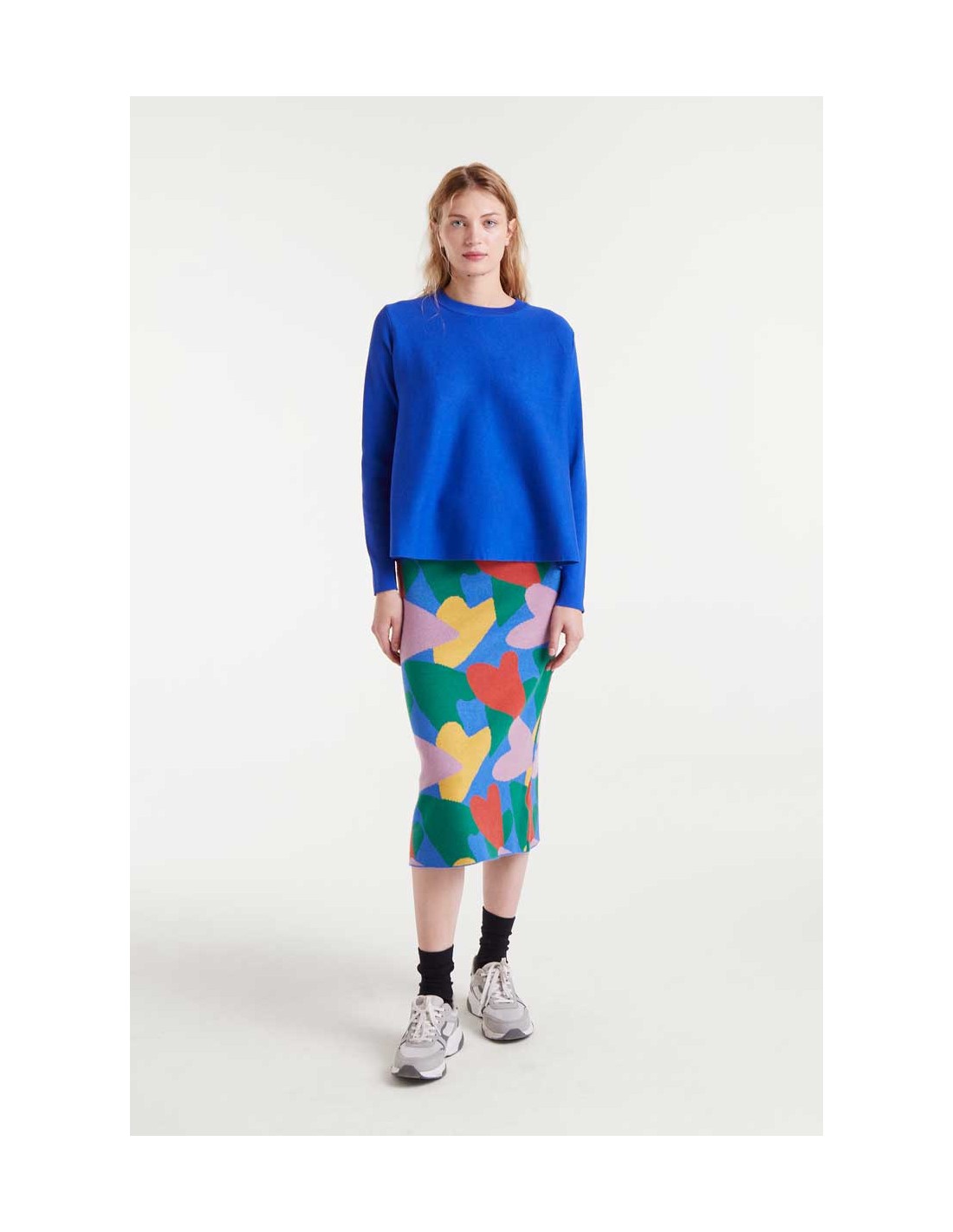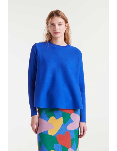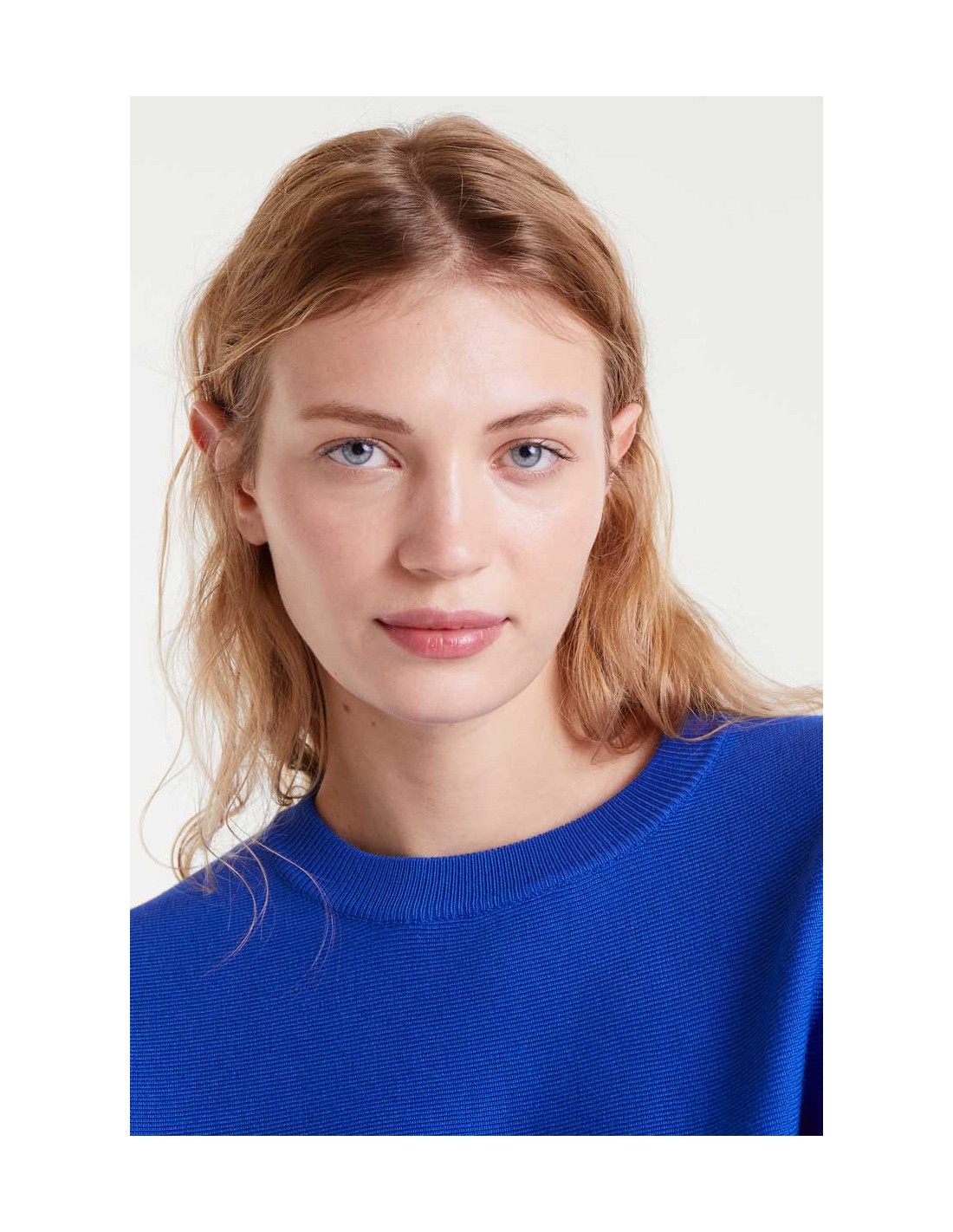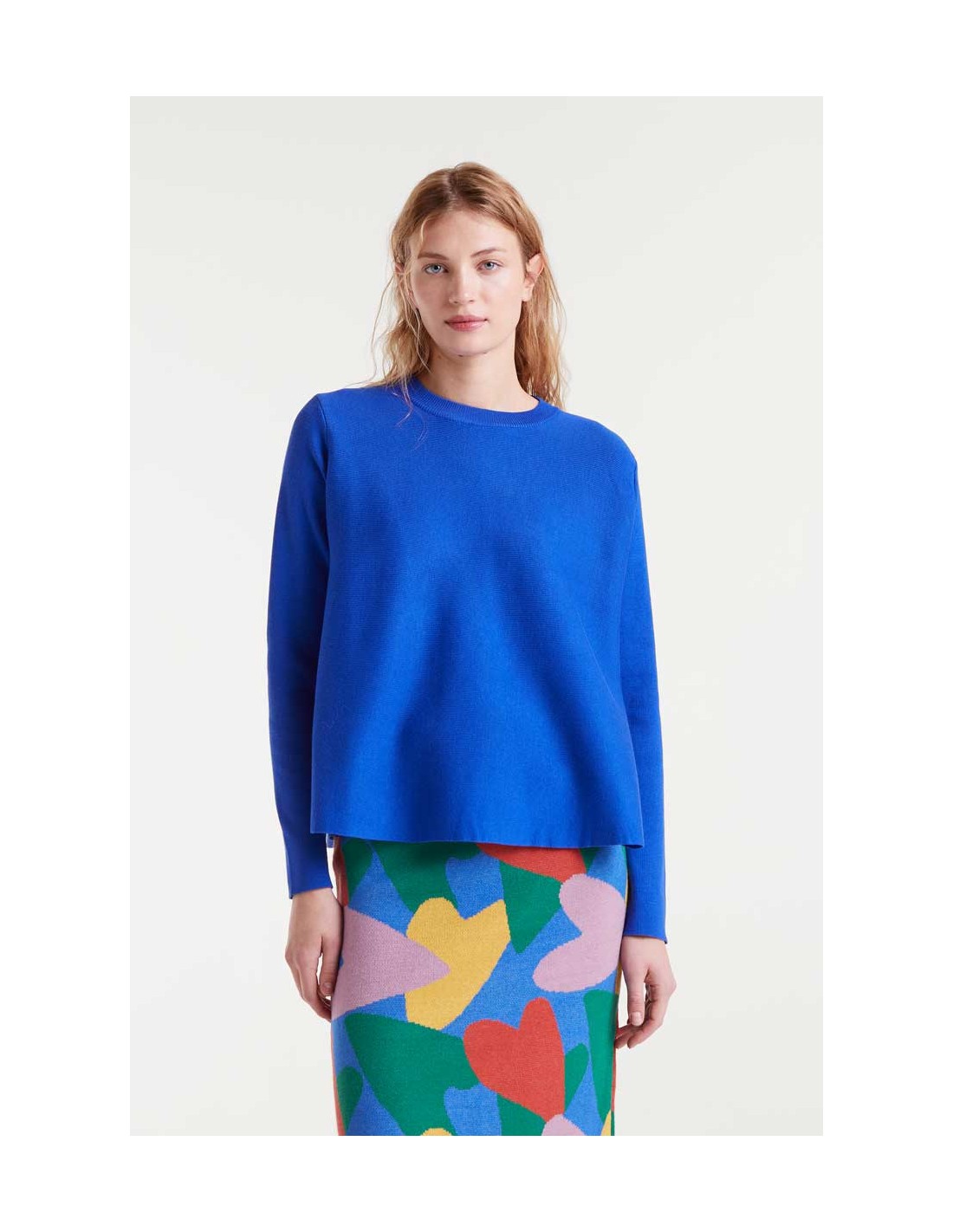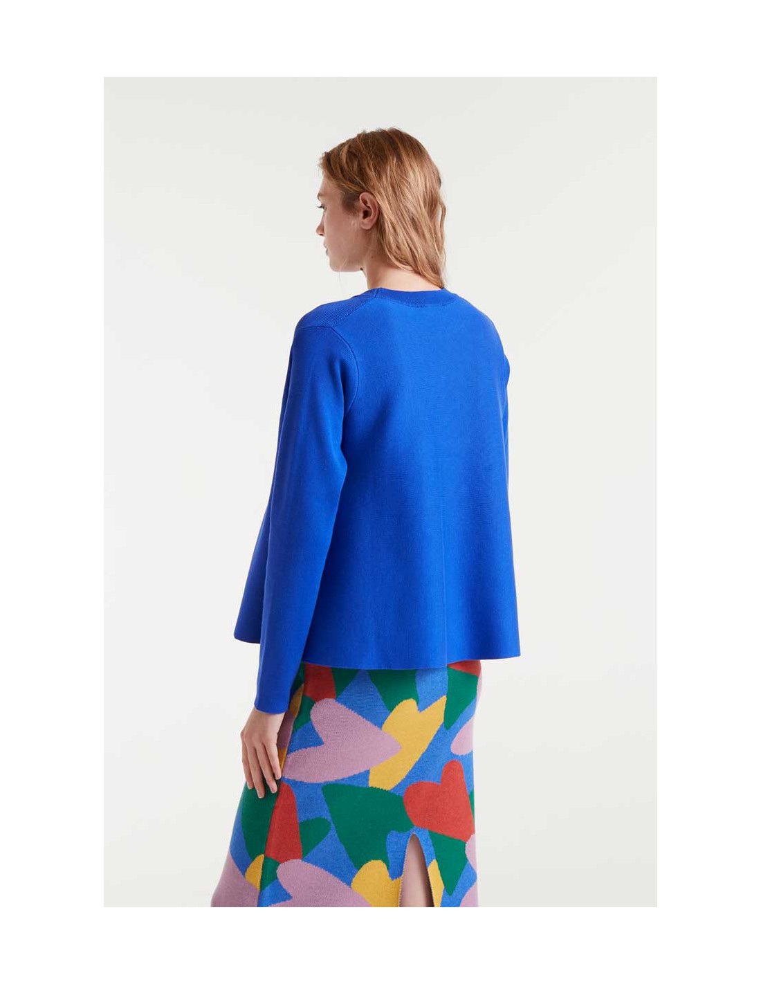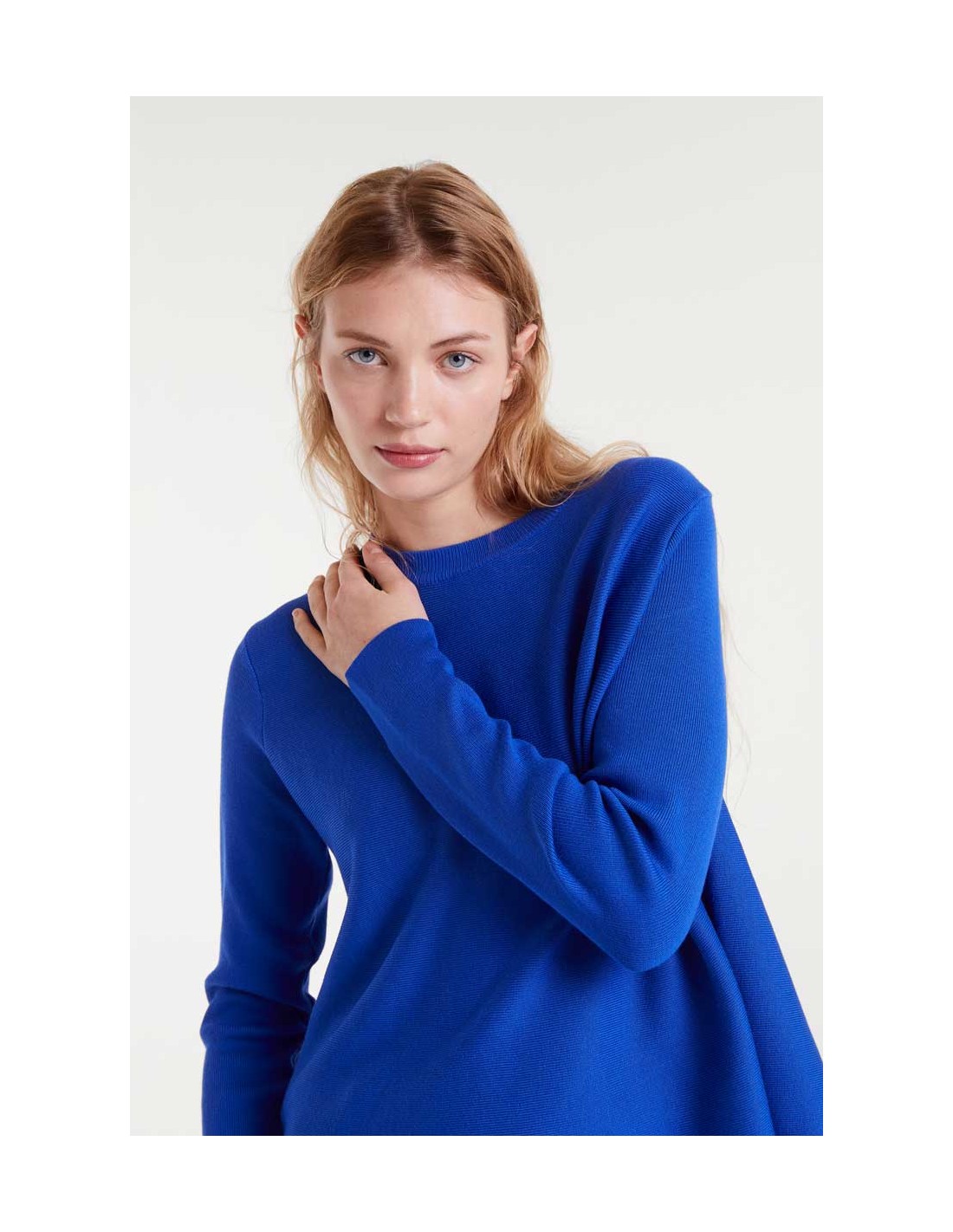 Jersey de punto con corte evasé de color azul. Con cuello redondo y manga larga.