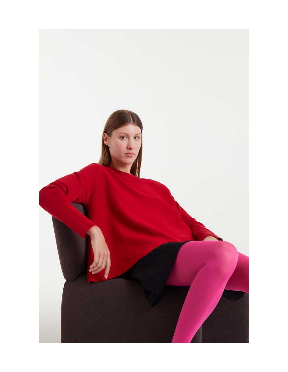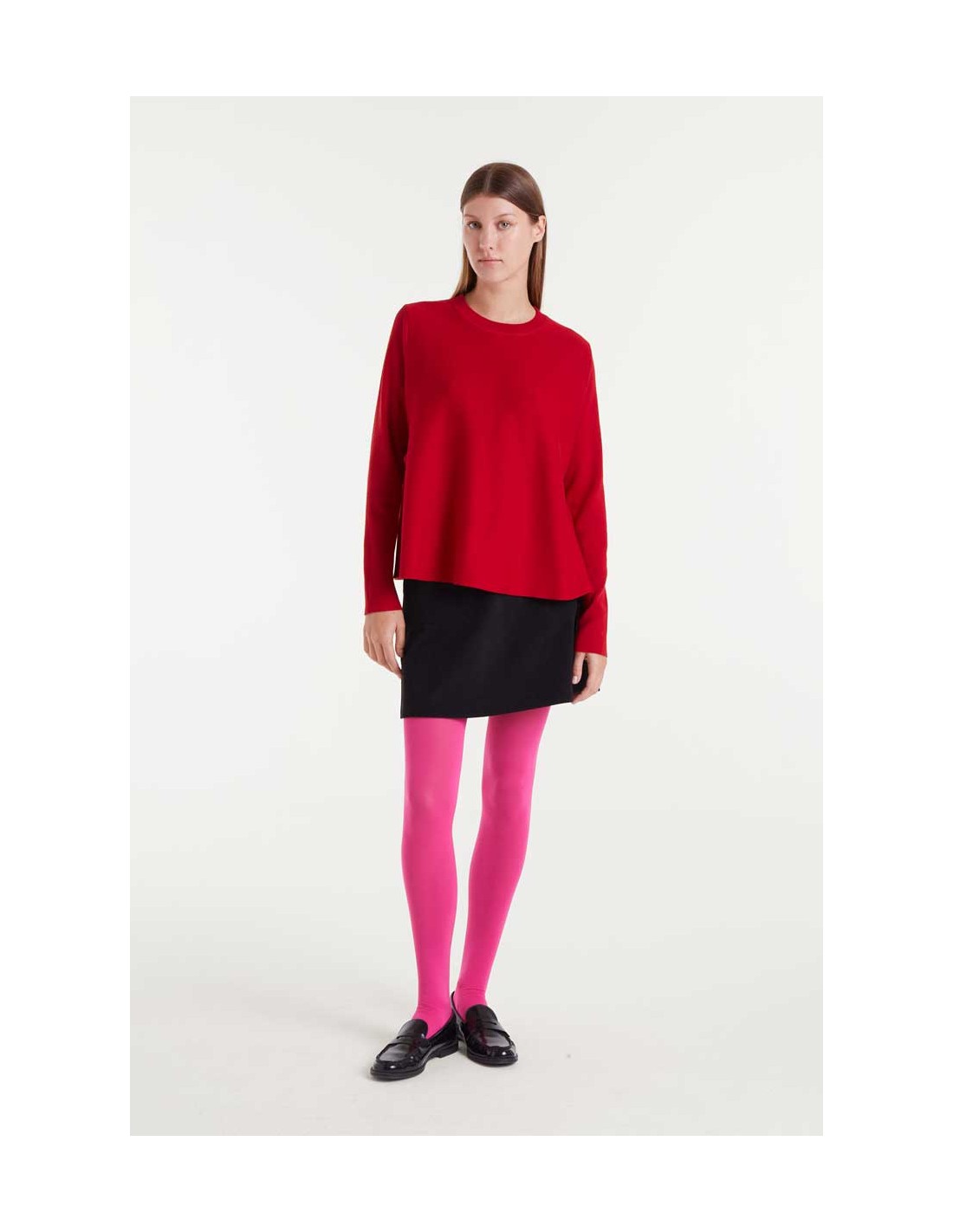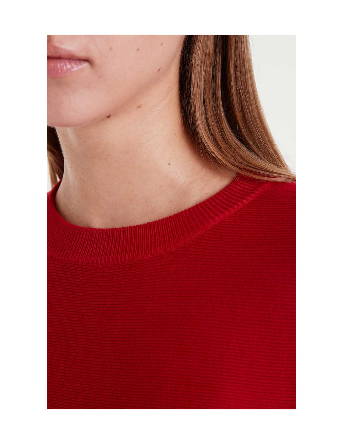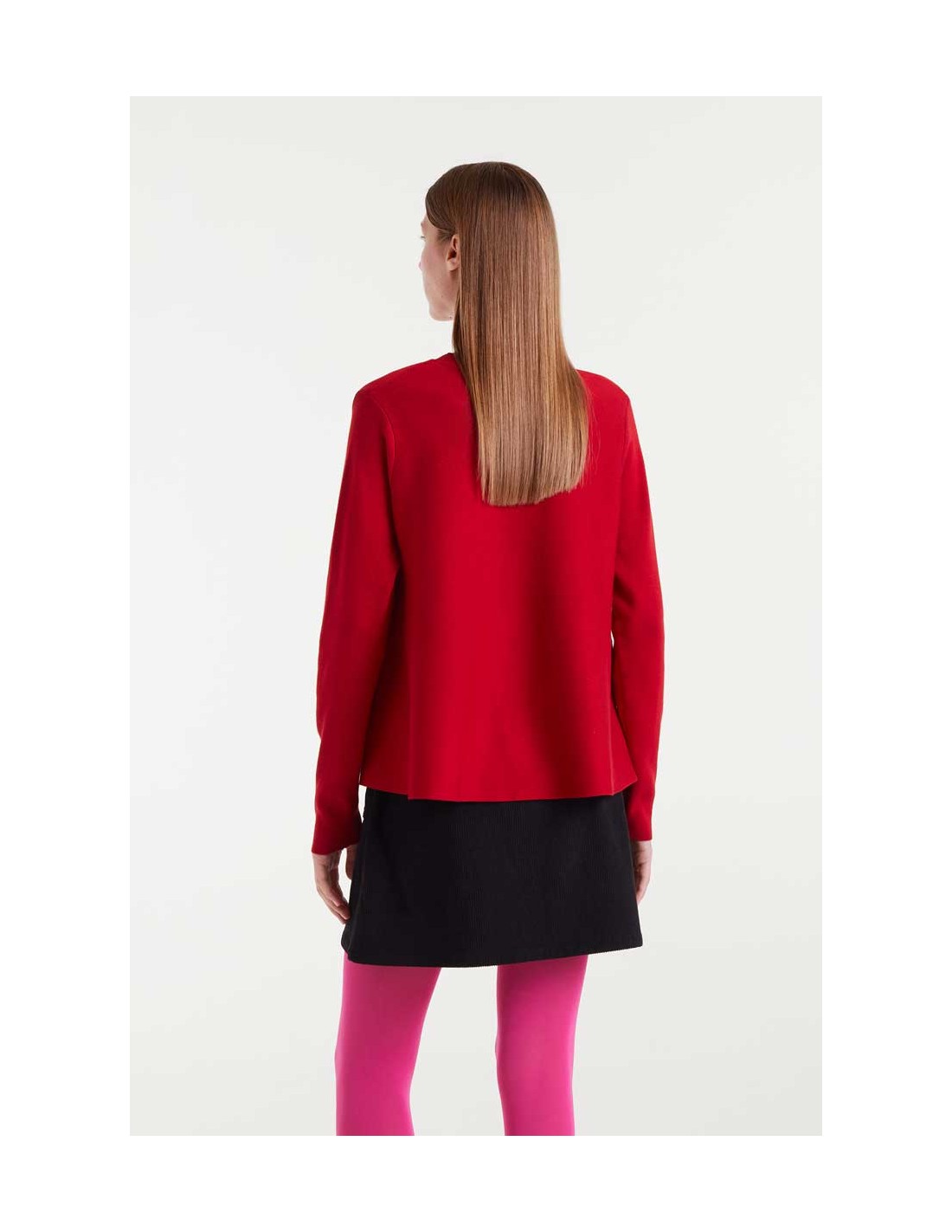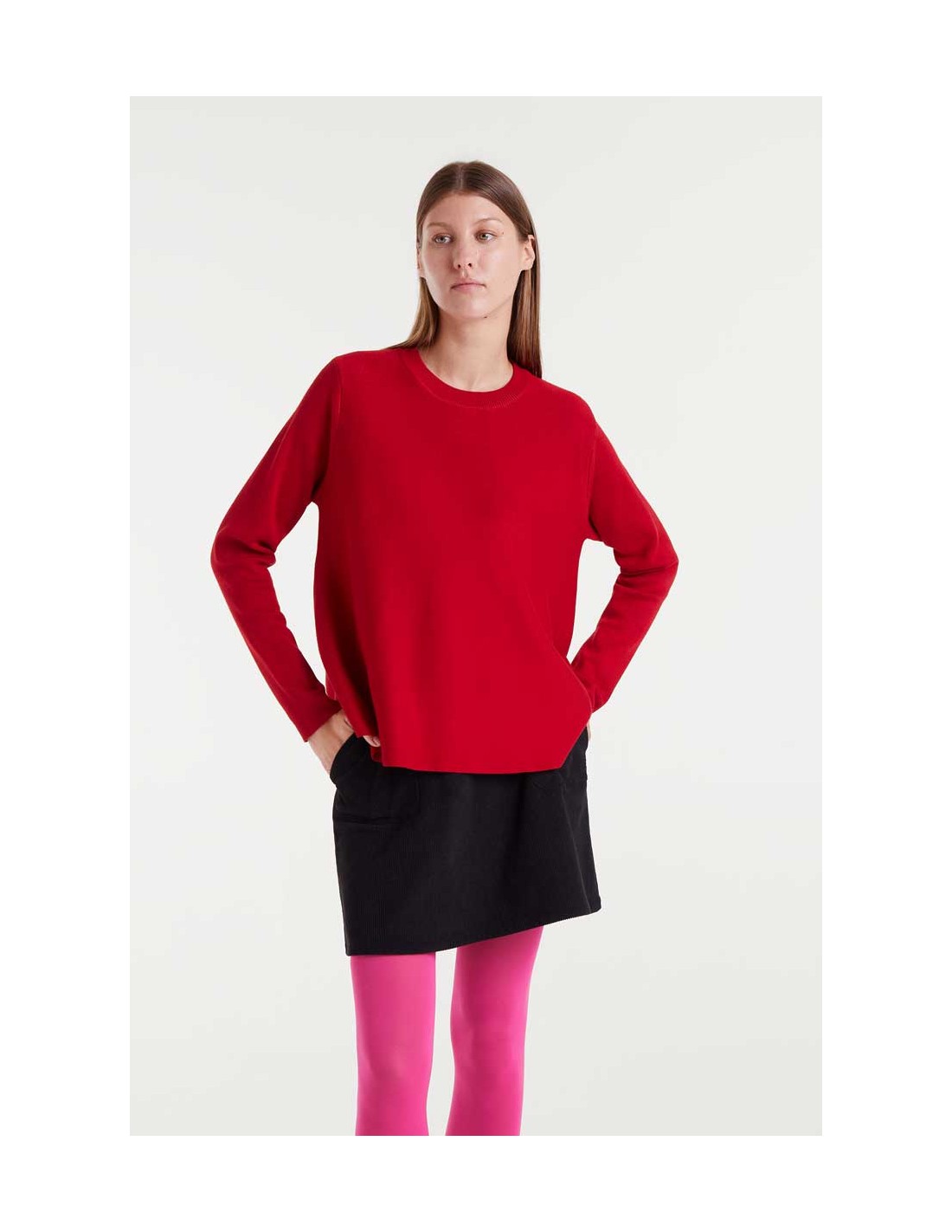 ersey de punto con corte evasé de color rojo. Con cuello redondo y manga larga.