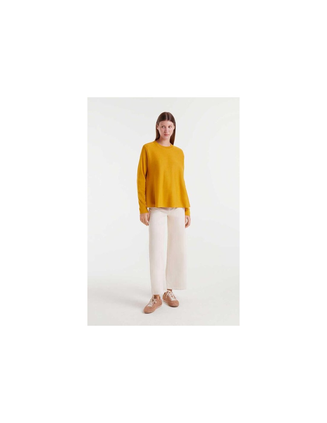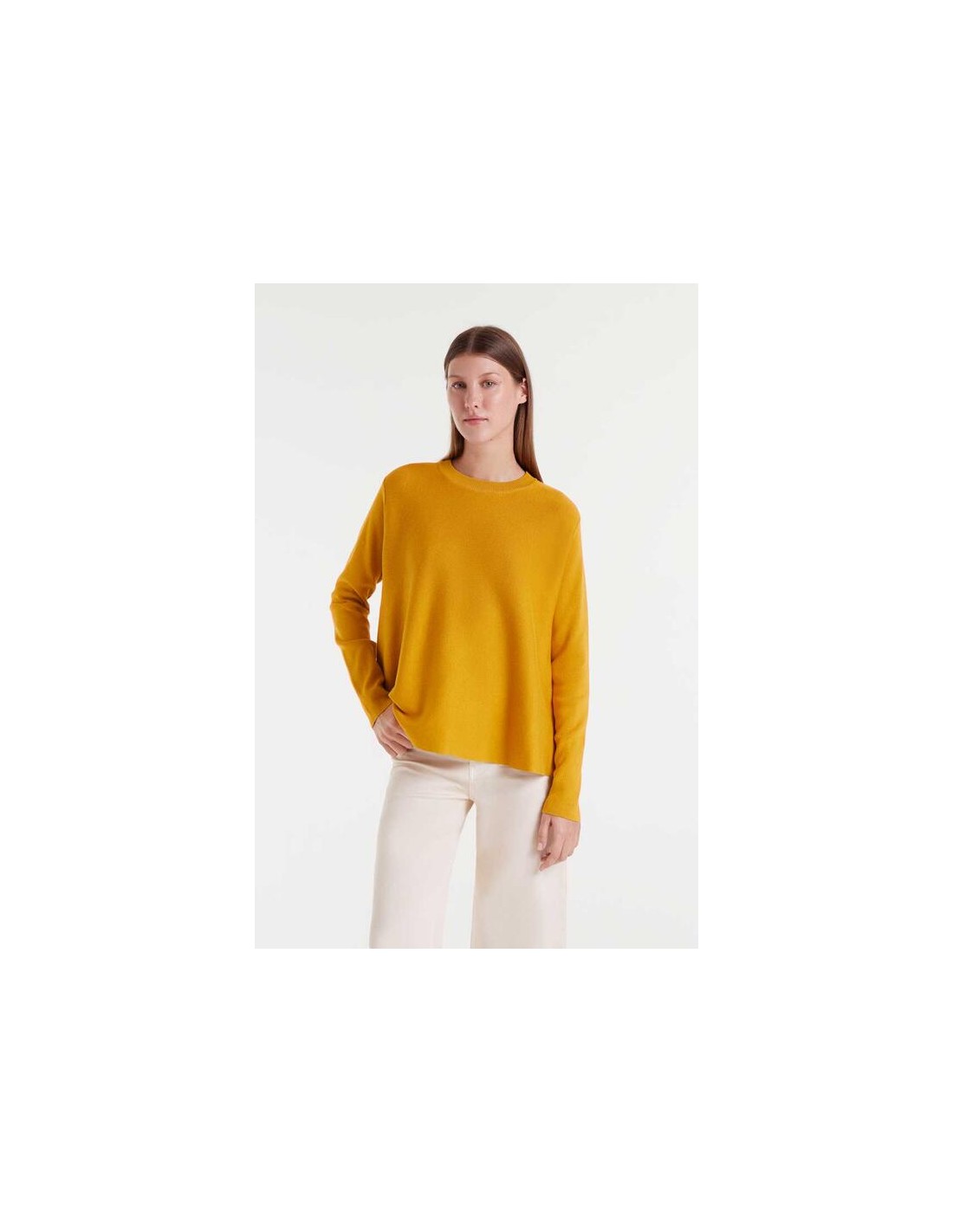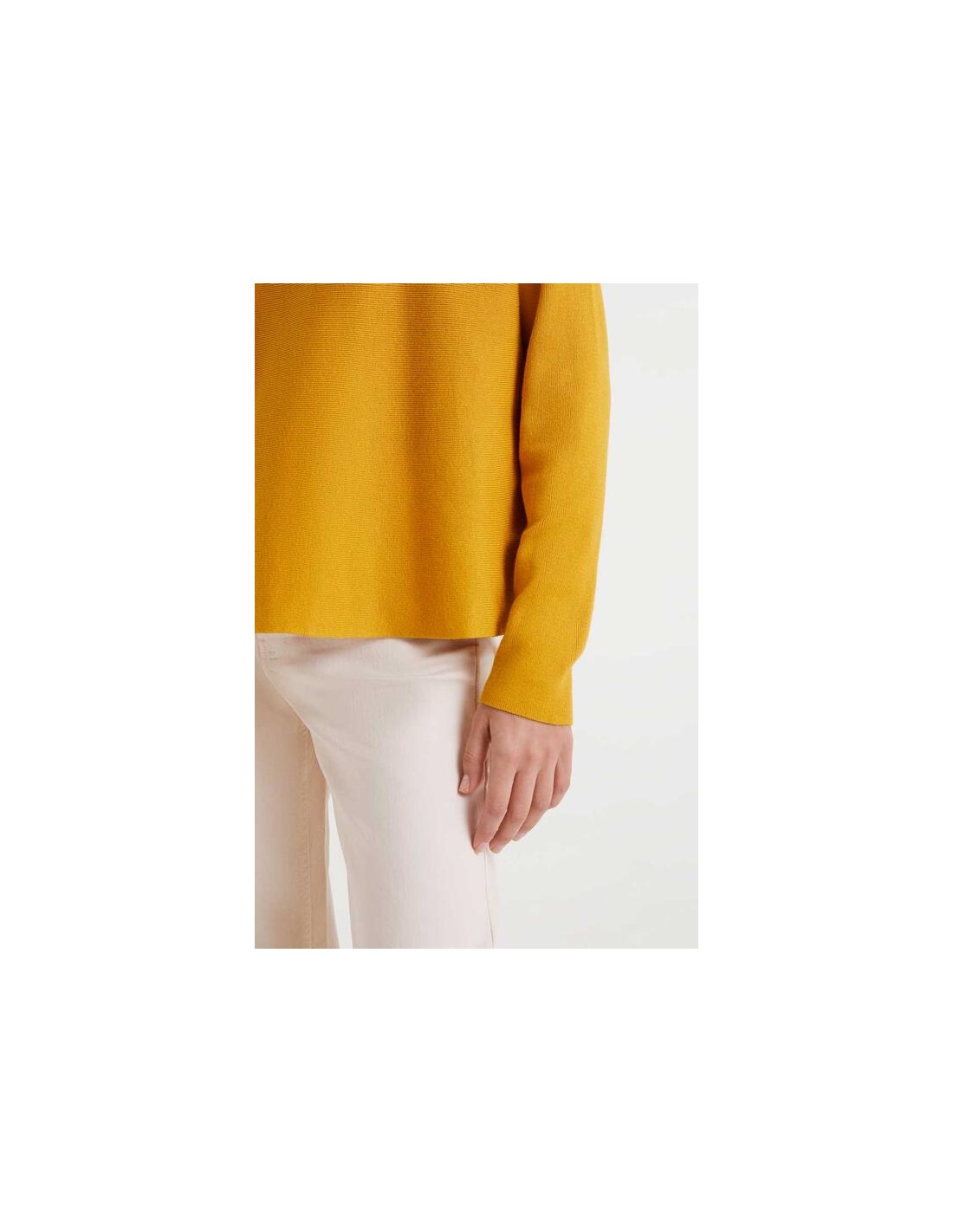 Jersey de punto con corte envasé de color amarillo. Con cuello redondo y manga larga.