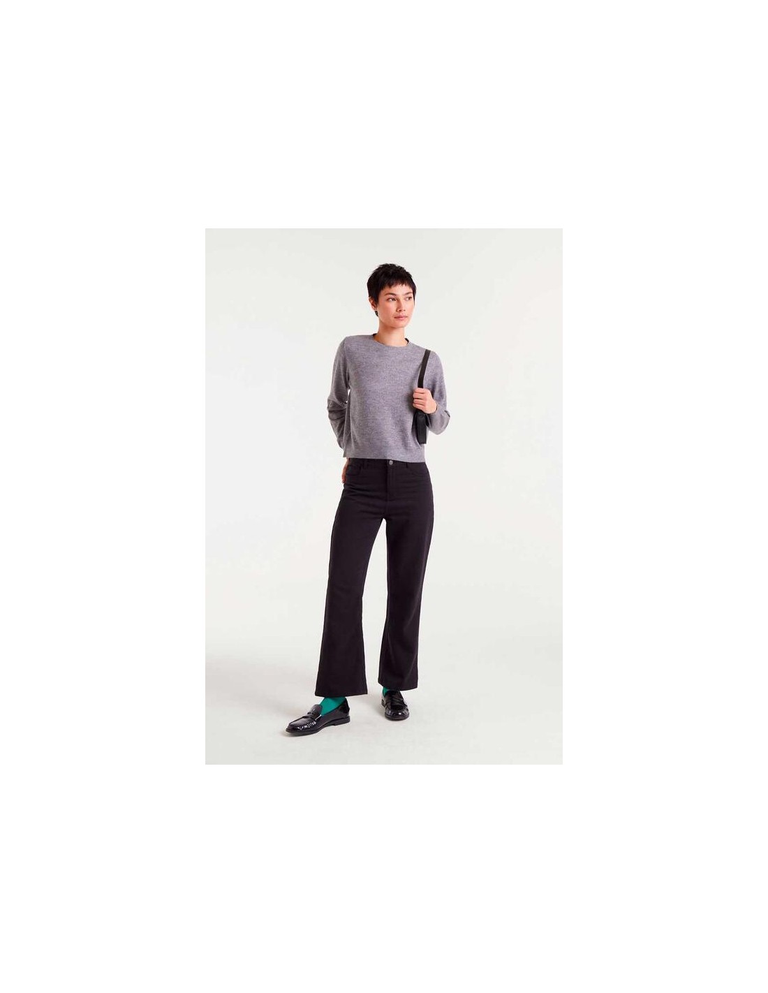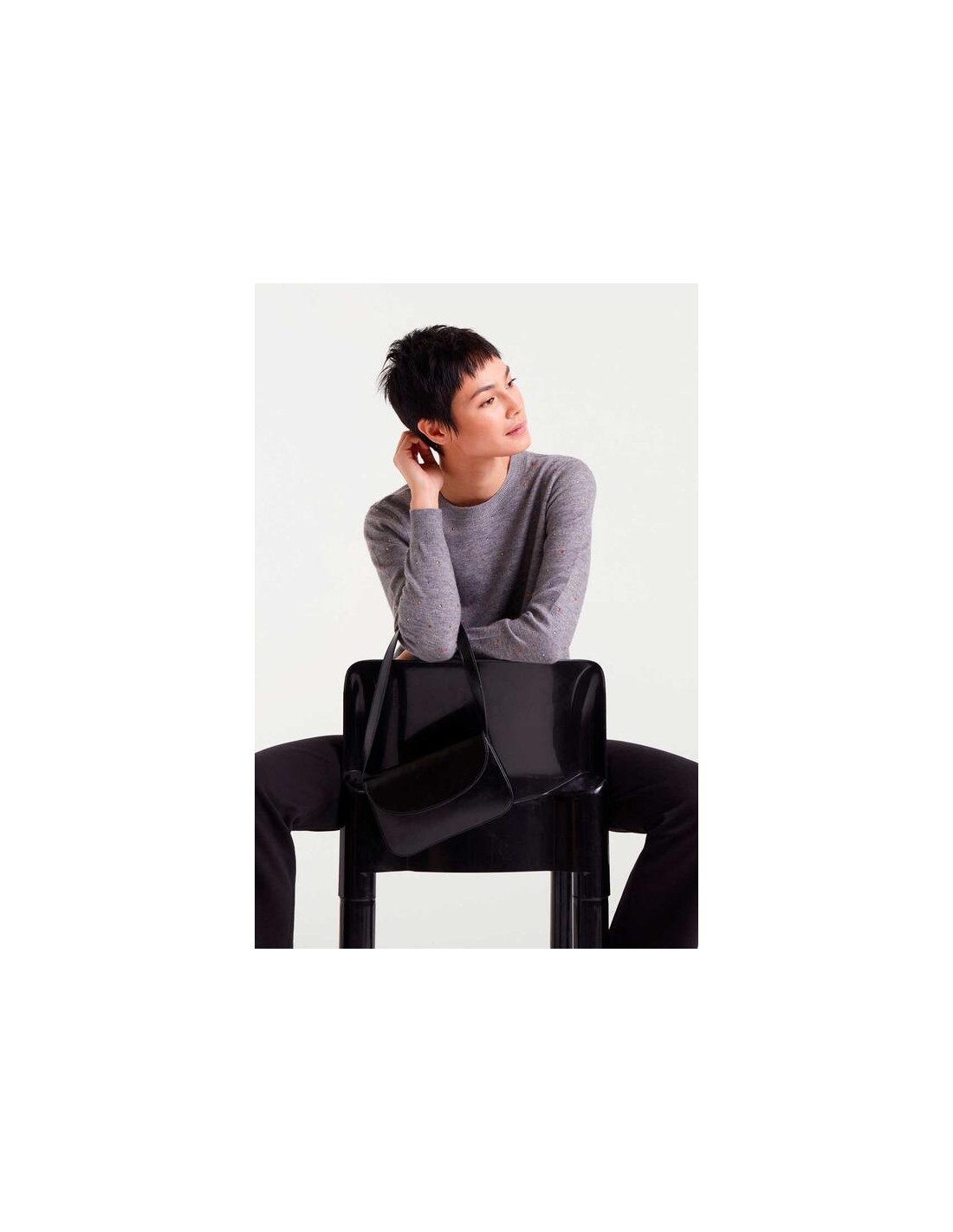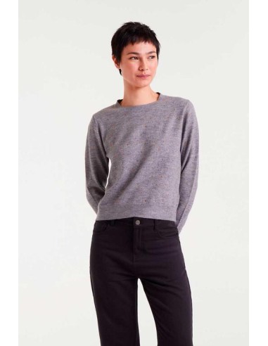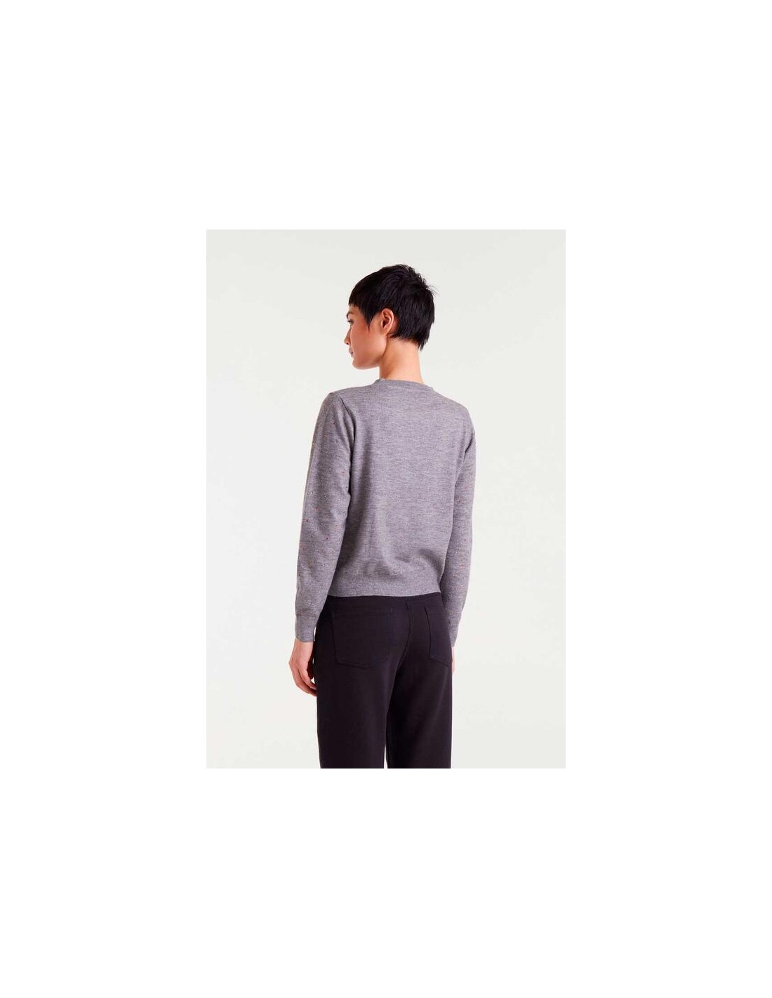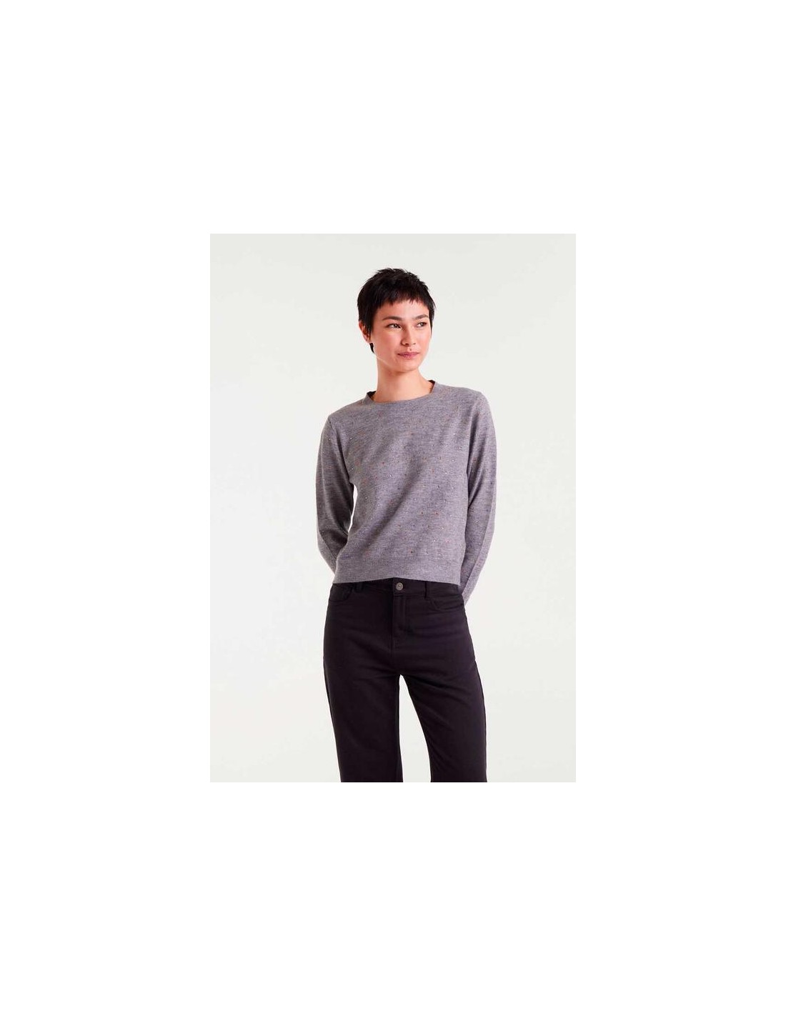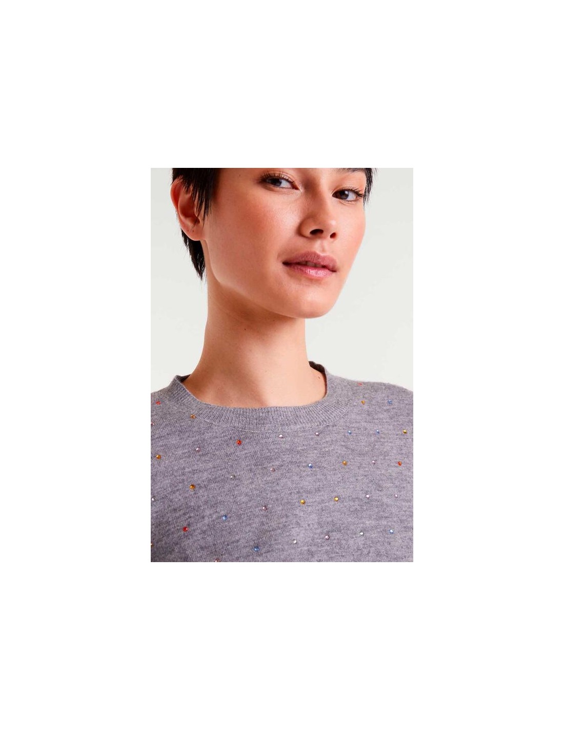 Jersey con tejido punto fino de color gris. Cuello redondo y manga larga. Detalles con aplicaciones brillantes multicolor. Acabados en rib.