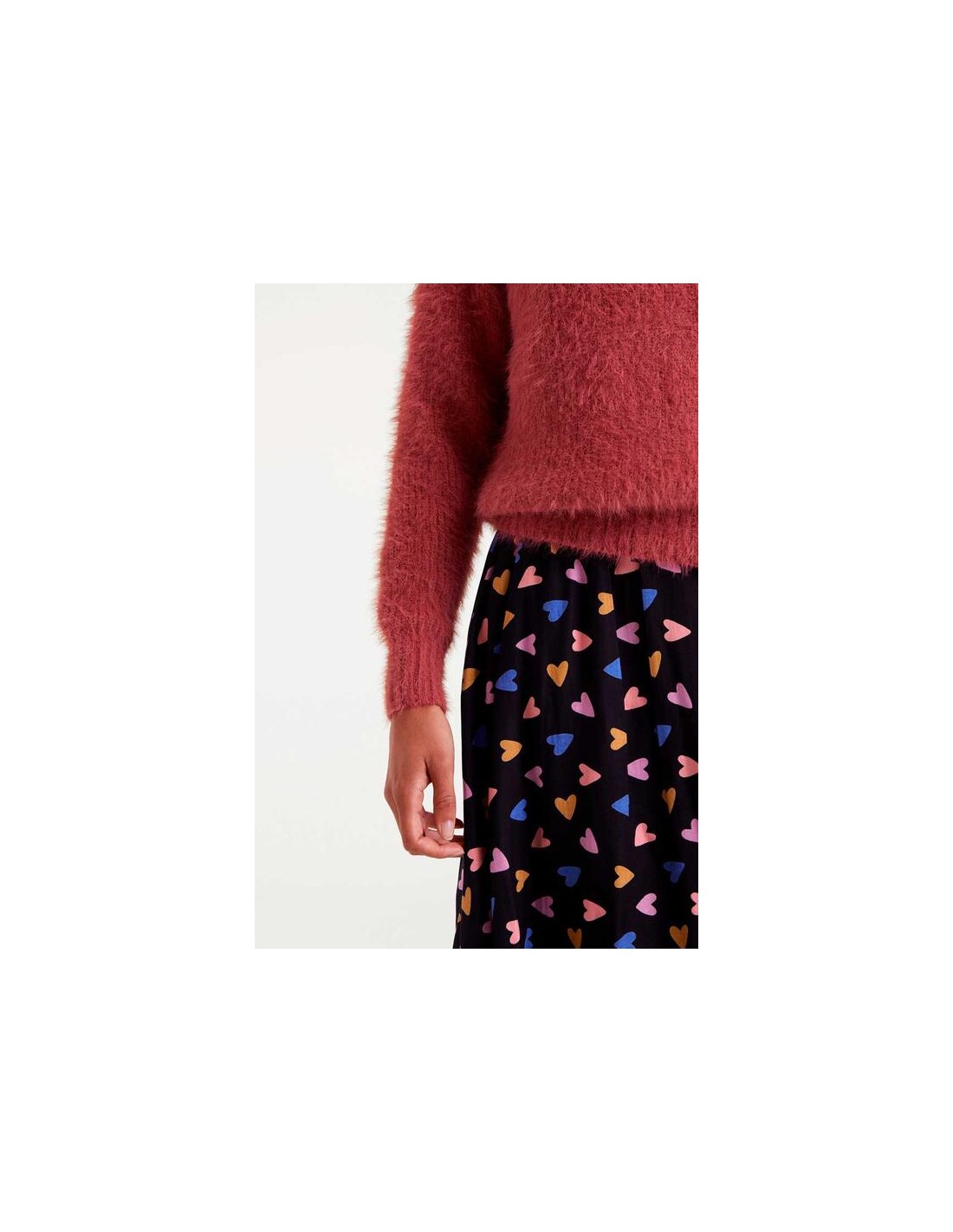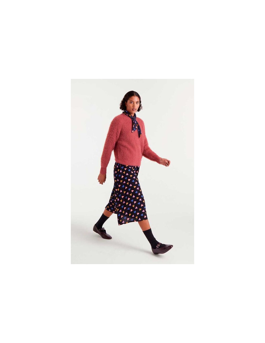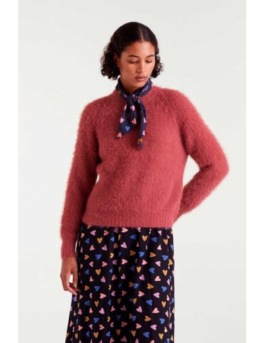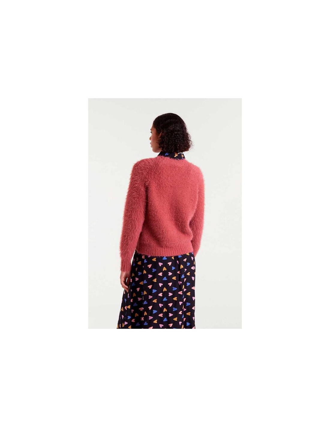 Jersey punto con textura de color rosa. Cuello redondo y manga larga. Detalles en rib.