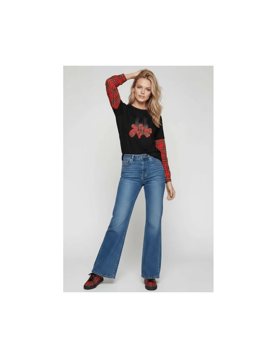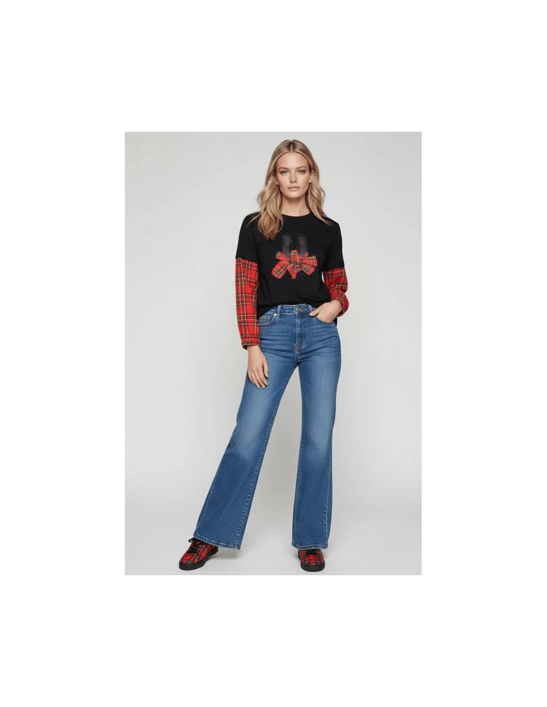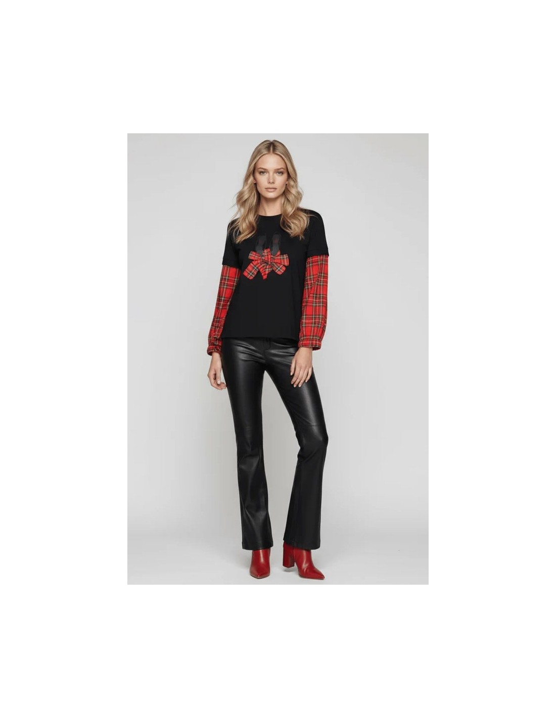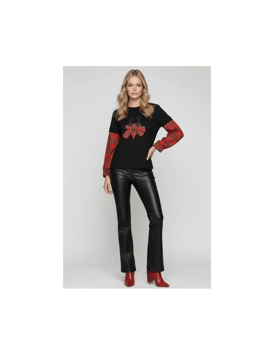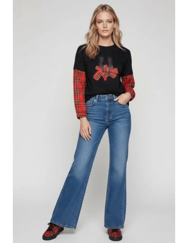Esta camiseta negra de algodón es una obra maestra de diseño: bailarinas con lazo en cuadro escocés rojo por delante, mangas combinadas desde el codo, y una espalda con canesú que te hará girar para que todos vean el diseño completo.