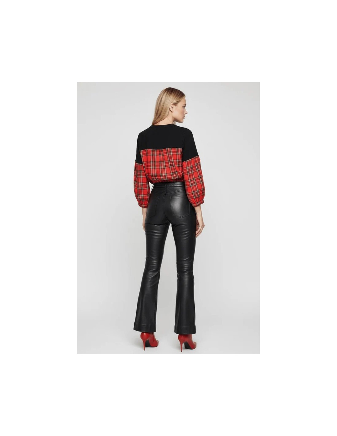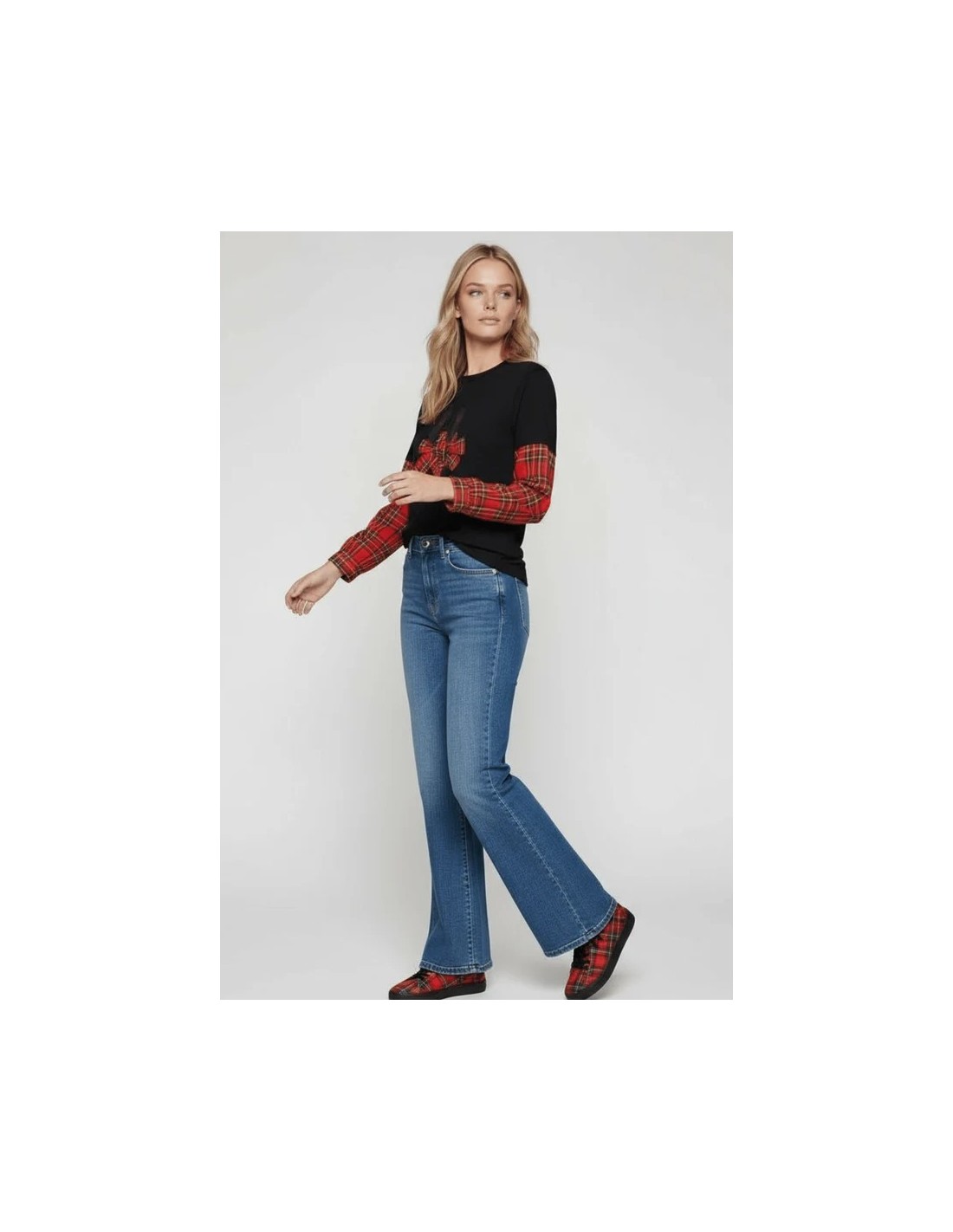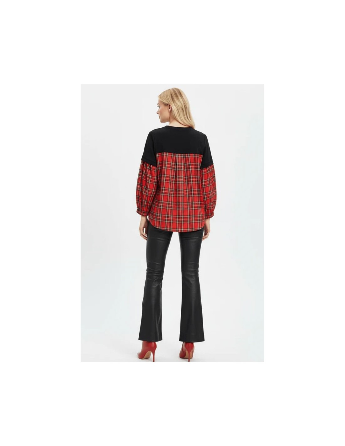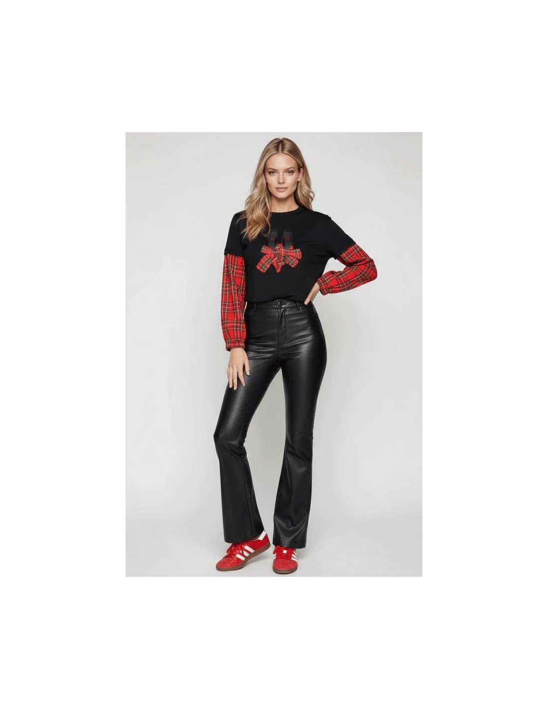 Esta camiseta negra de algodón es una obra maestra de diseño: bailarinas con lazo en cuadro escocés rojo por delante, mangas combinadas desde el codo, y una espalda con canesú que te hará girar para que todos vean el diseño completo.