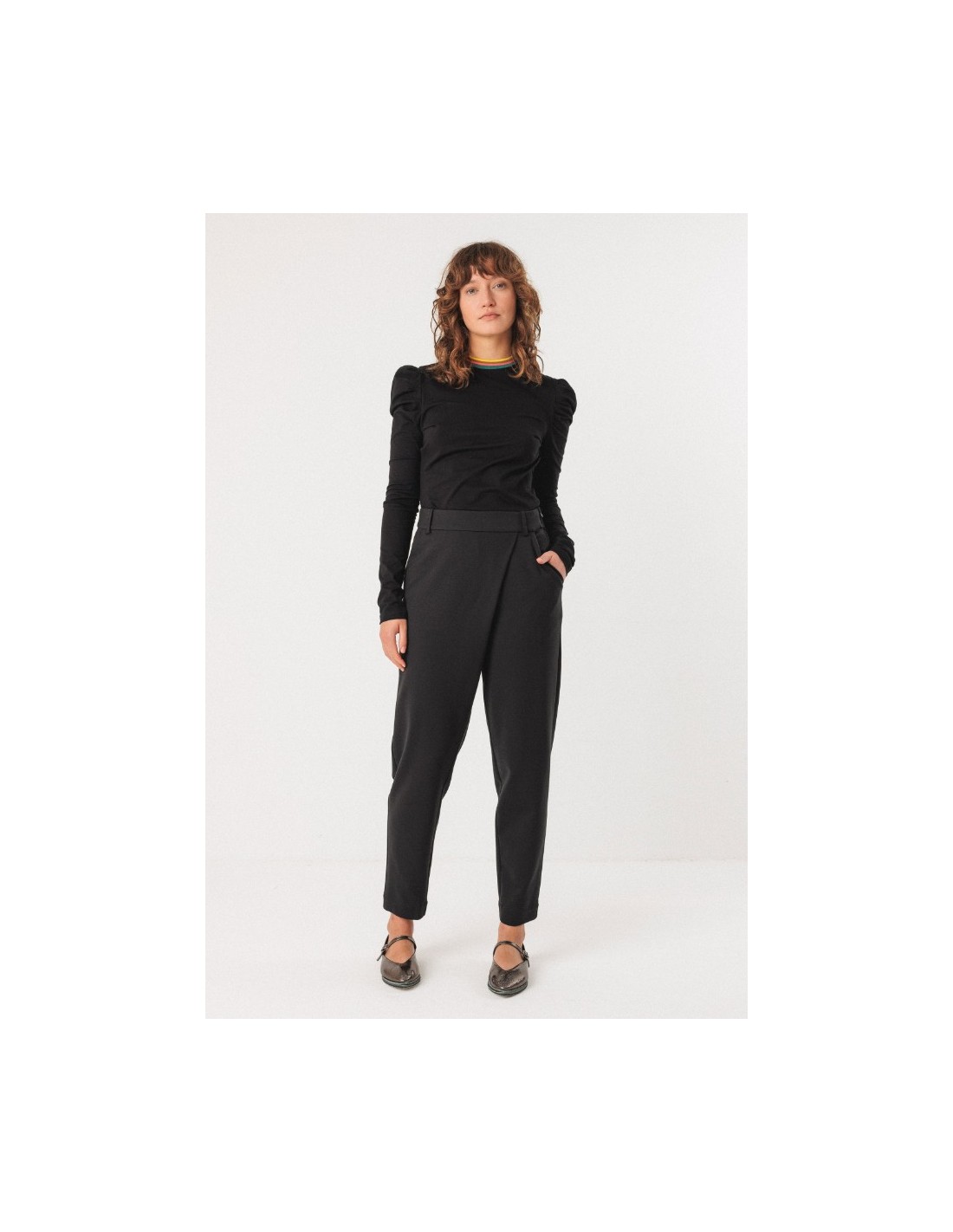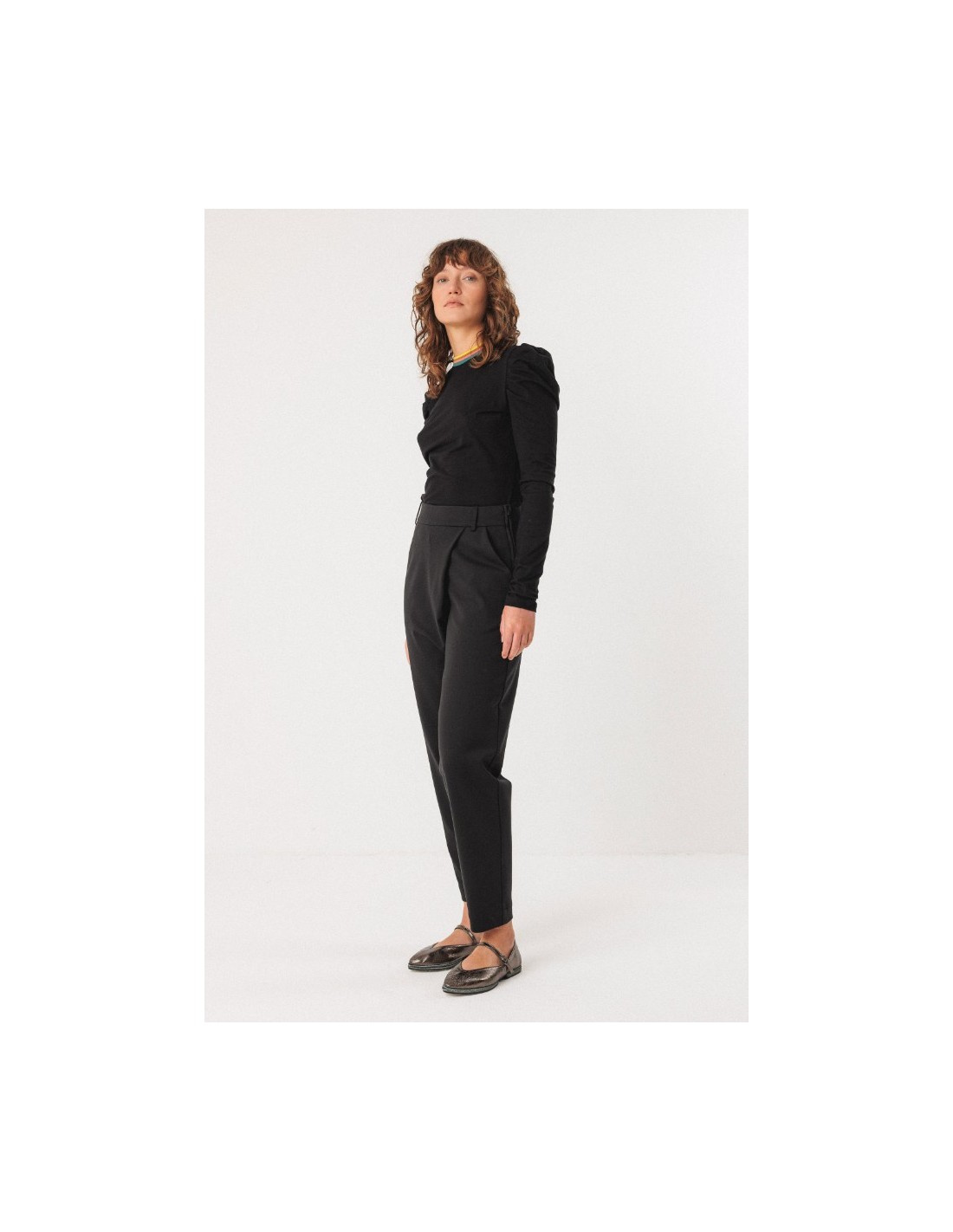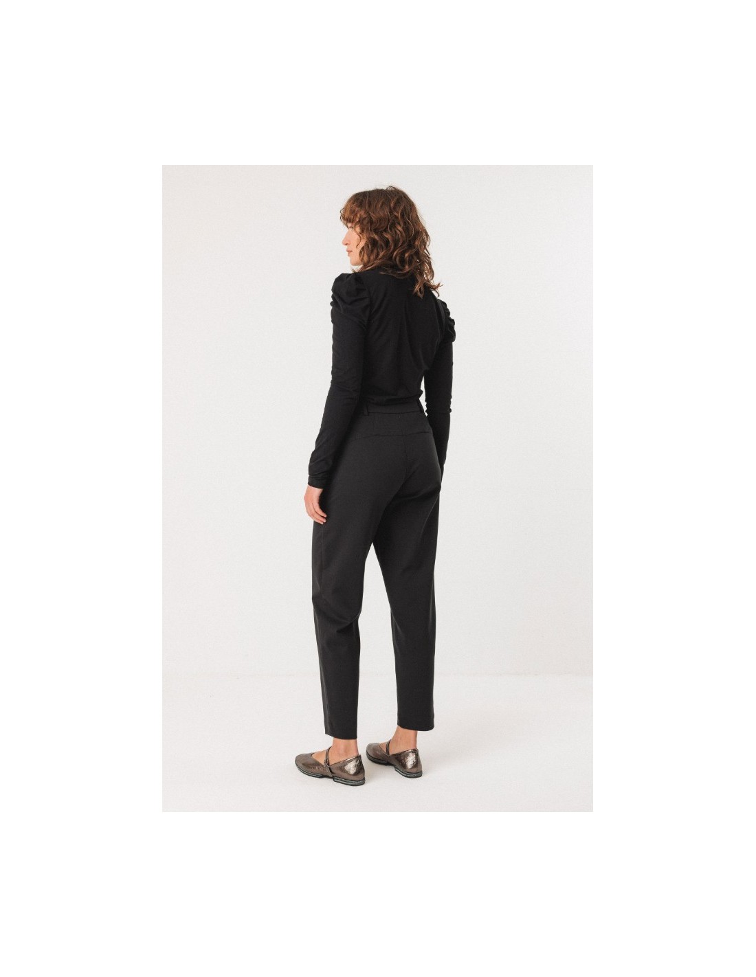 Pantalón carrot con cintura estándar, bolsillos al bies y cierre lateral de cremallera. Versión actual de un estilo clásico.