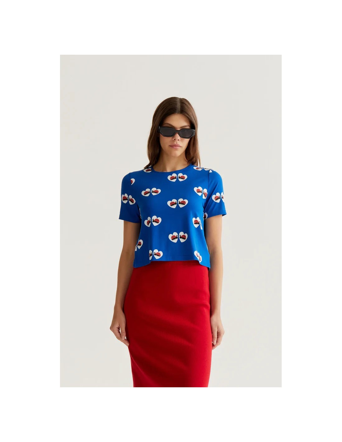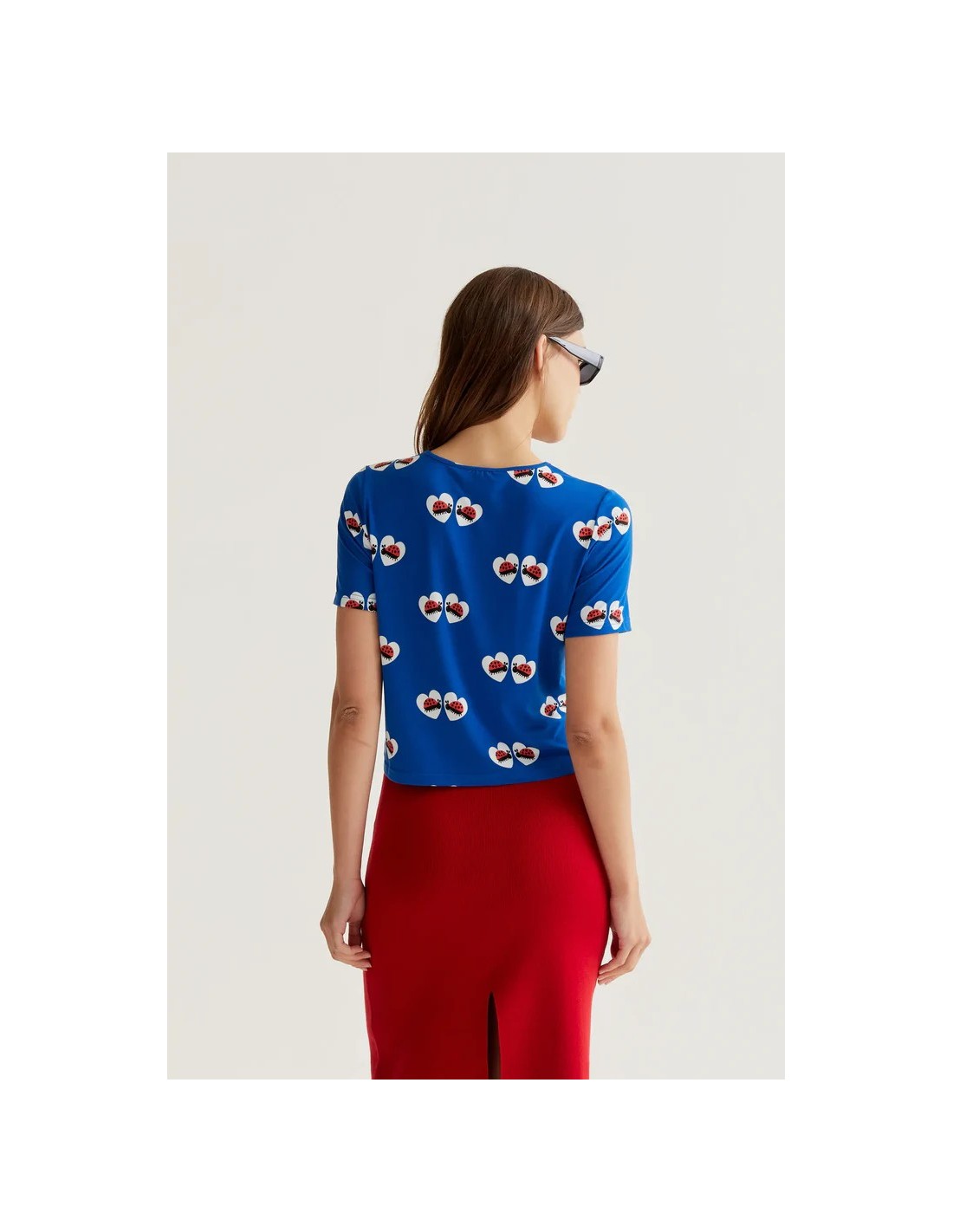 Camiseta con tejido jersey con estampado coccinella. Cuello redondo y manga larga. La modelo mide 177 cm y lleva la talla S.