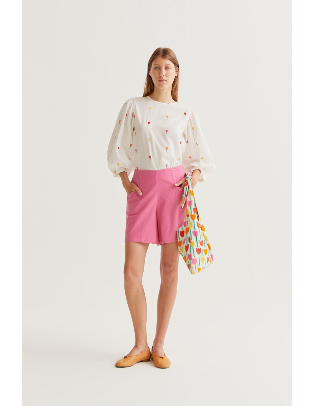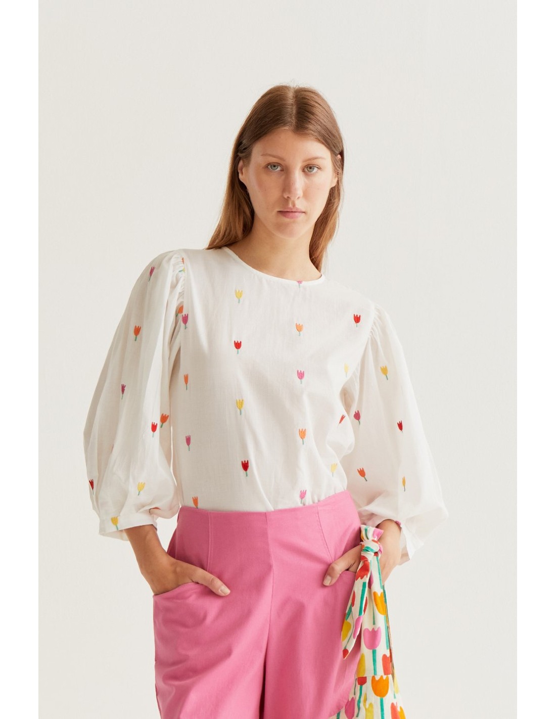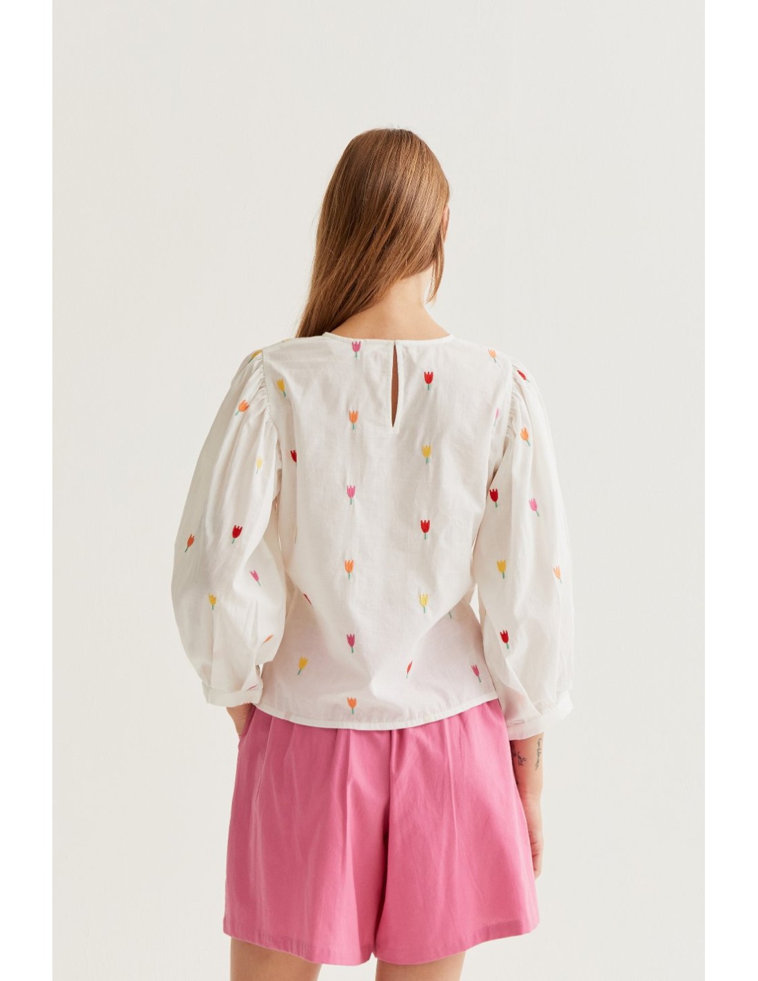 Top 100% algodón con estampado Multi Tulip. Cuello redondo y manga ligeramente abullonada. Cierre posterior con botón oculto.