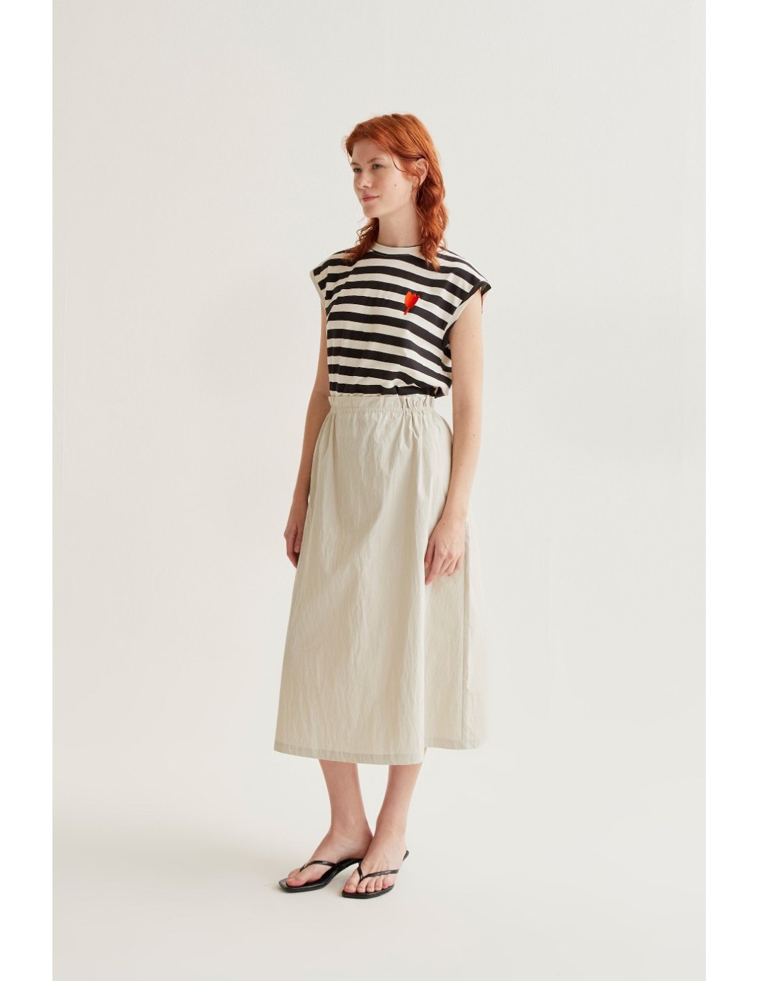 Camiseta de tejido 100% algodón con estampado de rayas blanco y negro. Cuello redondo y manga corta. Detalle bordado de tulipán.