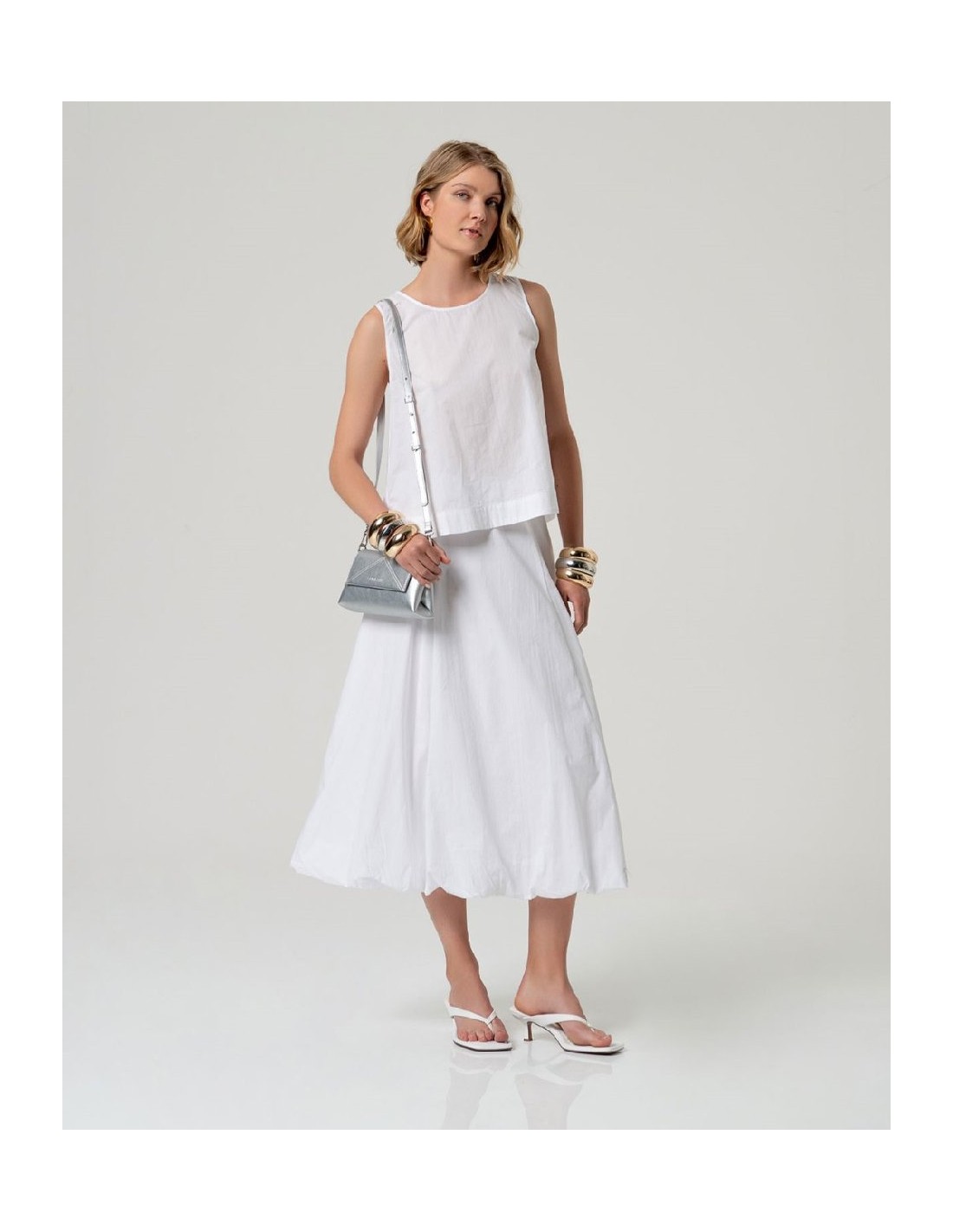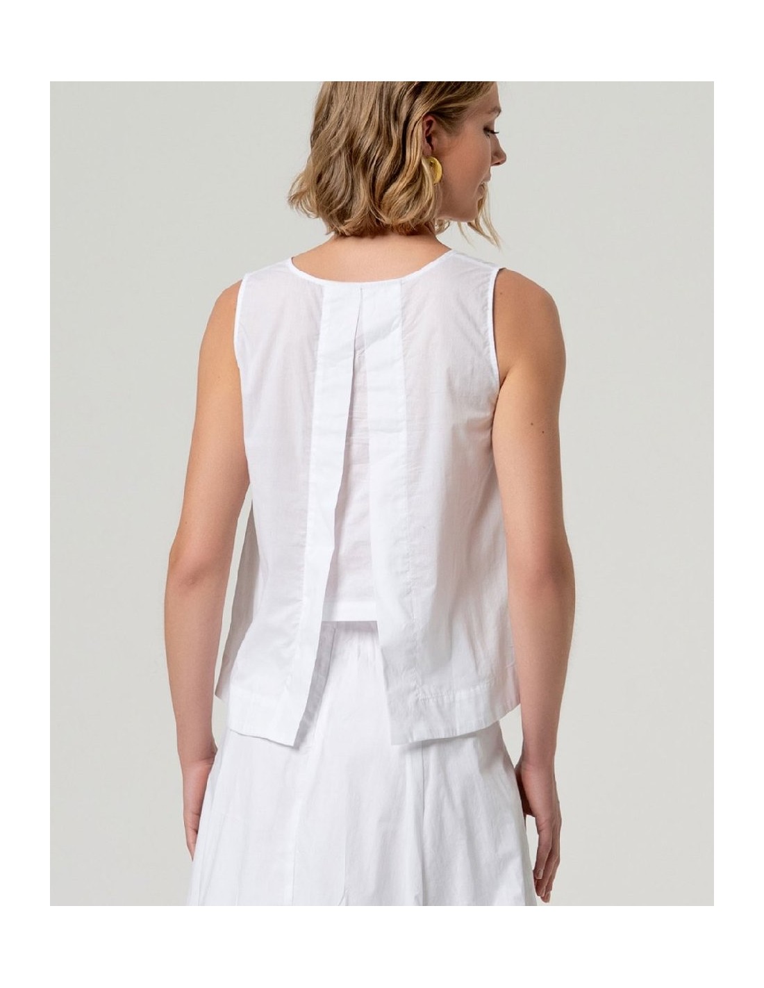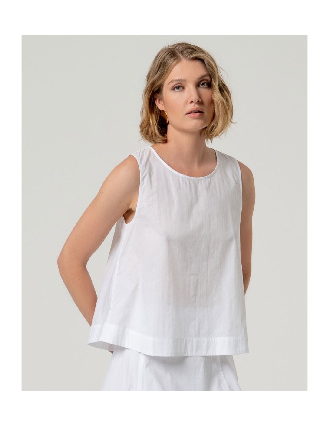 Top sin mangas con escote redondo y silueta recta ligeramente evasé. Diseño limpio con abertura central en la espalda y bajo recto. Confeccionado en tejido ligero 100% algodón.