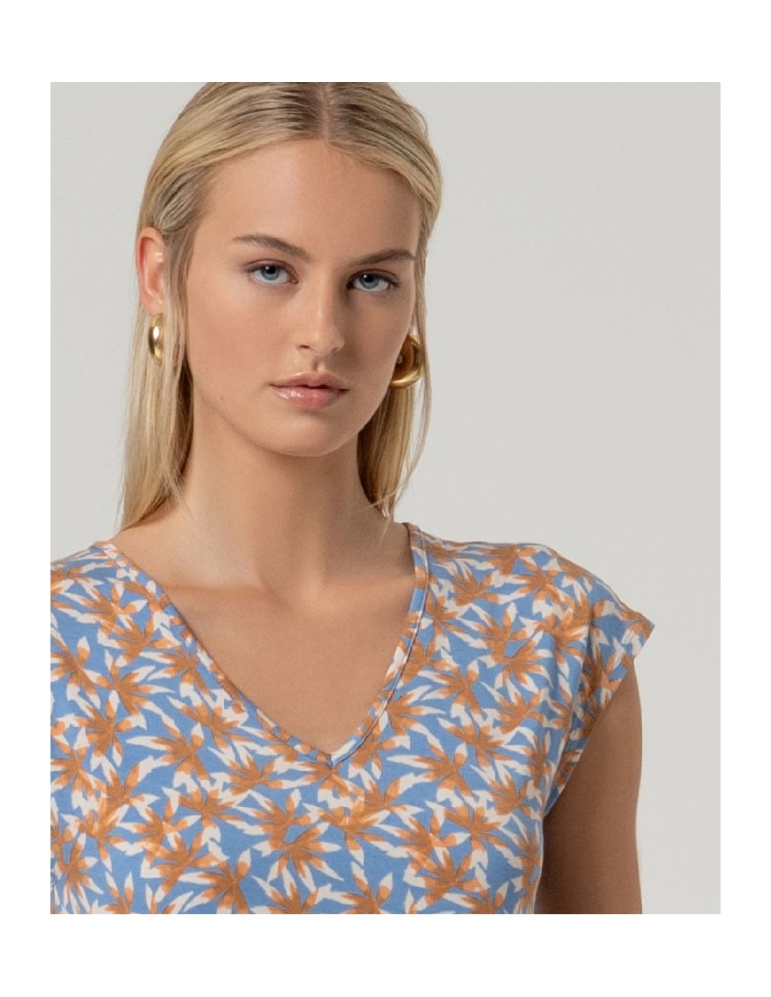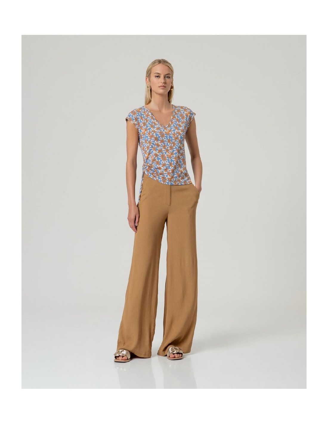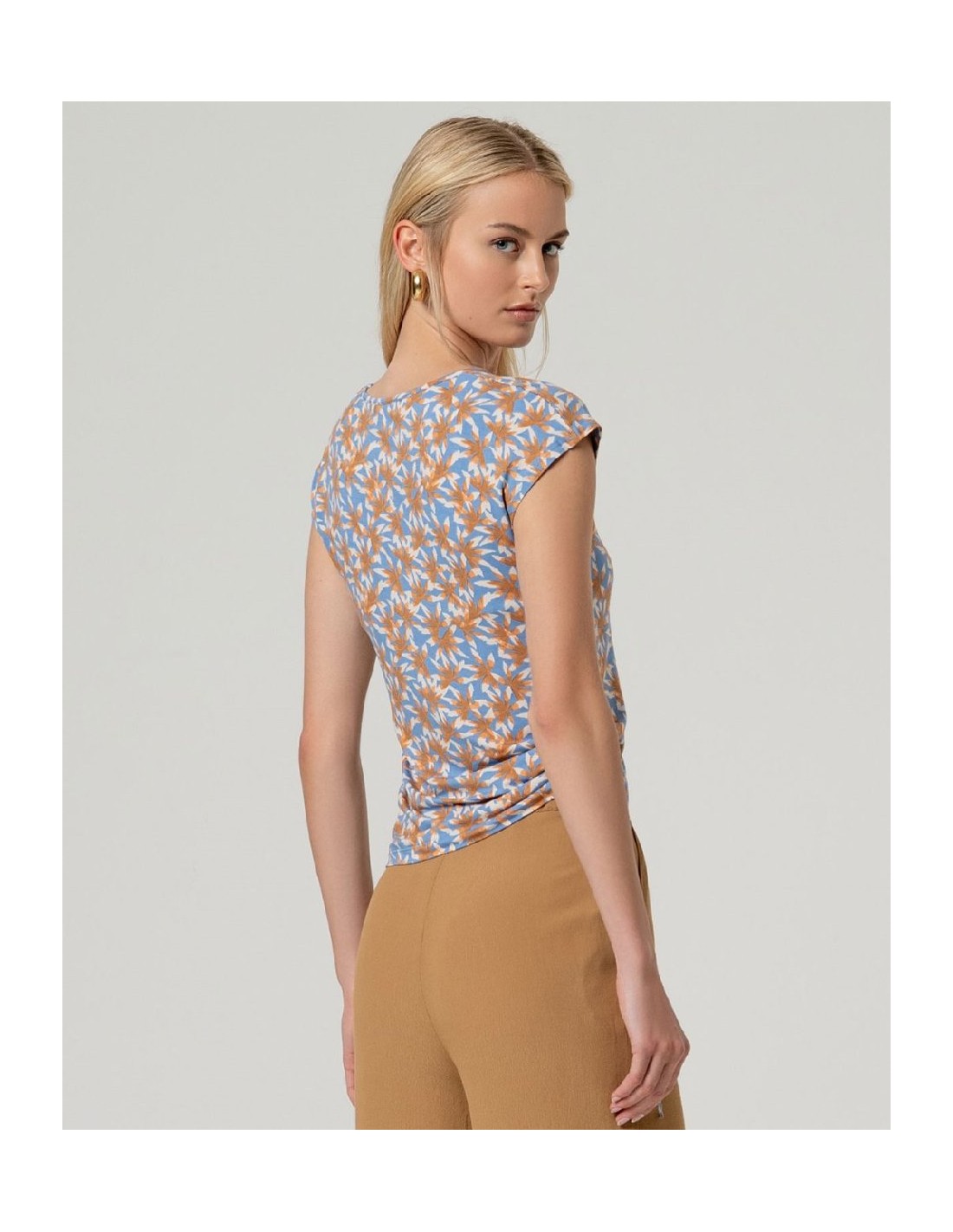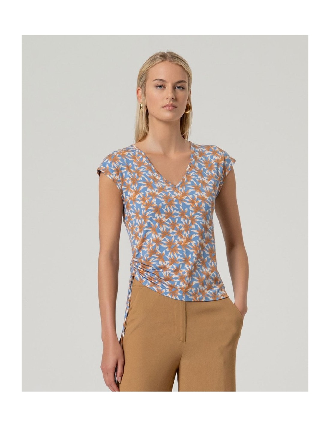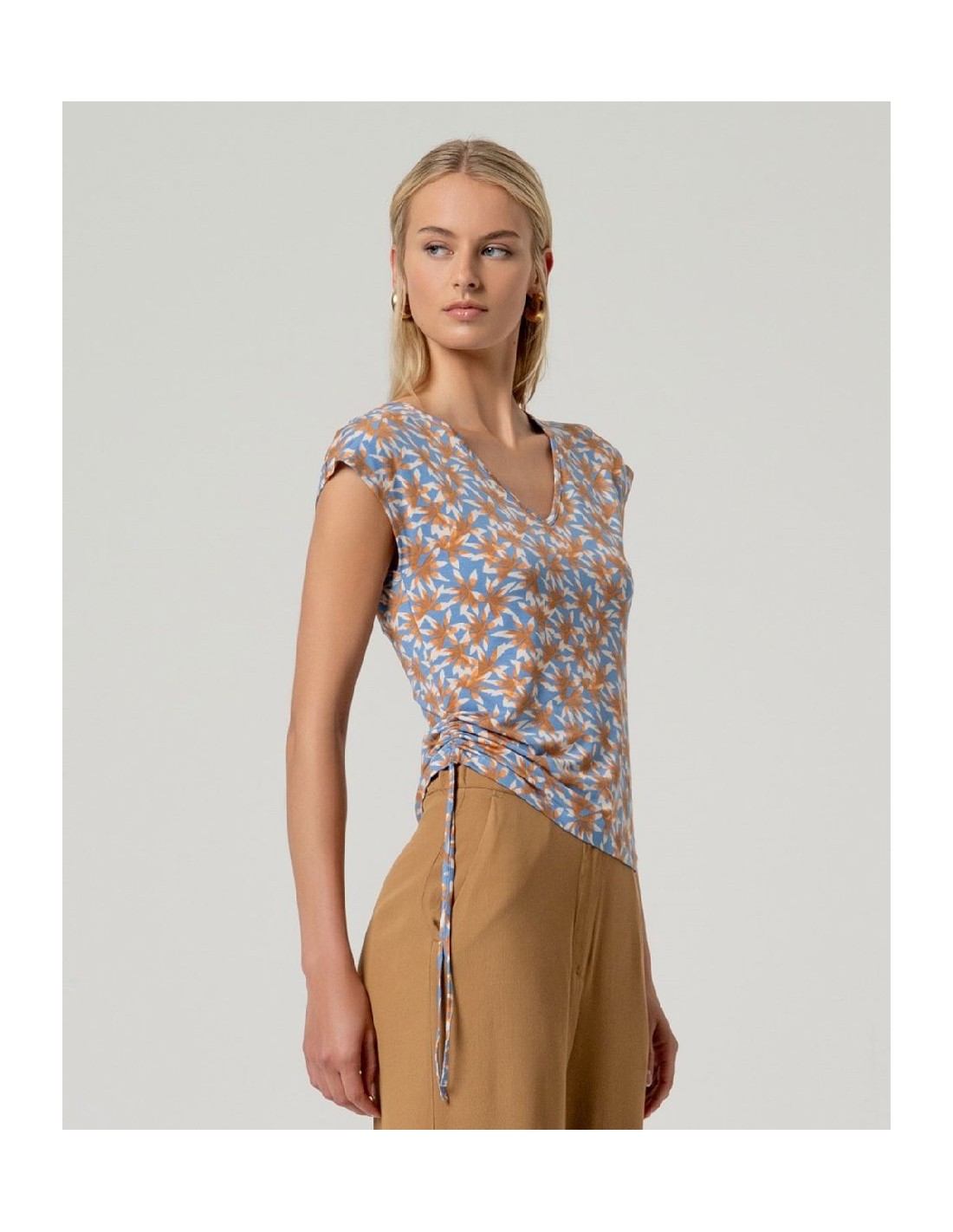 Camiseta sin mangas con escote pico. Diseño estampado con fruncido lateral ajustable mediante lazada. Confeccionada en aloe vera y elastano. Camiseta sin mangas aloe vera lazada lateral