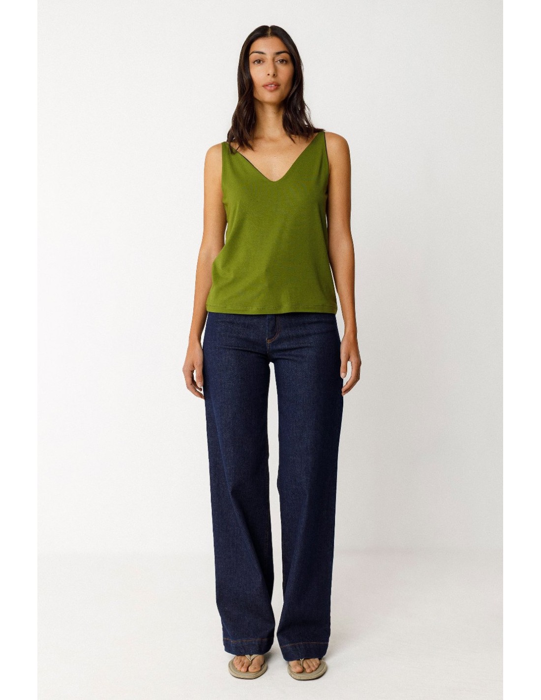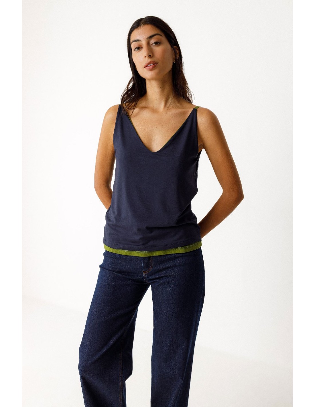 Camiseta reversible de tirantes de corte recto y cuello de pico.