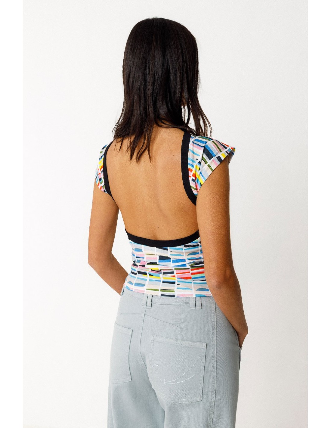 Camiseta sin mangas de corte ceñido y cuello barco con escote en la espalda. Colaboración con el artista Grems.
