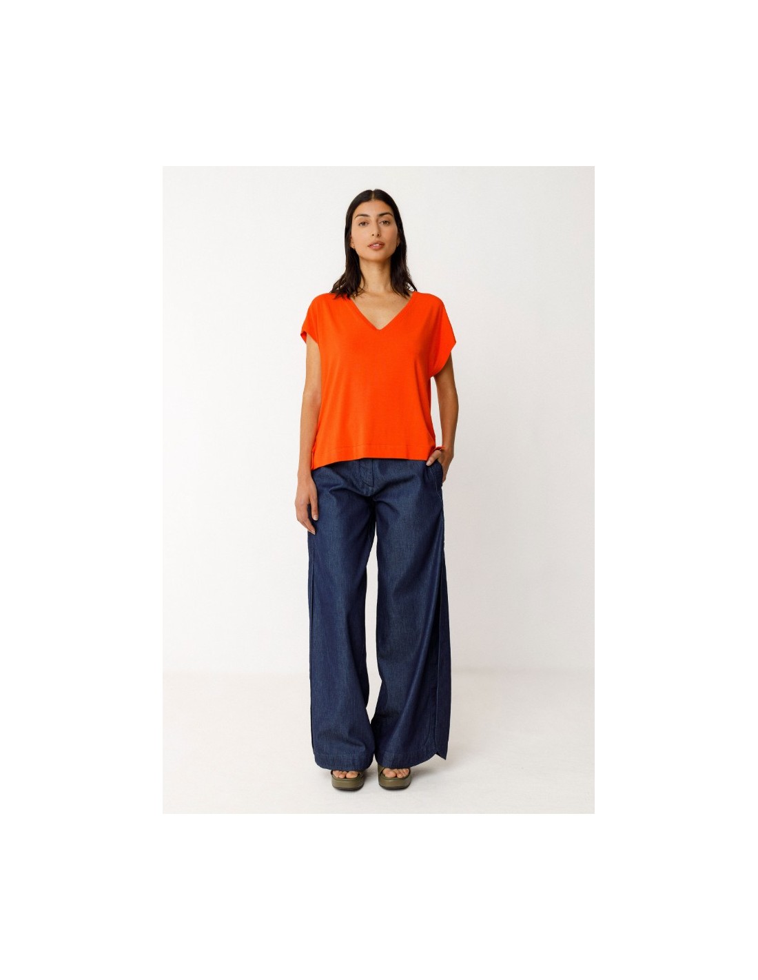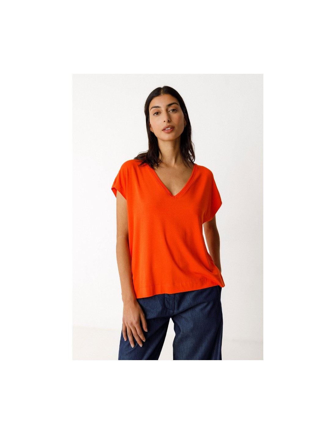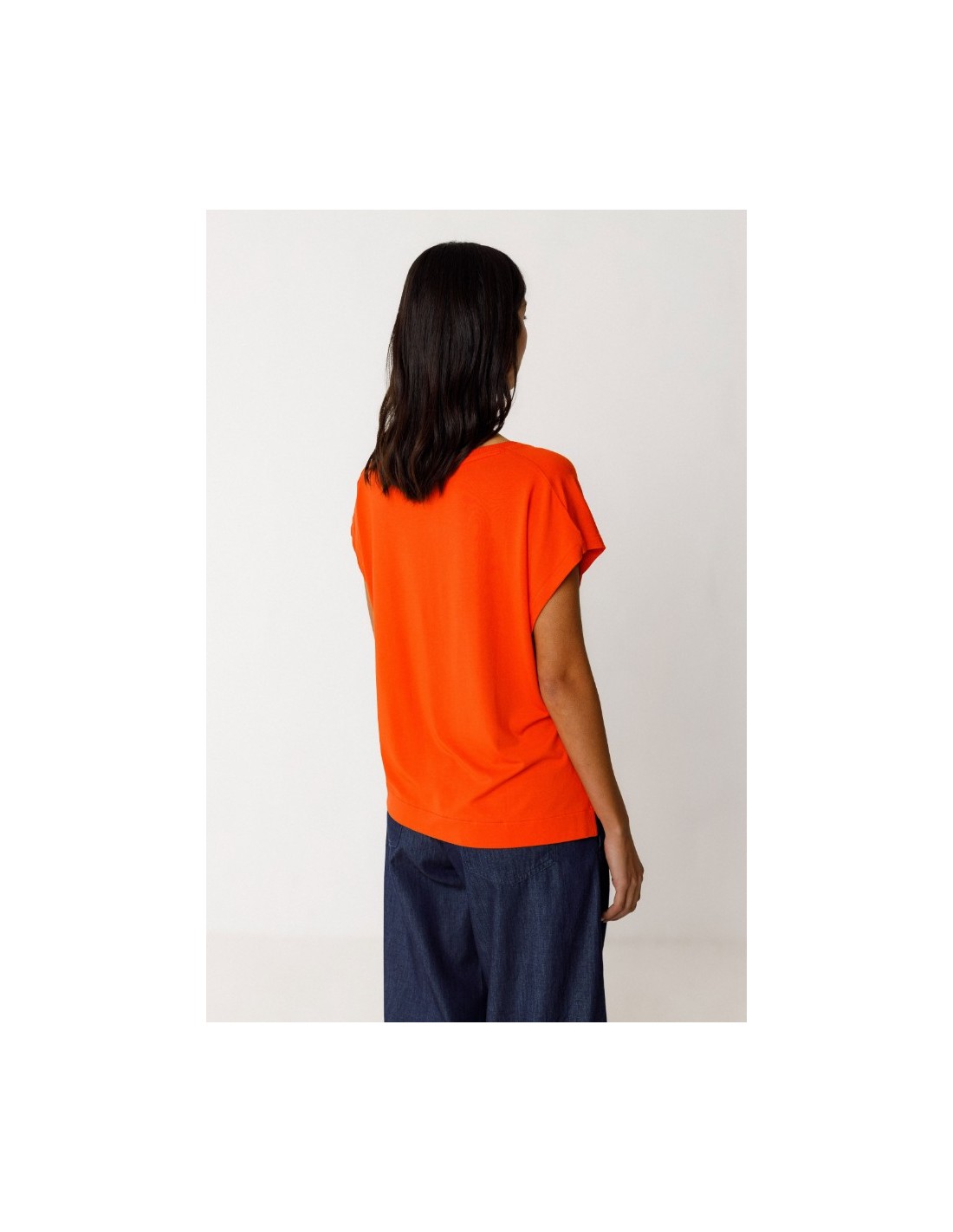 Camiseta holgada de hombros caídos con un pronunciado cuello de pico, adornada con un fino remate de canalé. Se completa con unas aberturas en los laterales. Color naranja.