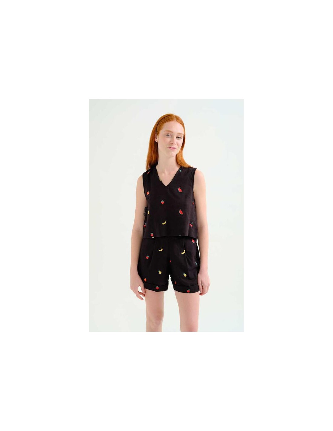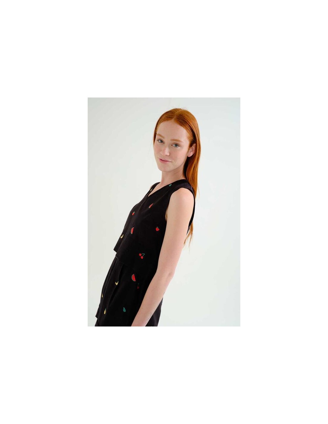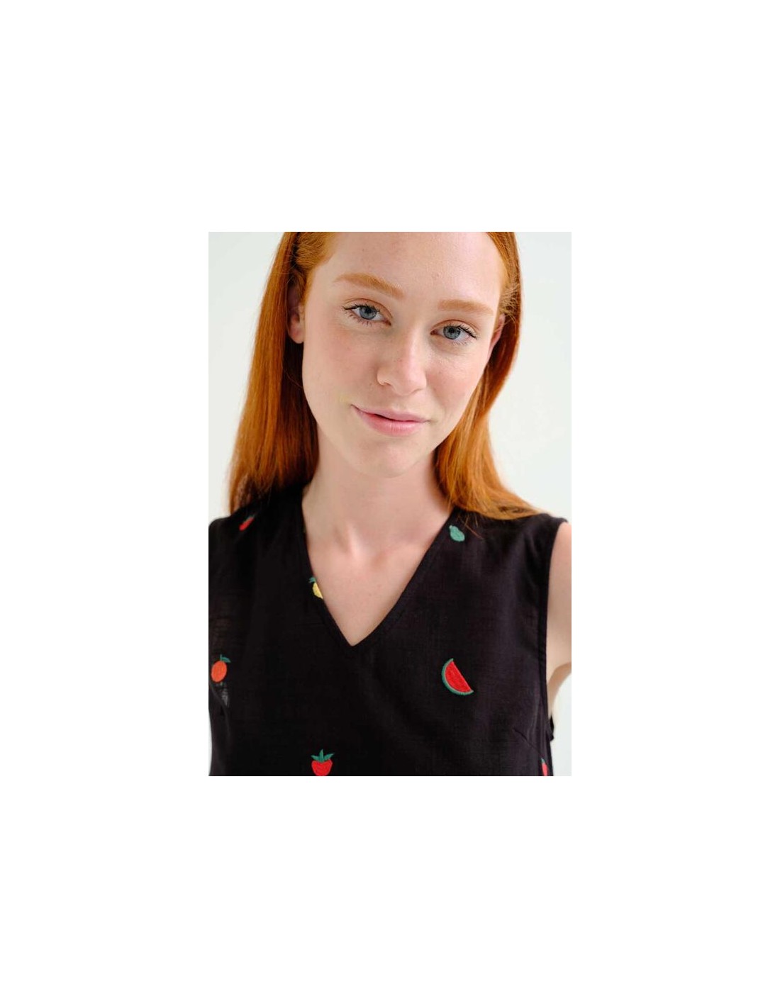 Top de tejido 100% algodón de color negro con bordado de ensalada de frutas. Escote pico y sin mangas. Cierre posterior con botón oculto. La modelo mide 175 cm y lleva la talla S.
