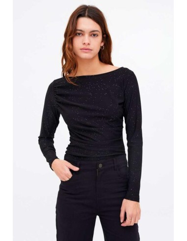 Camiseta de tejido crepé con lurex de color negro. Cuello barco y manga larga. Diseño con ligeros pliegues.