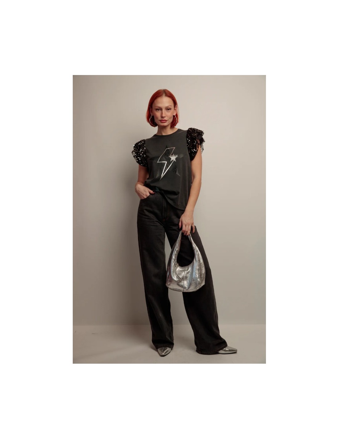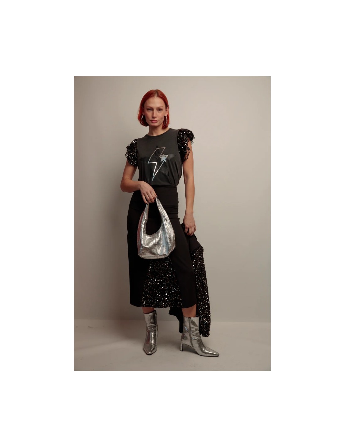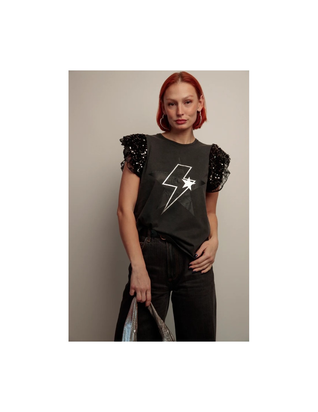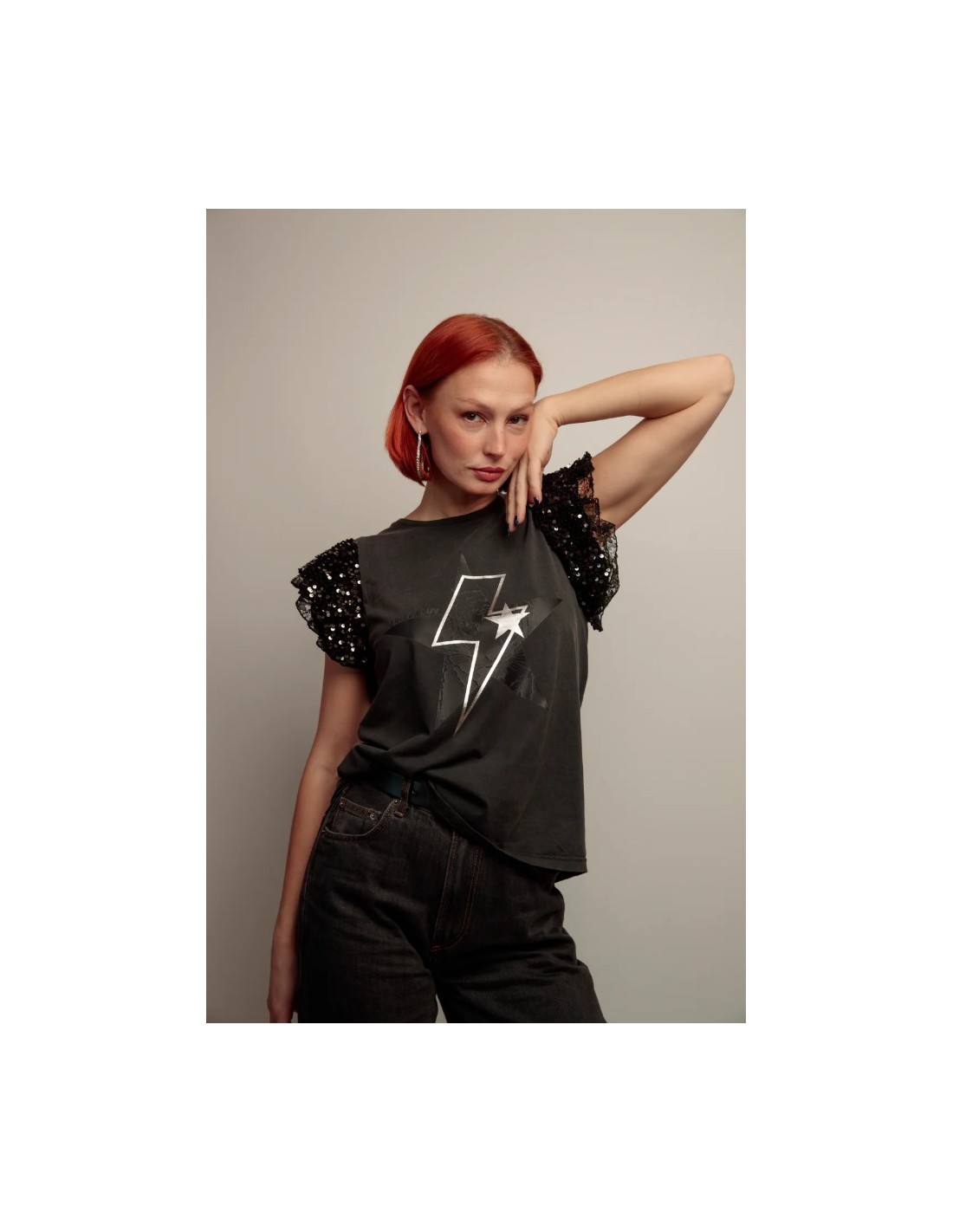 Camiseta de algodón con efecto lavado, cuello redondo, corte evasé y bajo asimétrico. Detalle de manga corta con dos volantes en tejidos combinados, confeccionado en tejido encaje negro y otro de lentejuelas. Estampación frontal.