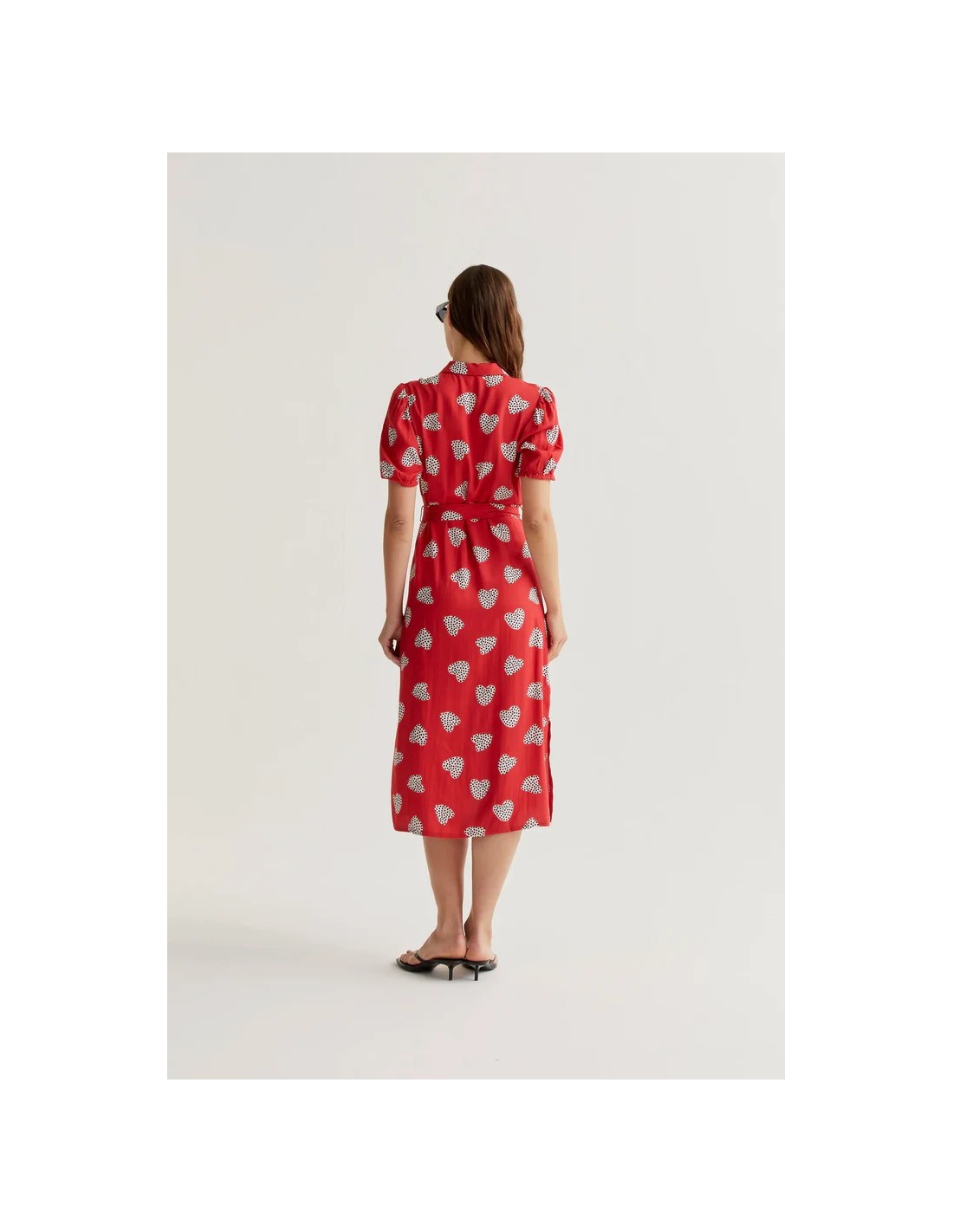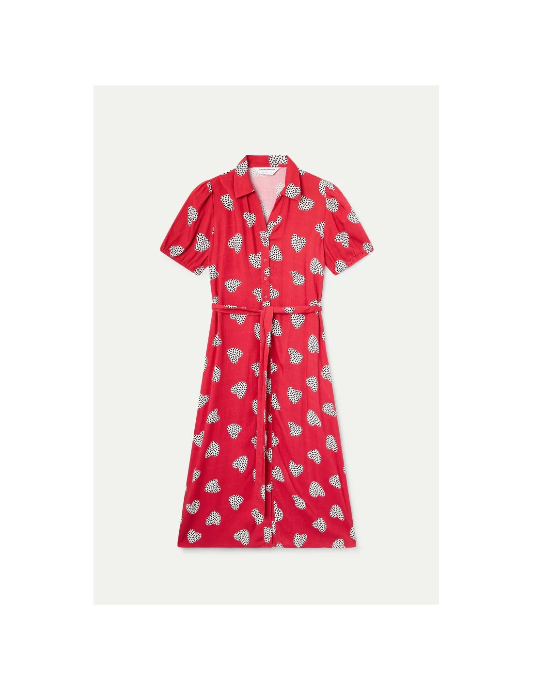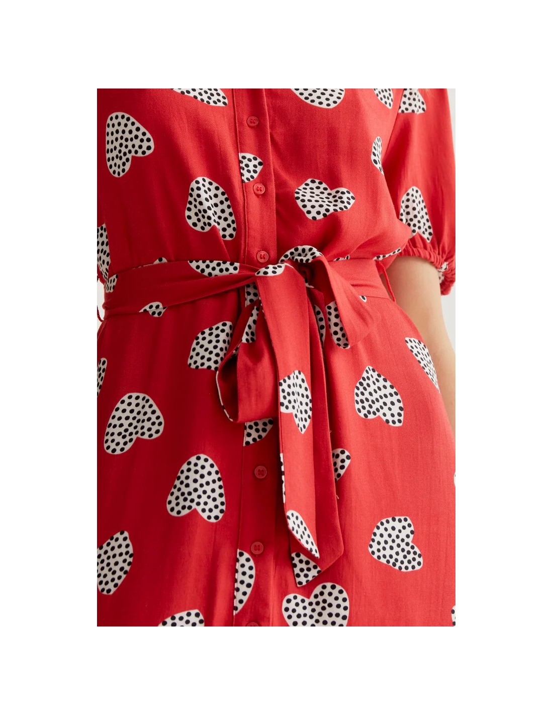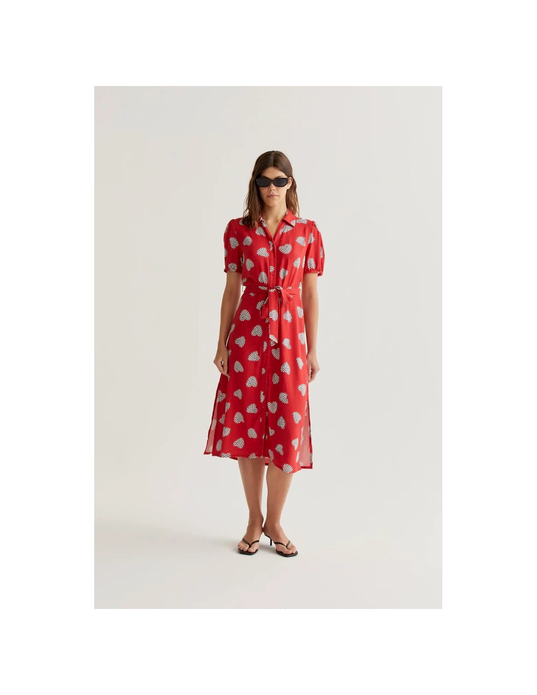 Vestido midi con estampado harmony red. Cuello solapa y manga corta ligeramente abullonada. Cierre frontal con botones de color rojo. Detalle de cintura lazada. La modelo mide 177 cm y lleva la talla S.