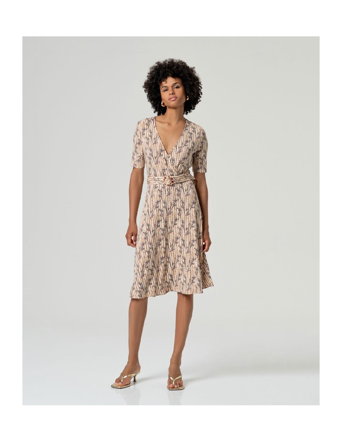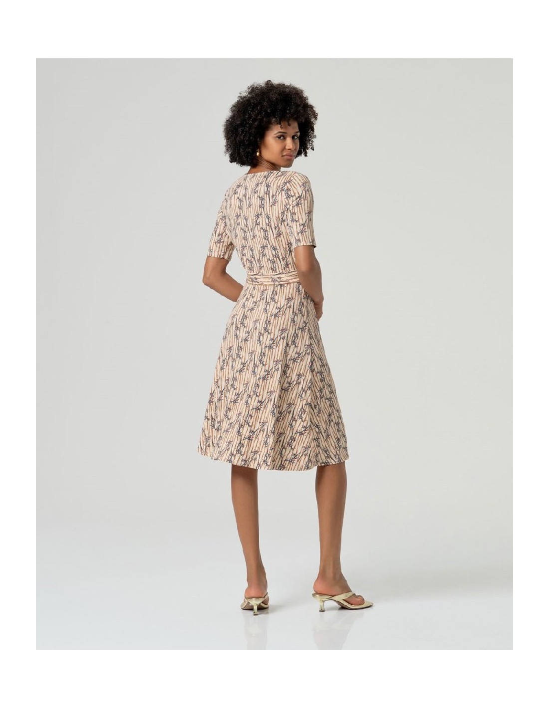 Vestido midi con escote en pico y manga corta. Diseño de silueta evasé con cinturón de hebilla circular a tono. Estampado de rayas y motivos florales sobre tejido de punto elástico. Confeccionado en mezcla de viscosa sostenible EcoVero y elastano con caída.
