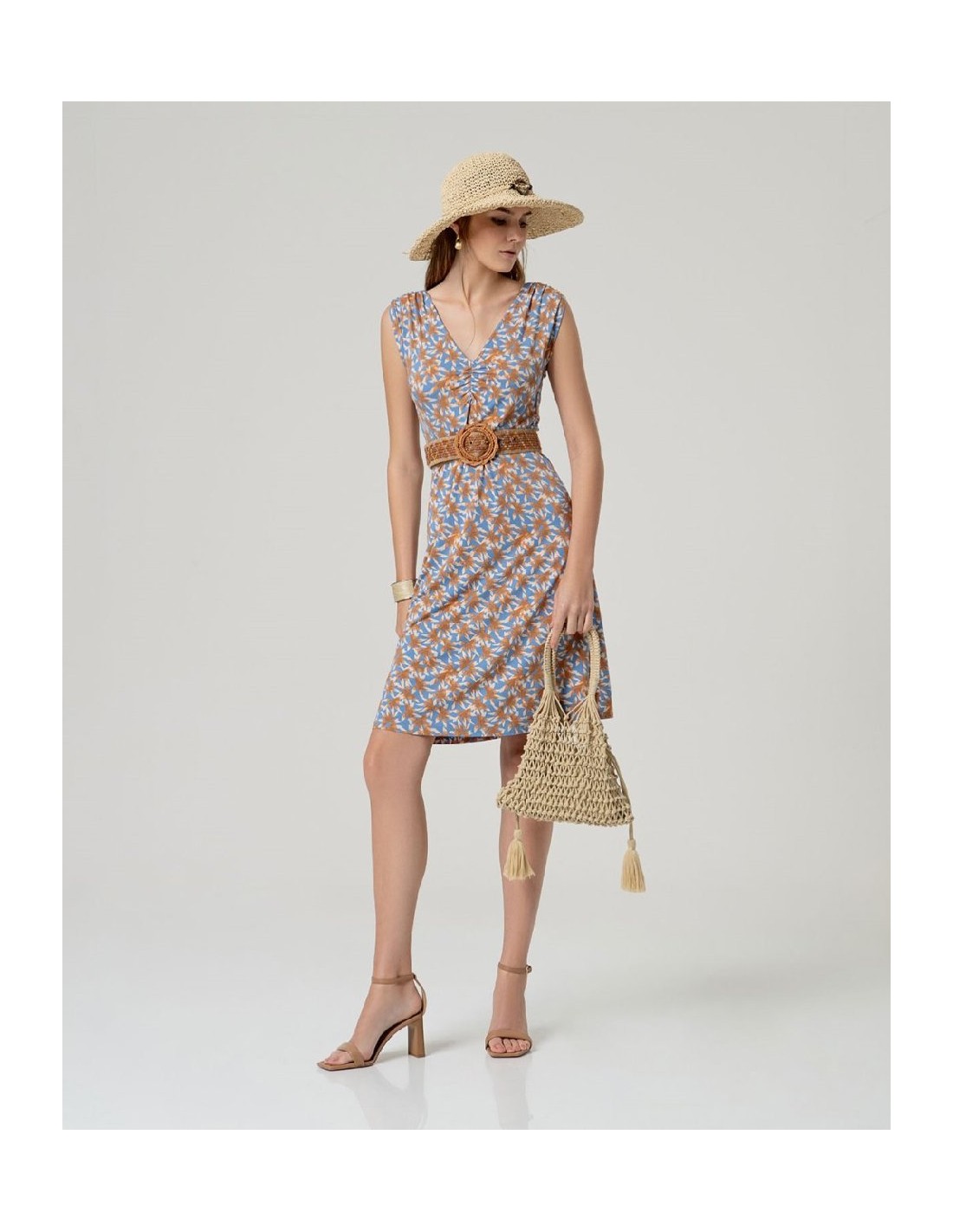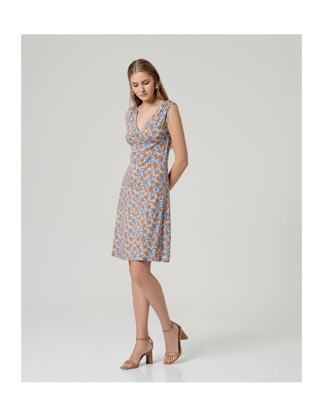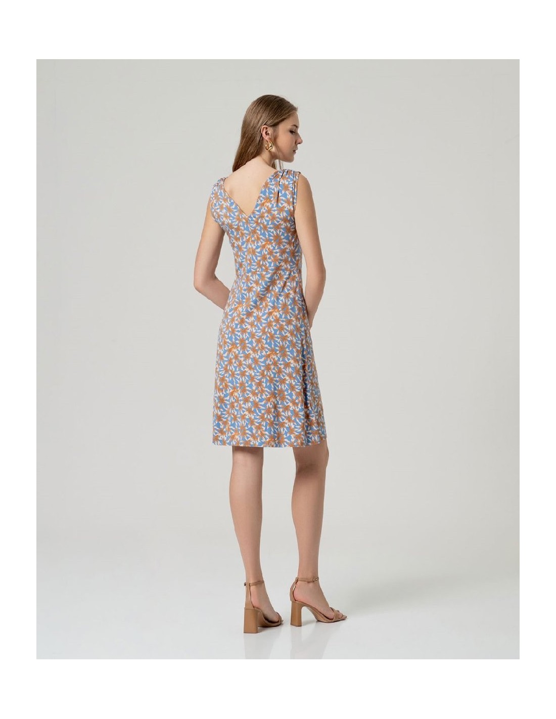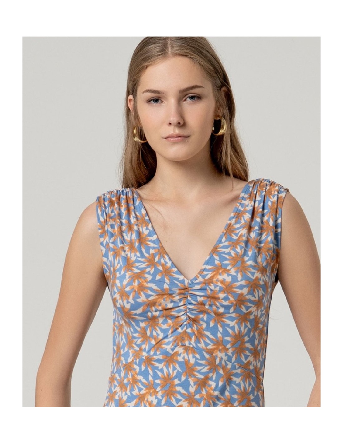 Vestido corto estampado sin mangas con detalle fruncido en hombros y escote redondo. Presenta corte recto con largo por encima de la rodilla y bajo recto. Diseño integral estampado. Confeccionado en aloe vera y elastano. Vestido estampado sin mangas aloe