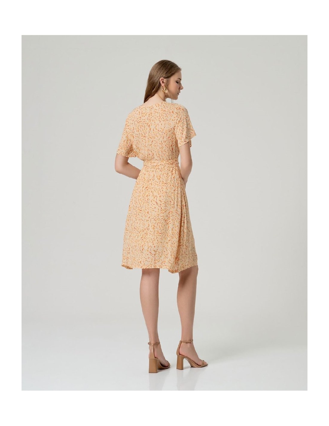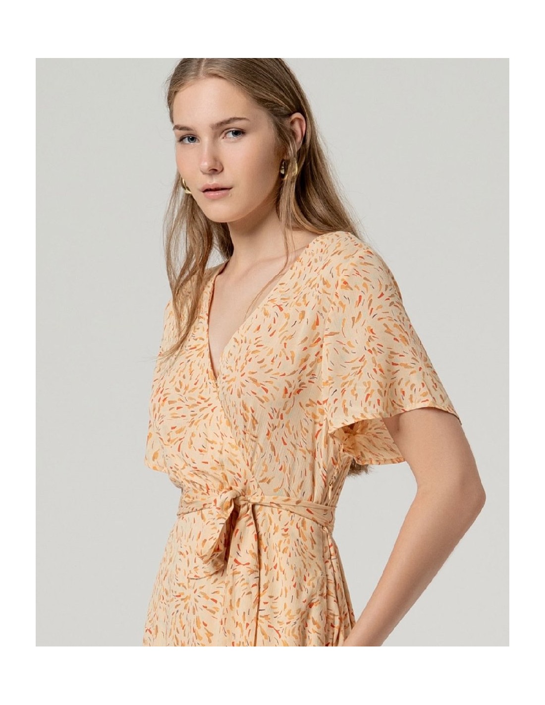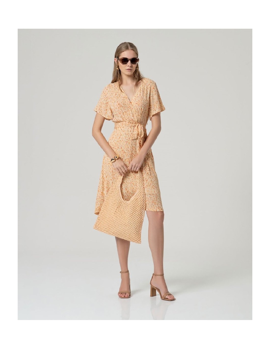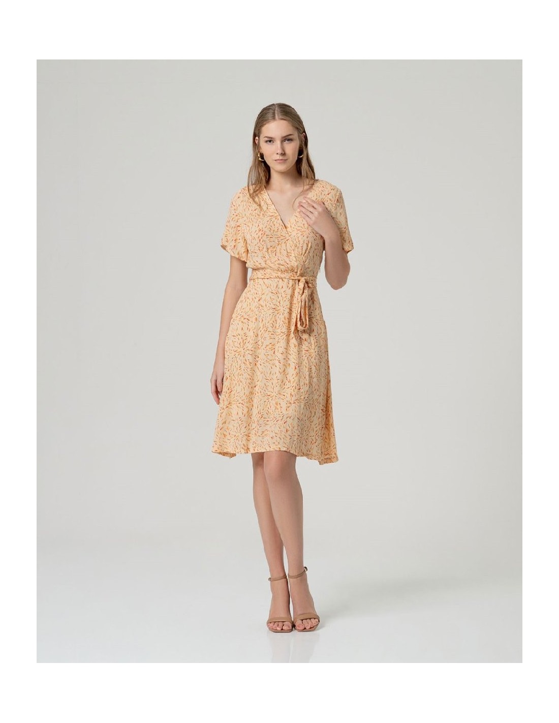 Vestido midi estampado con escote cruzado y manga corta amplia. Presenta cinturón del mismo tejido para ajustar en cintura y falda de largo midi con bajo recto. Vestido midi estampado escote cruzado