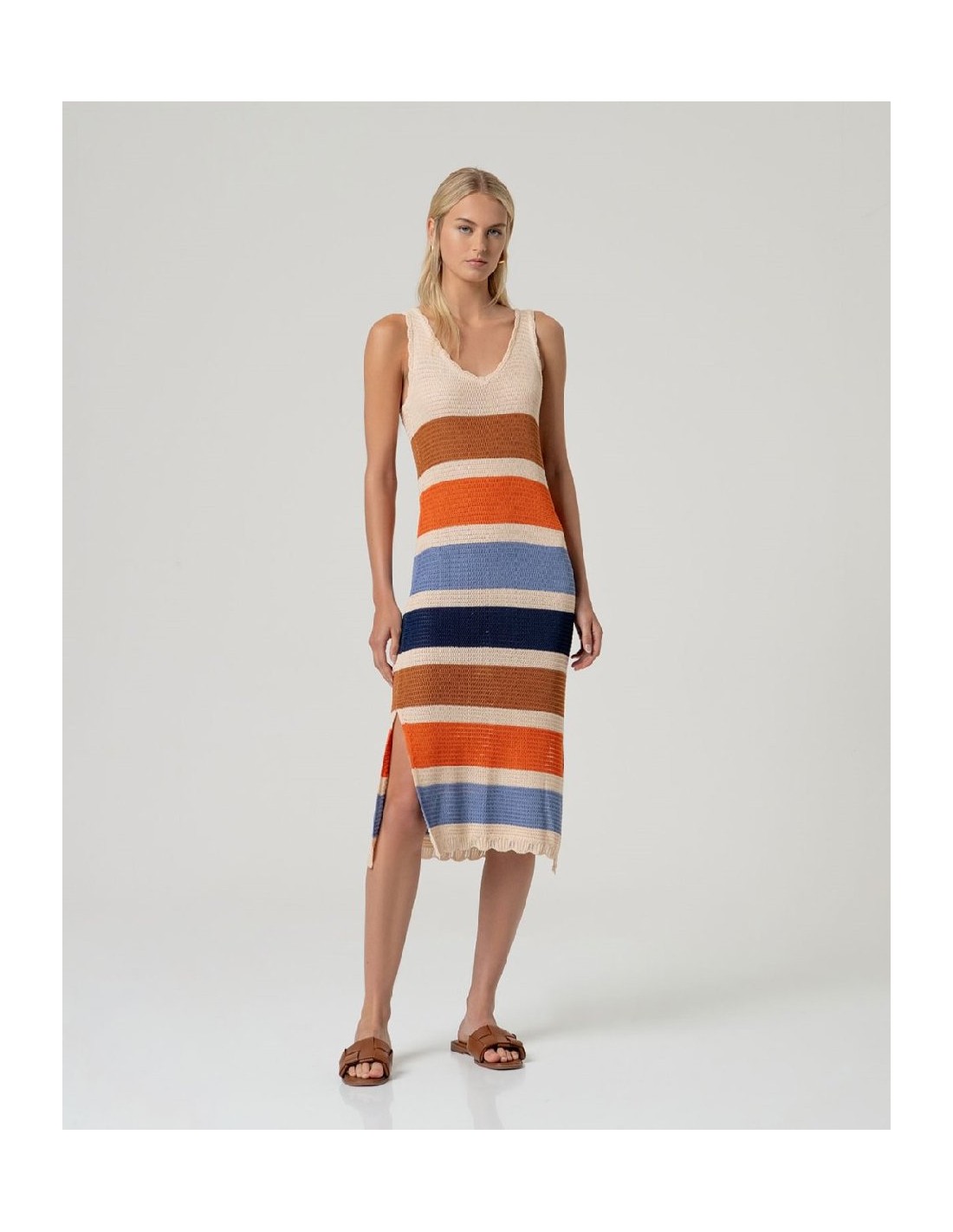 Vestido largo de tirantes en punto con escote pico delantero y espalda en pico. Diseño listado en contraste y silueta recta ligeramente ajustada al cuerpo. Presenta aberturas laterales y acabado inferior con detalle desflecado. Vestido largo punto listado