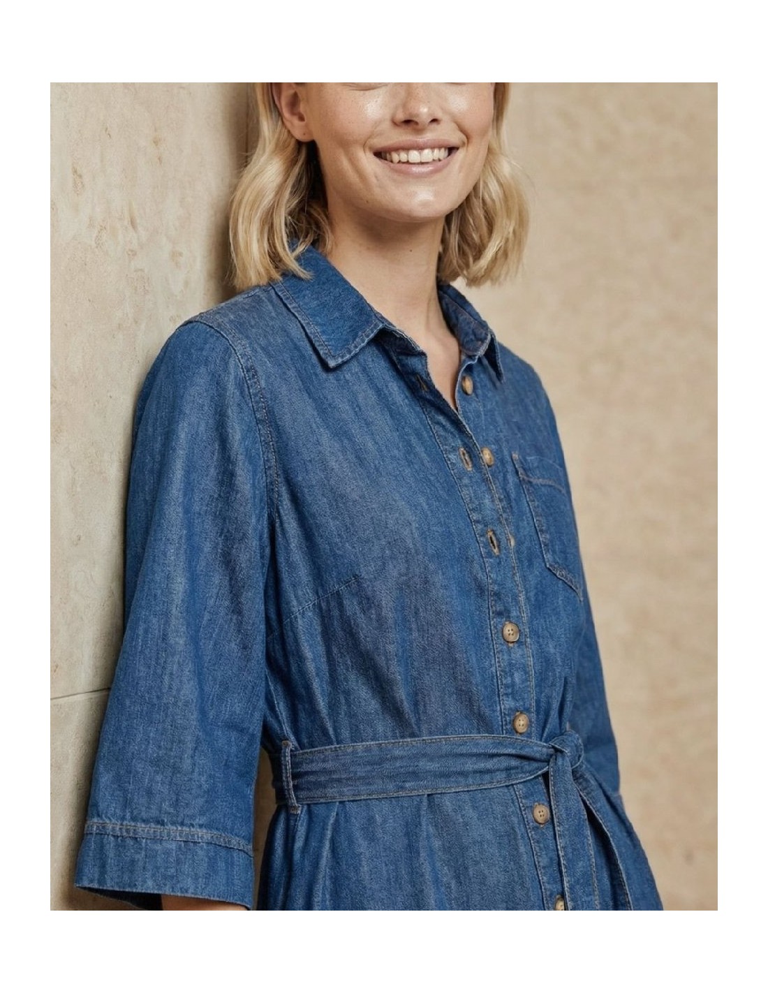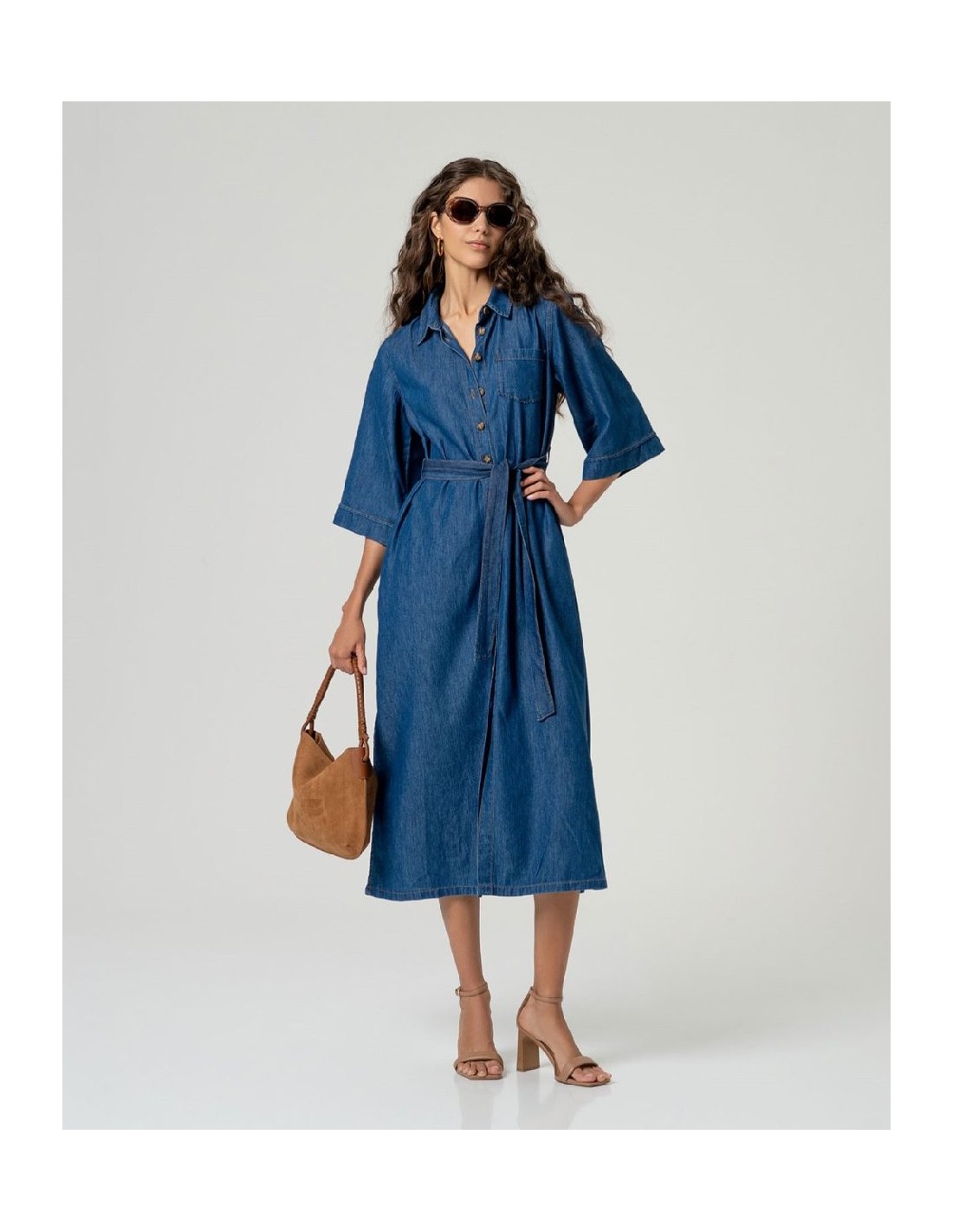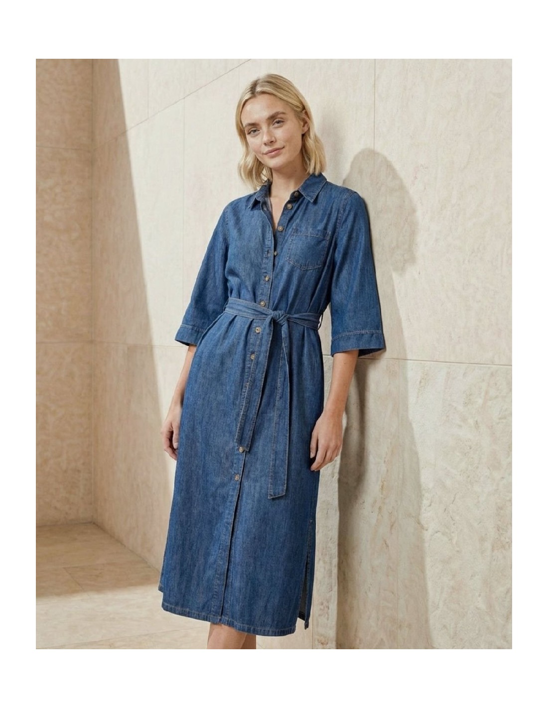 Vestido camisero largo con cuello clásico y cierre frontal de botones. Manga amplia hasta el codo, cinturón del mismo tejido y abertura frontal en el bajo. Confeccionado en denim ligero con algodón y lyocell. Vestido camisero denim con cinturón.